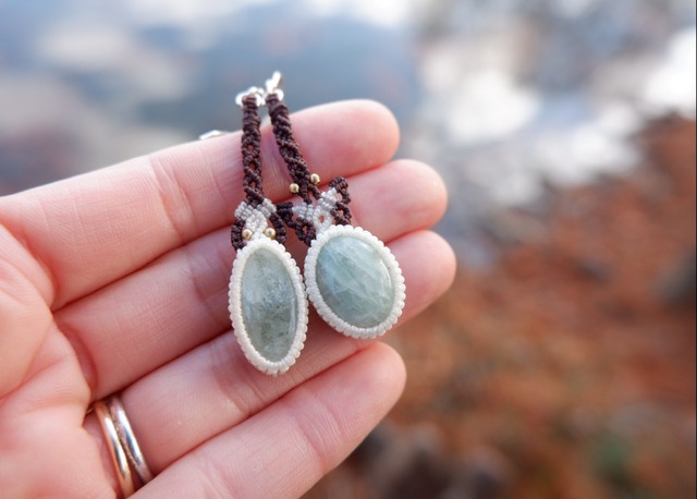 マクラメ編みでイヤリングに仕立てました。 素材 ニッケルシルバー( 銅とニッケル 亜鉛の合金 ) ポイントに真鍮ビーズを使用しています。 大きさ 約3cm×7cm ピアス部分は300円でシルバー925に変更可能です。 ご注文前にメッセージでお知らせください。