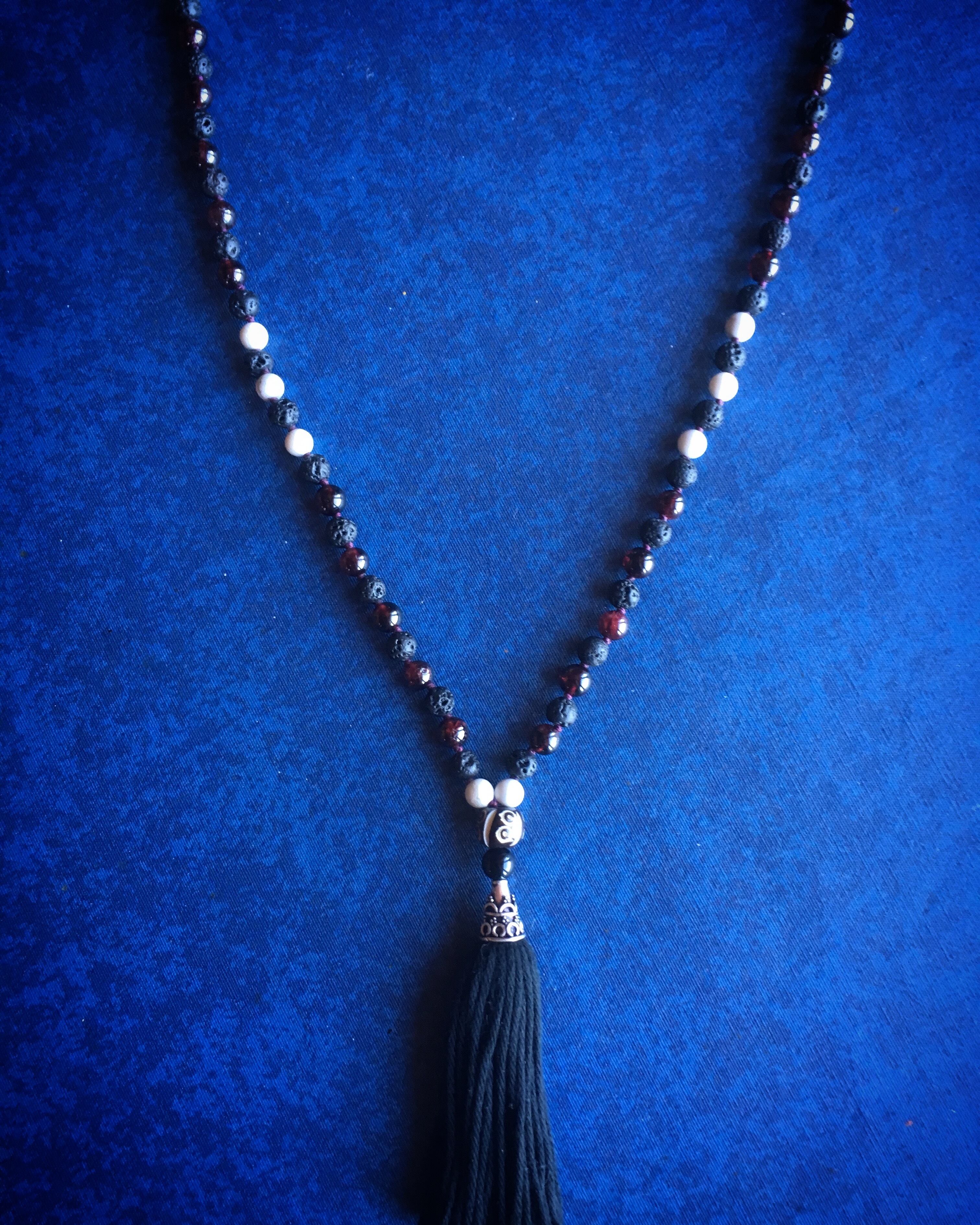 深い上品な紅色が美しいガーネット、火山で生成される漆黒のユニークな形のラヴァストーン、無垢の白いハウライトの組み合わせのジャパマラです。