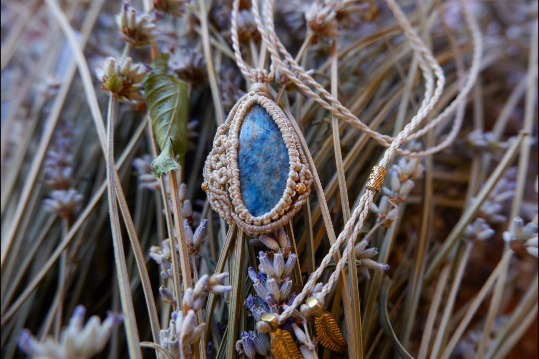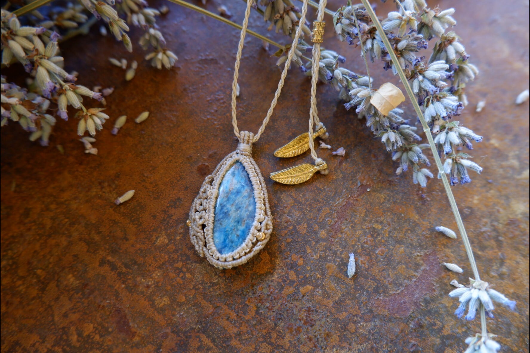 紐と石の周りはオフホワイトの糸、それを真鍮ビーズで装飾しています。