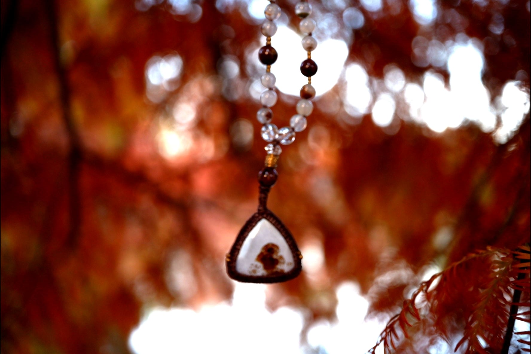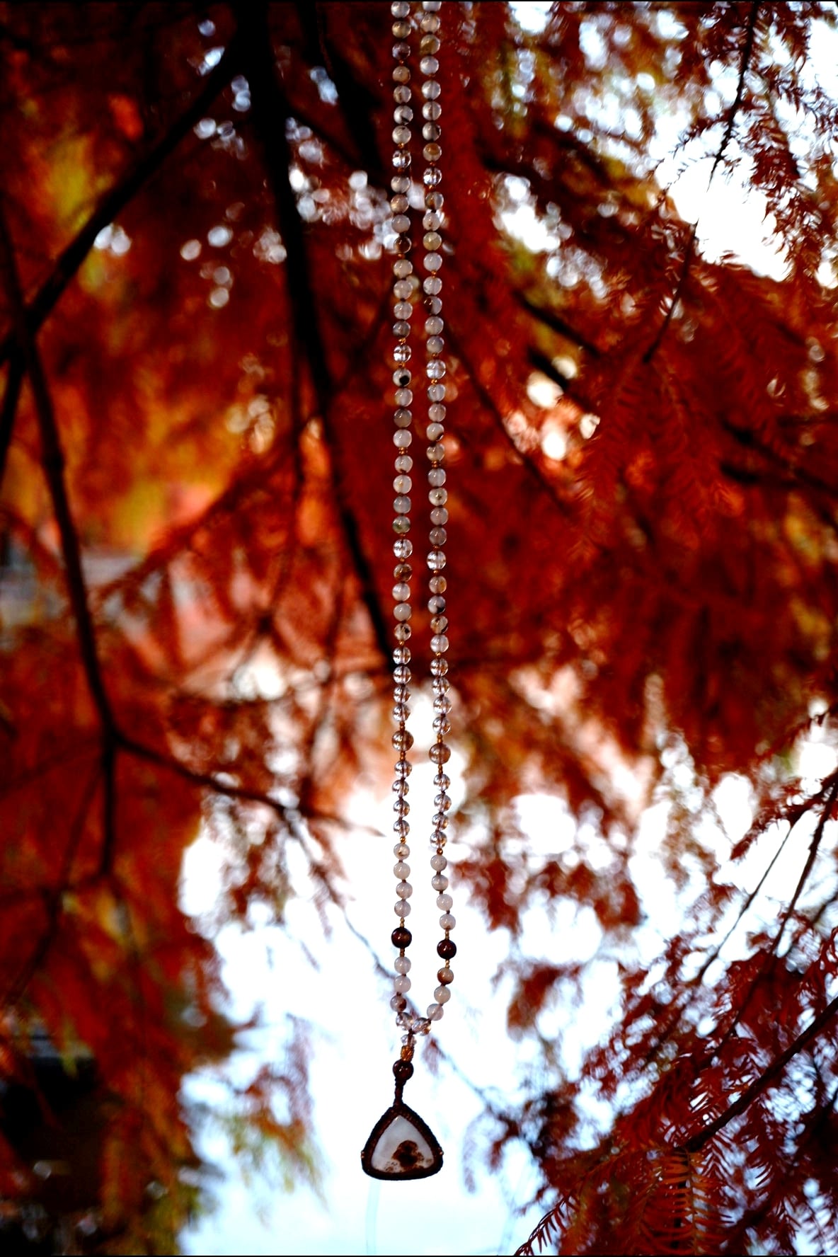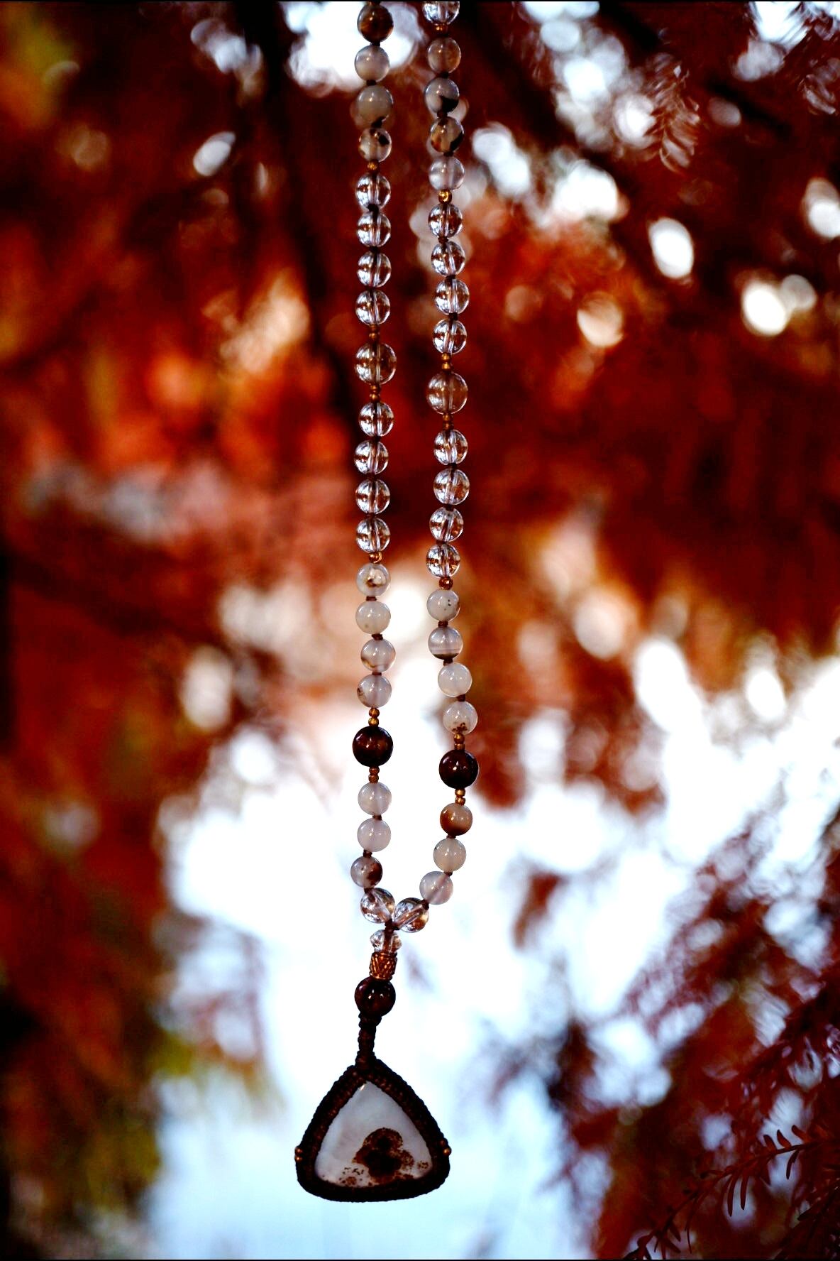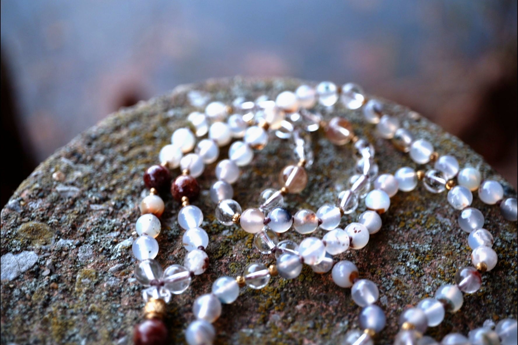 108粒からなる、ジャパマラ。たくさんのビーズの中から一粒ずつ丁寧に選んで作っています。108の半分、54番目と55番目の間には真鍮チャームを使用し、ジャパが半分のところにきたことを指で感じられるようになっています。ひとつビーズを通して、ひとつ結び目を作る。マラを繰っていくとき、ビーズとビーズの間、この結び目に瞑想が起こる、と言われています。蝋引き糸を使って丈夫に仕上げています。瞑想用でも、またお出かけようでも、お好きな用途でおつかい頂けたらなと思っています。世界にひとつしかないあなただけのジャパマラです。