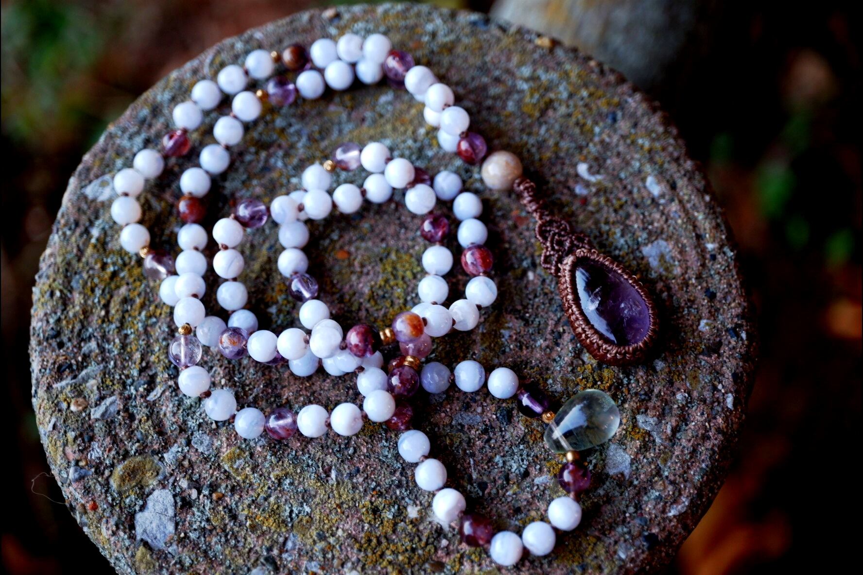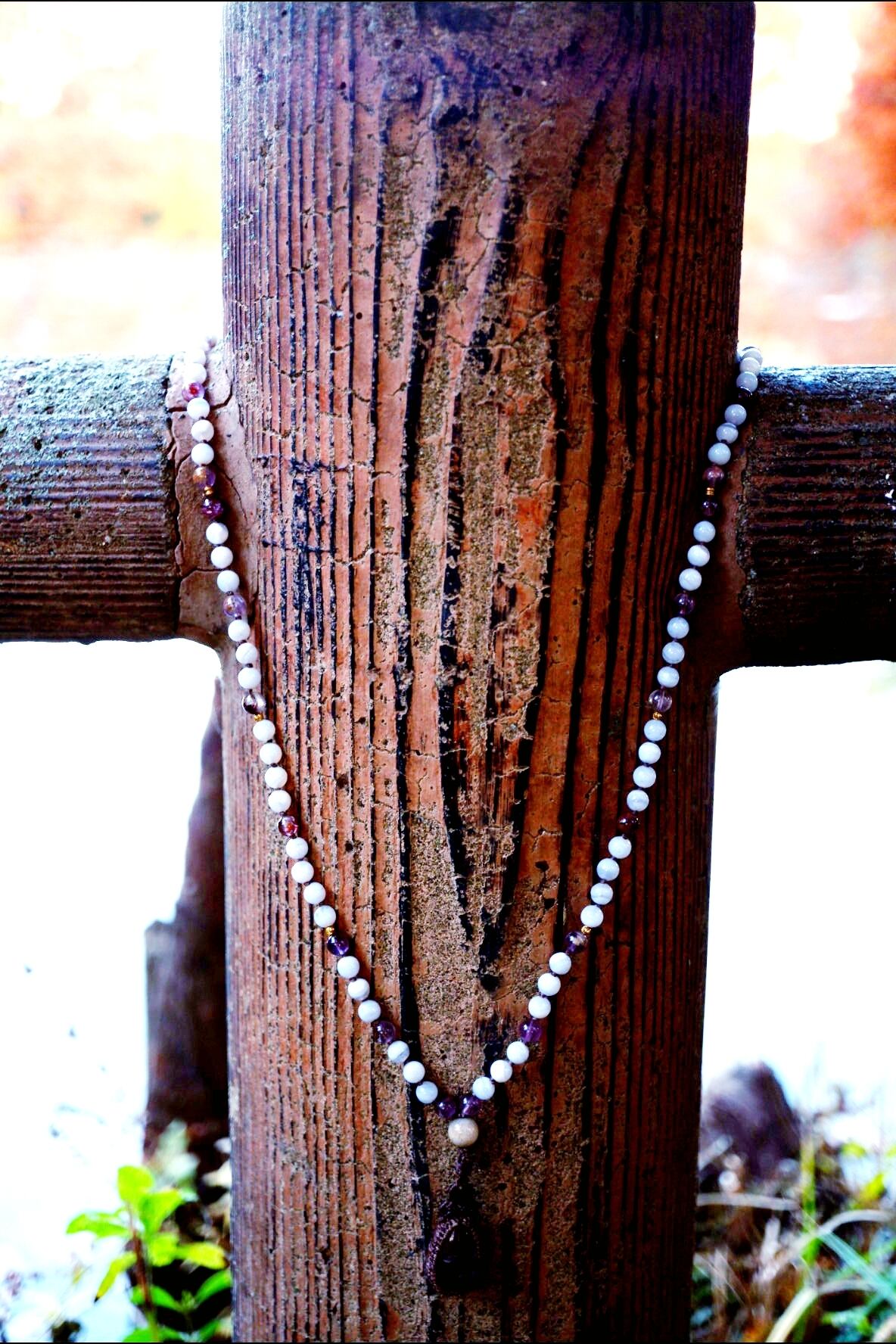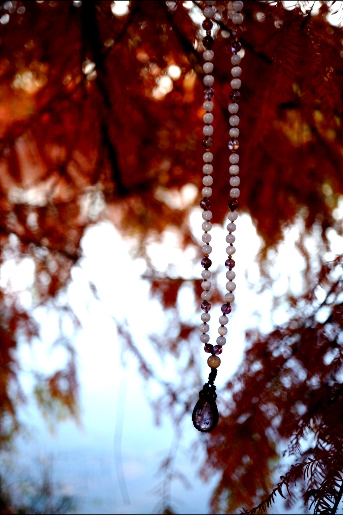 108粒からなる、ジャパマラ。たくさんのビーズの中から一粒ずつ丁寧に選んで作っています。108の半分、54番目と55番目の間には真鍮チャームを使用し、ジャパが半分のところにきたことを指で感じられるようになっています。ひとつビーズを通して、ひとつ結び目を作る。マラを繰っていくとき、ビーズとビーズの間、この結び目に瞑想が起こる、と言われています。蝋引き糸を使って丈夫に仕上げています。瞑想用でも、またお出かけようでも、お好きな用途でおつかい頂けたらなと思っています。世界にひとつしかないあなただけのジャパマラです。
