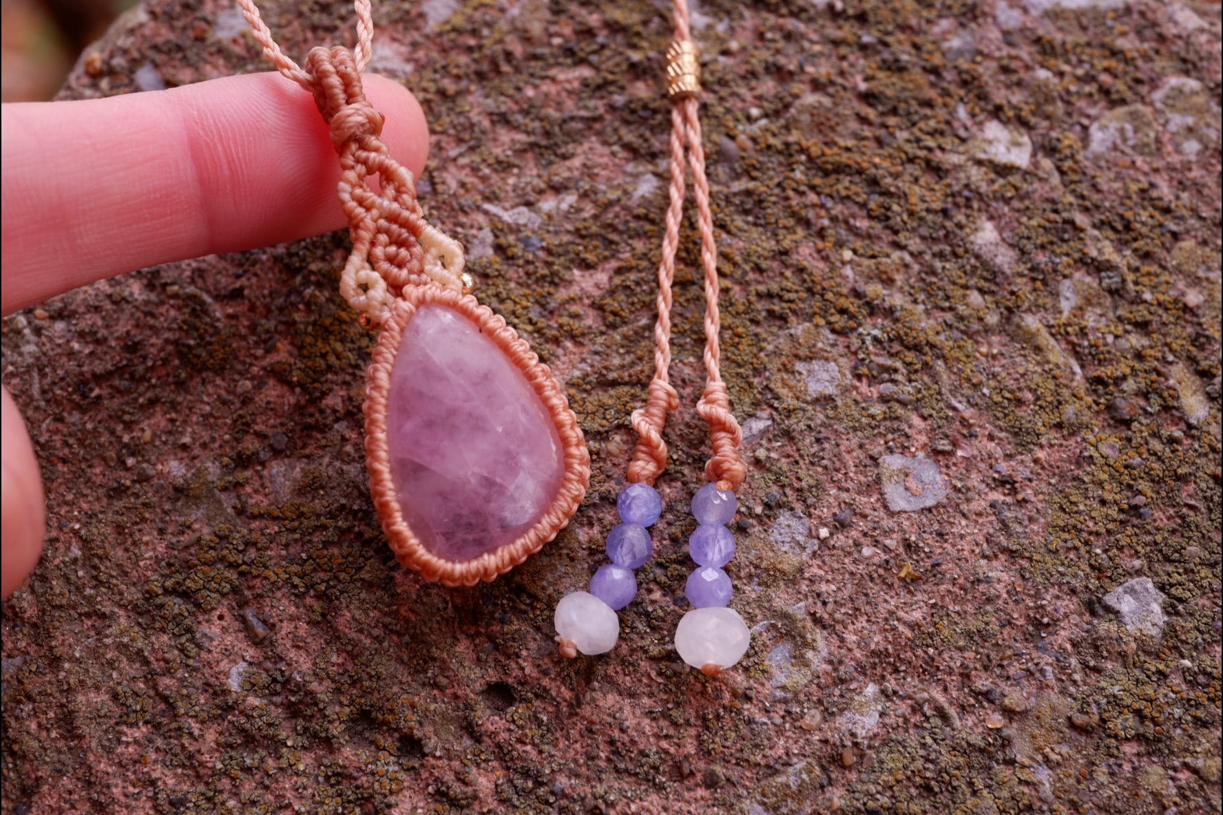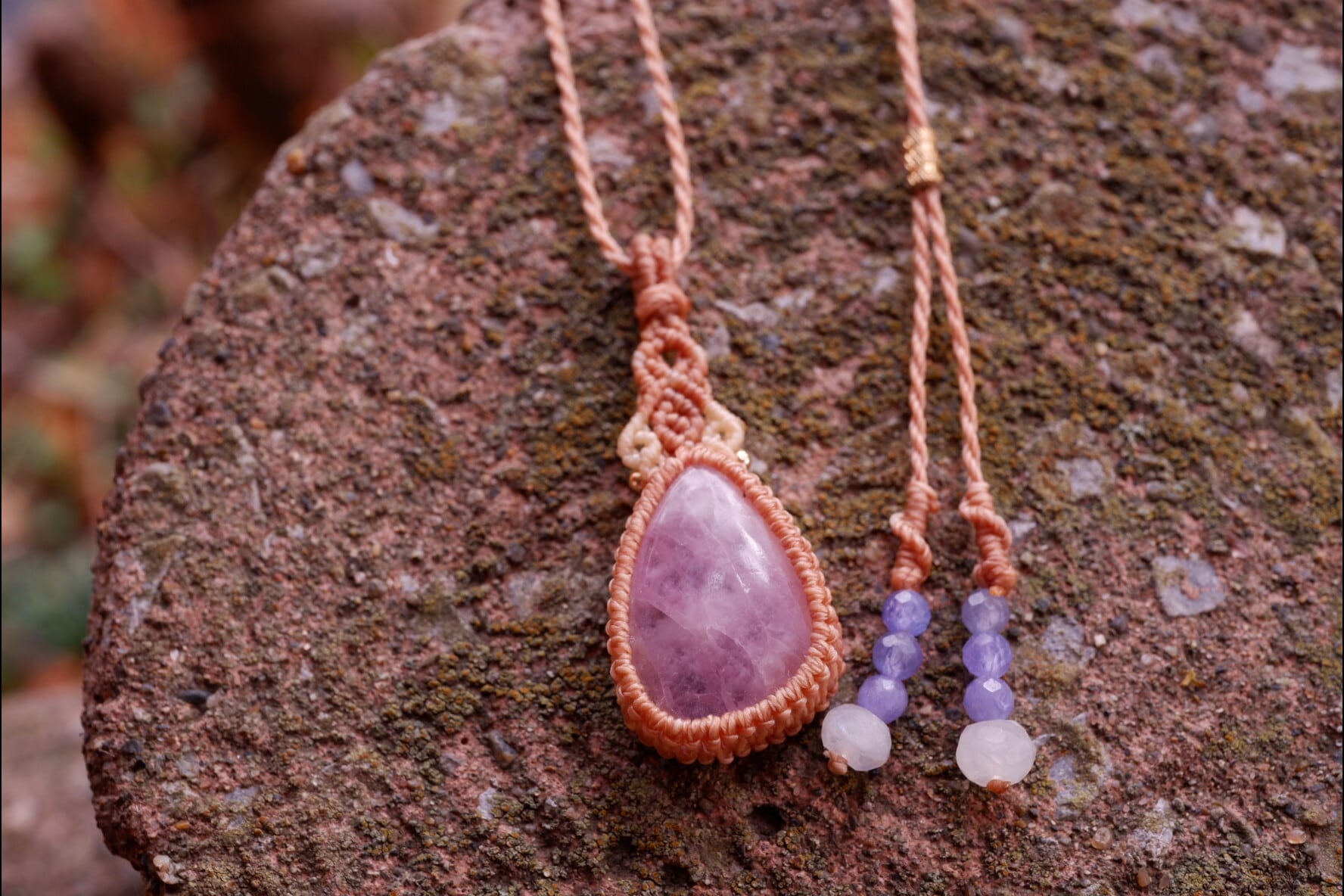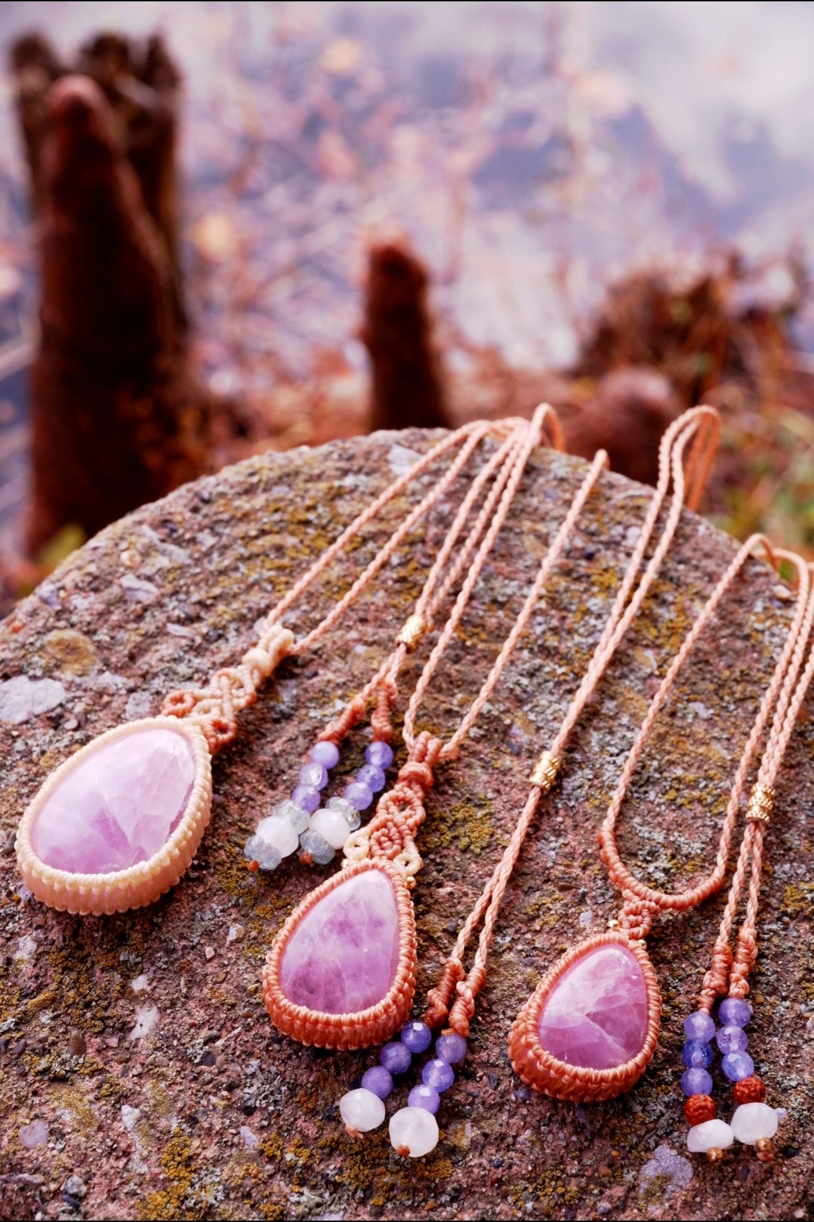 とっておきの宝物箱の中にあるキラキラの宝石たちをイメージして編んだクンツァイトのマクラメネックレス。上品なライラックピンクが美しい、スペシャルなクンツァイトです。