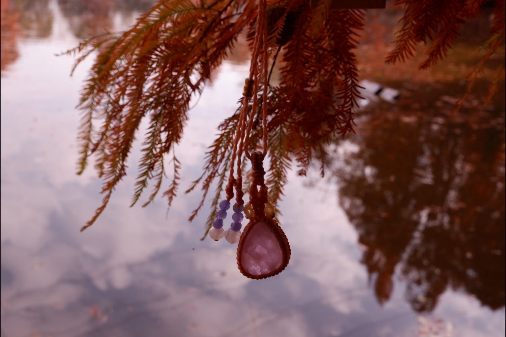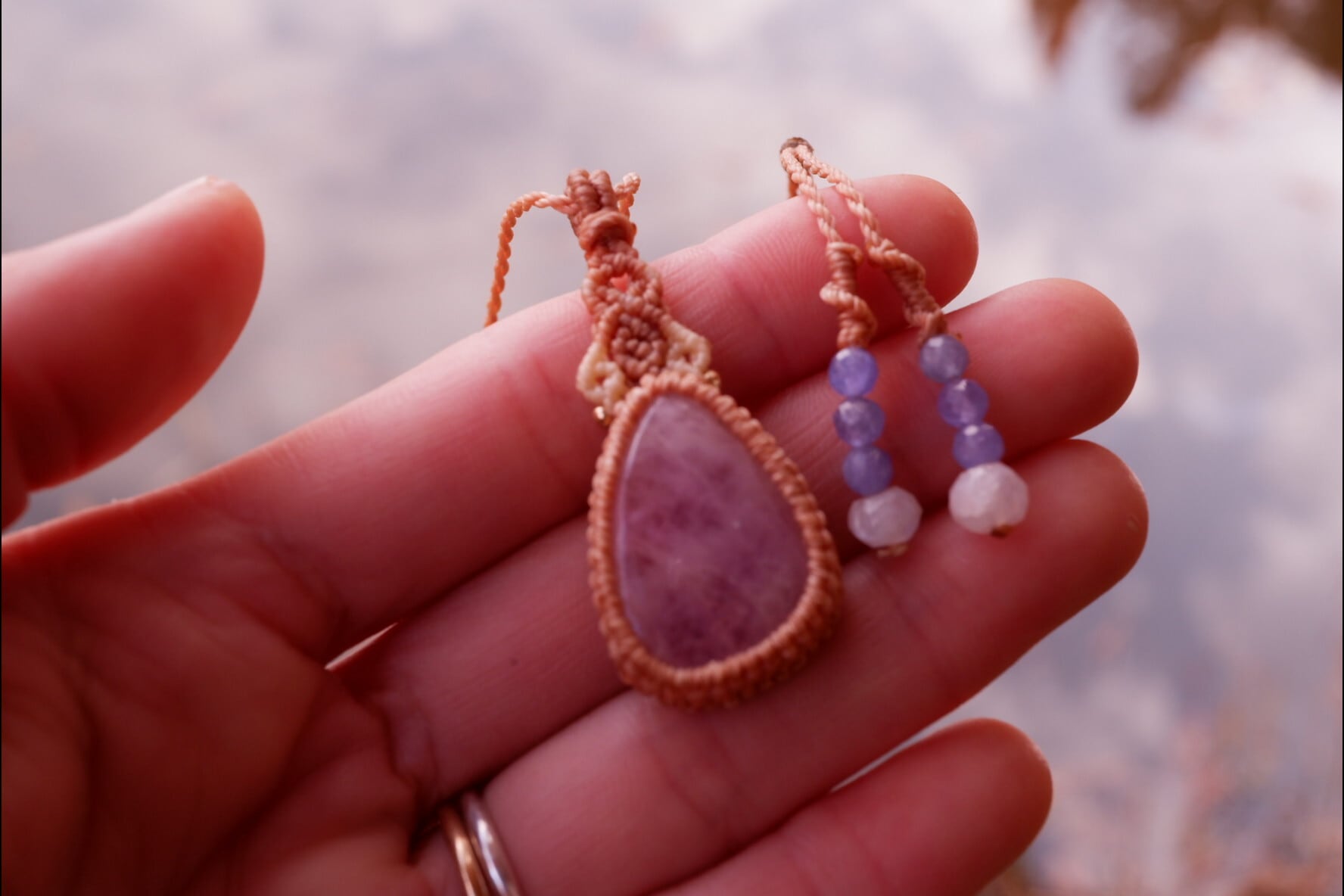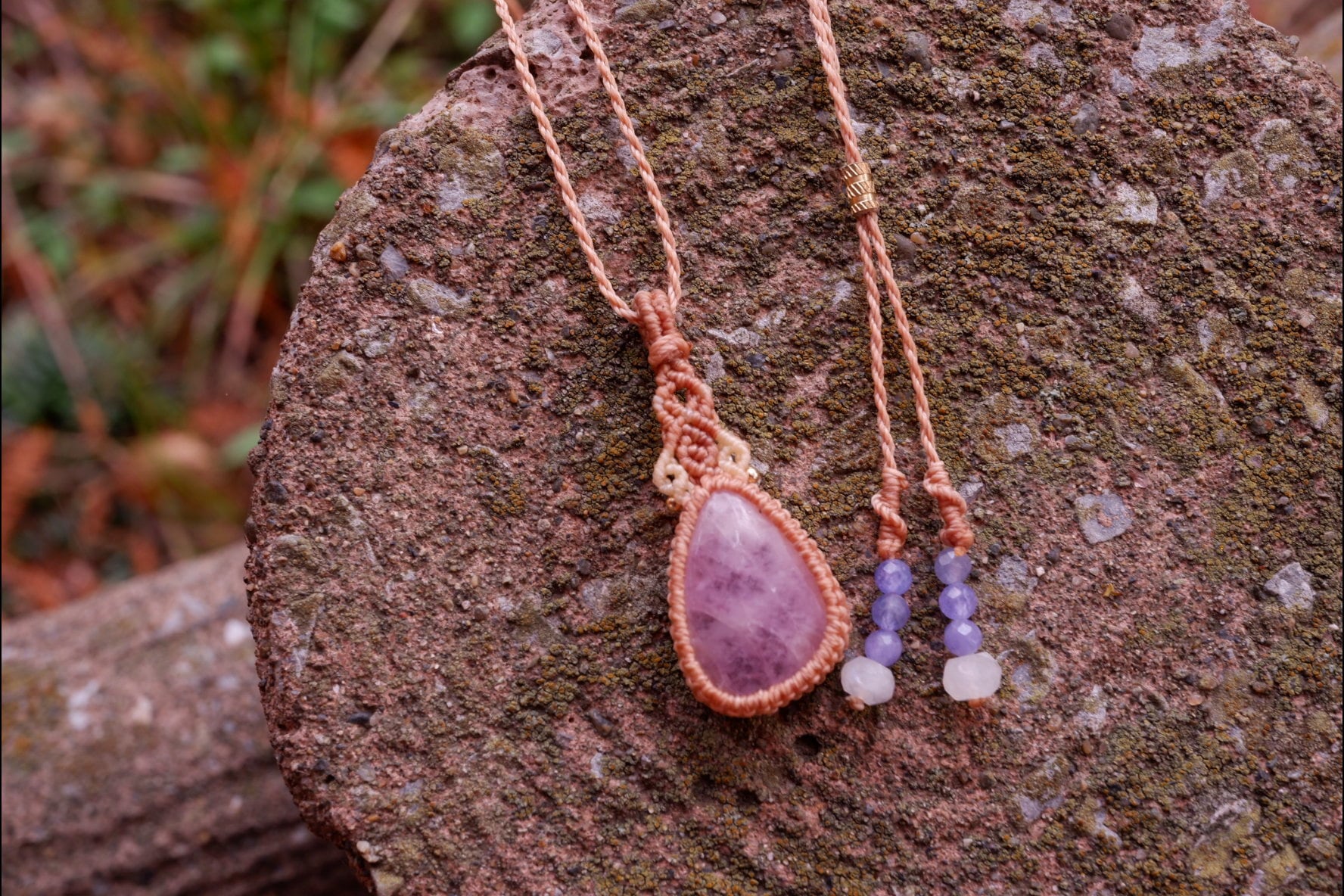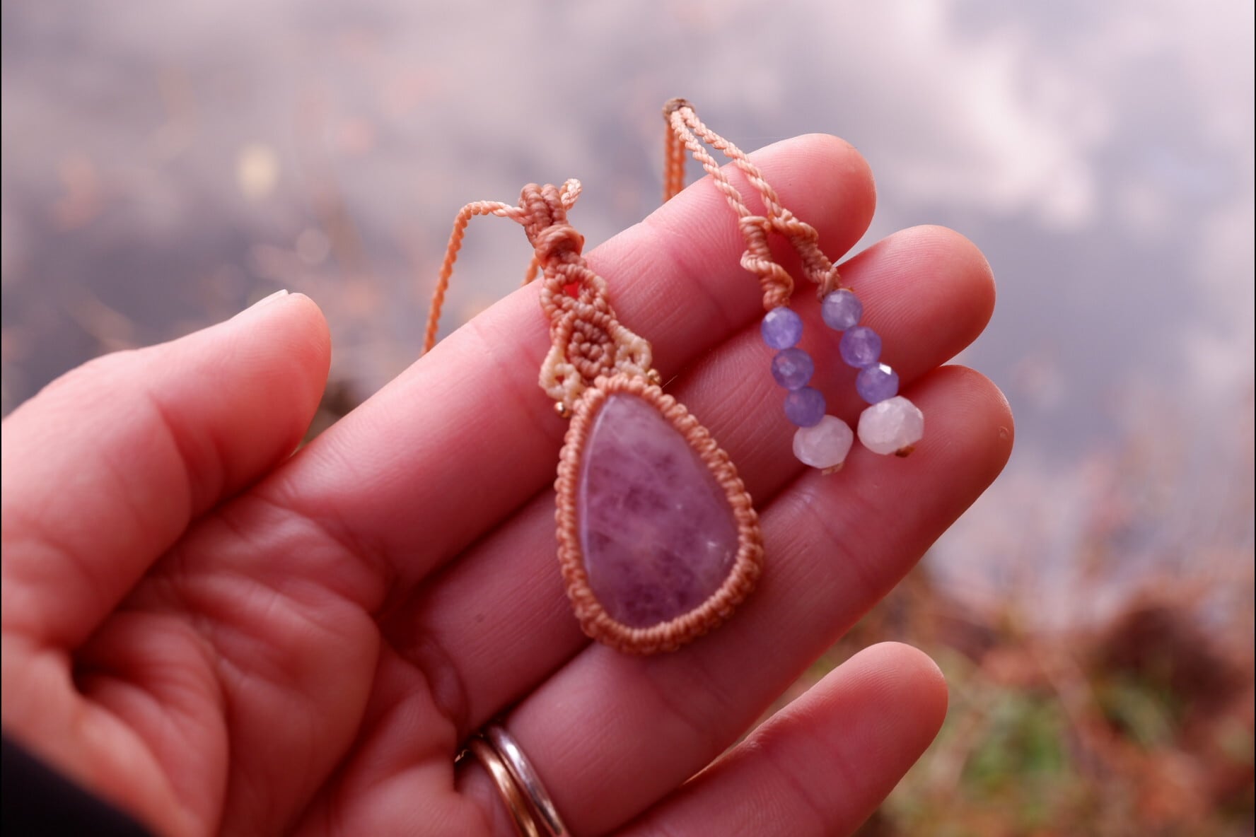 とっておきの宝物箱の中にあるキラキラの宝石たちをイメージして編んだクンツァイトのマクラメネックレス。上品なライラックピンクが美しい、スペシャルなクンツァイトです。