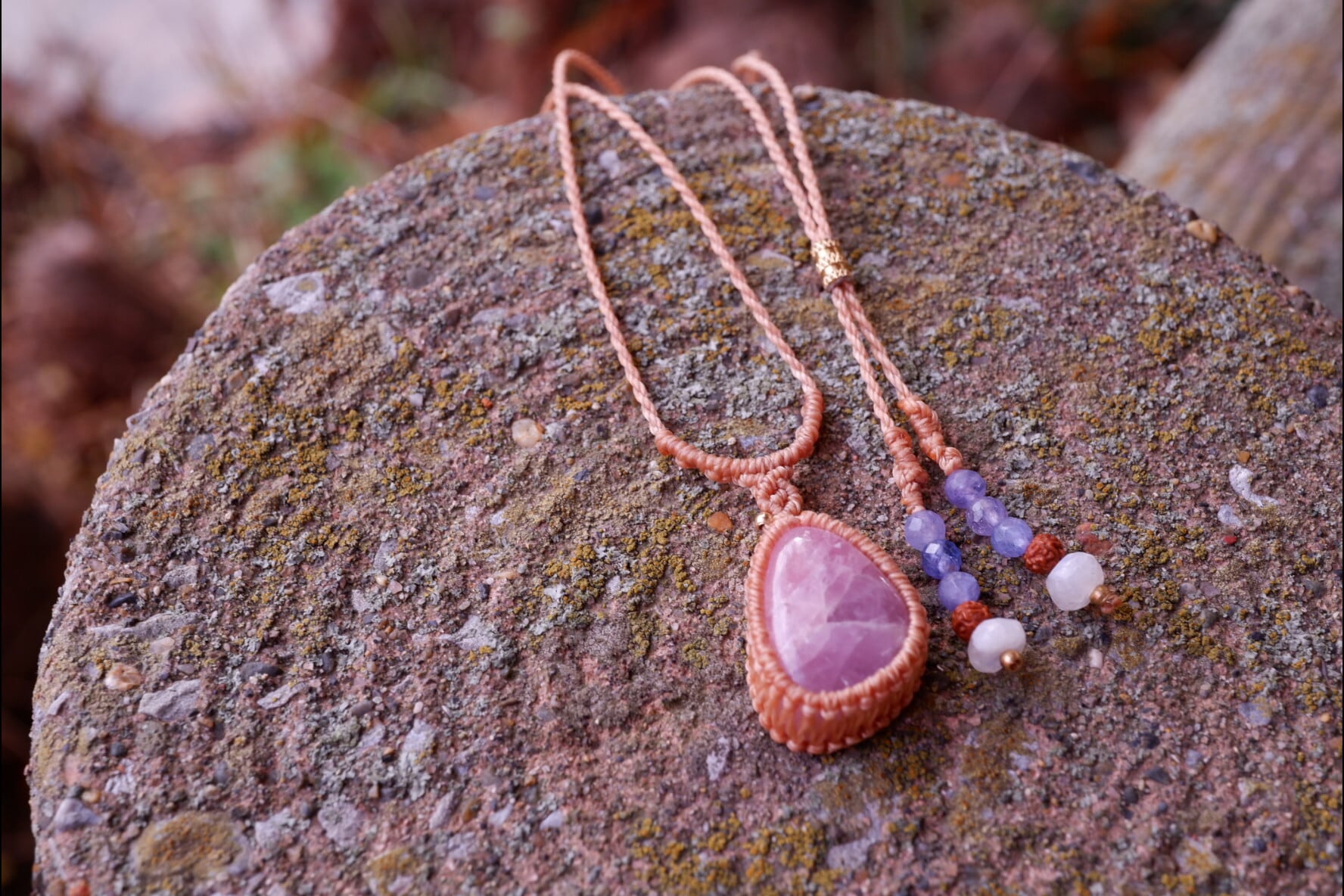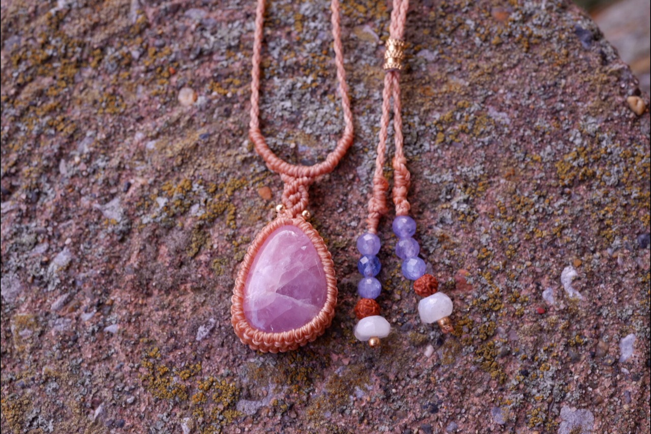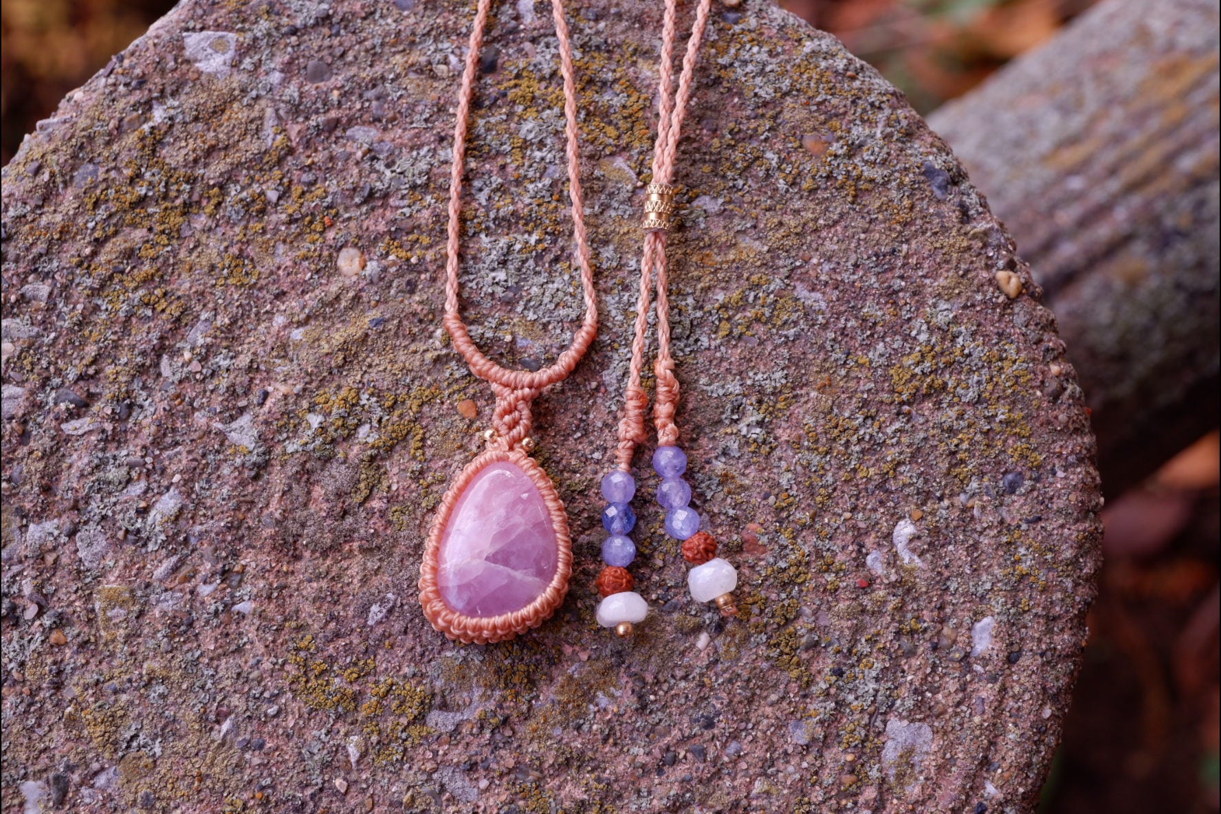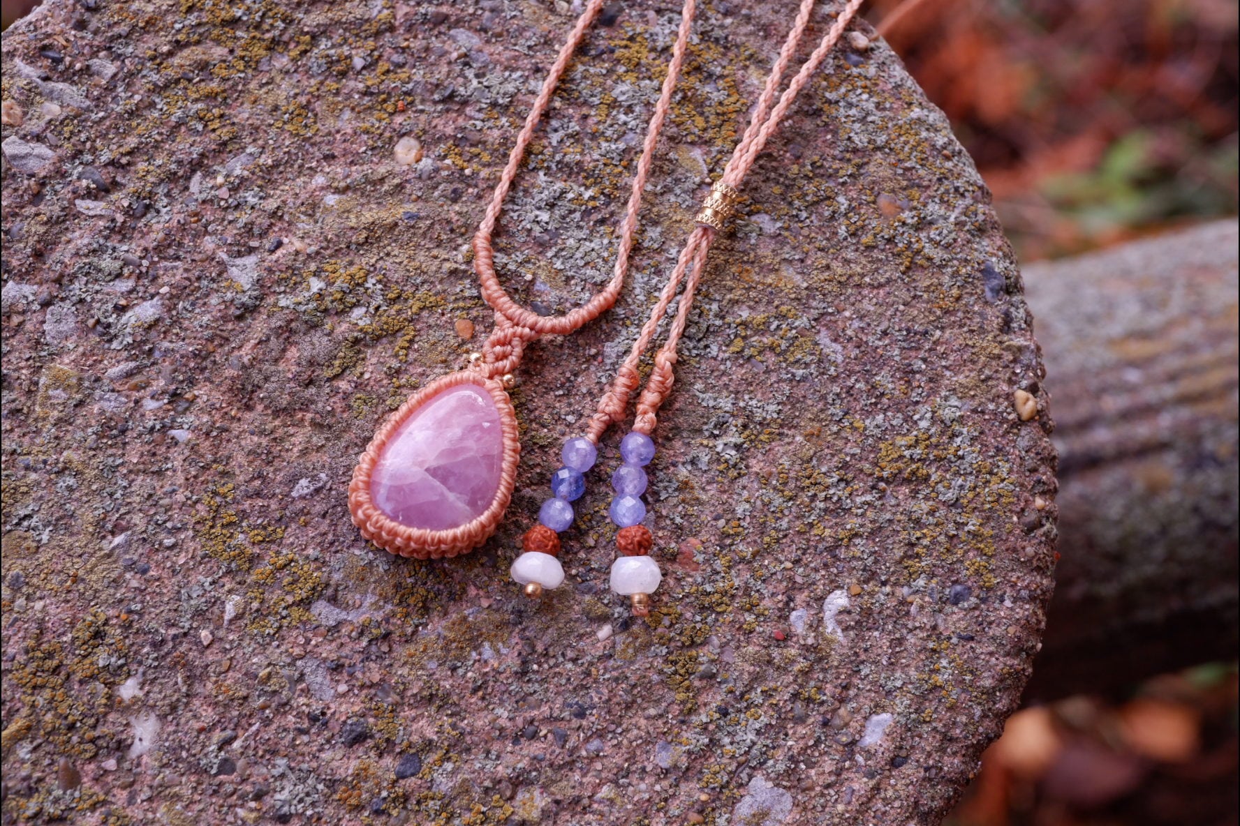 とっておきの宝物箱の中にあるキラキラの宝石たちをイメージして編んだクンツァイトのマクラメネックレス。上品なライラックピンクが美しい、スペシャルなクンツァイトです。