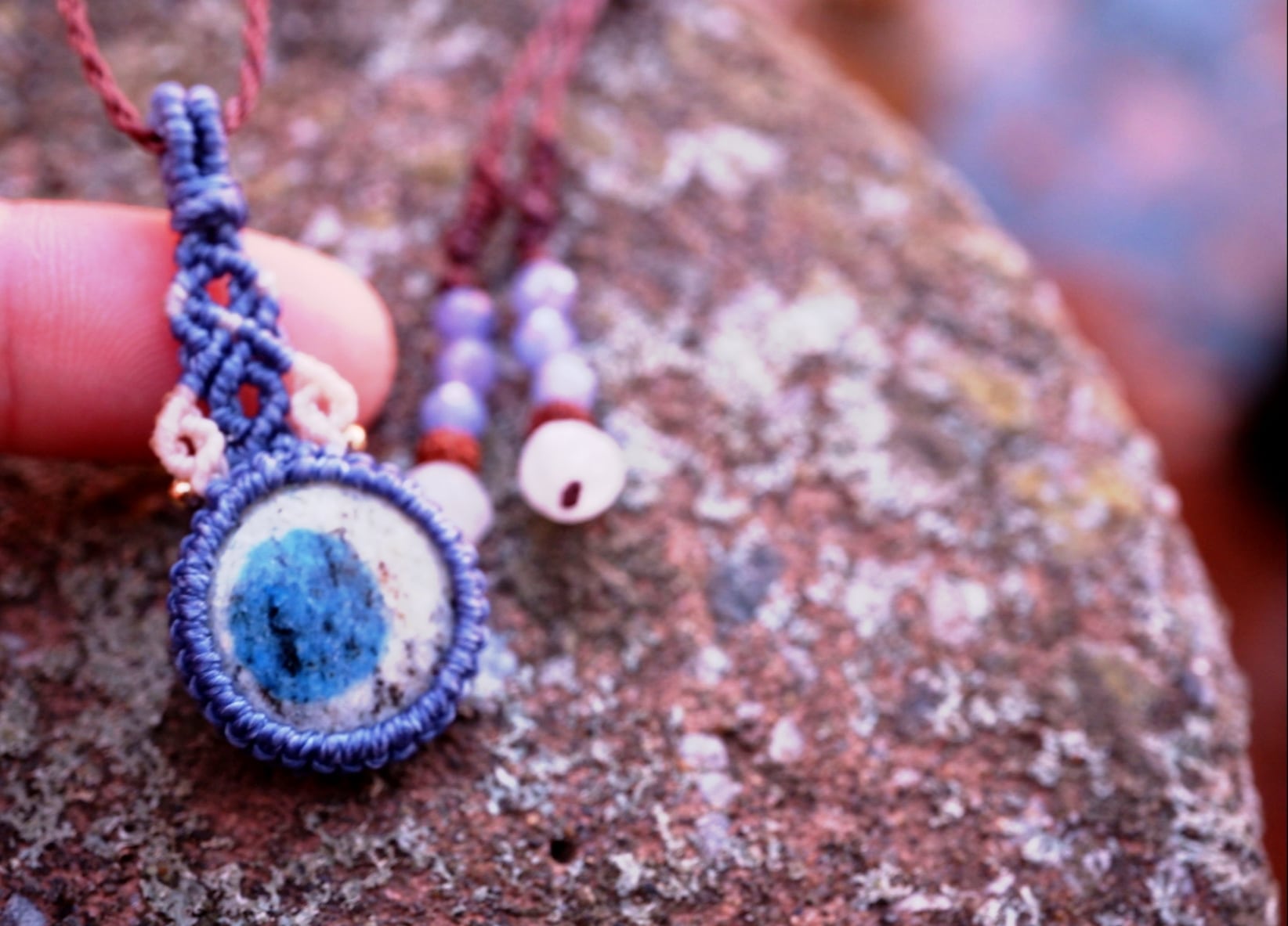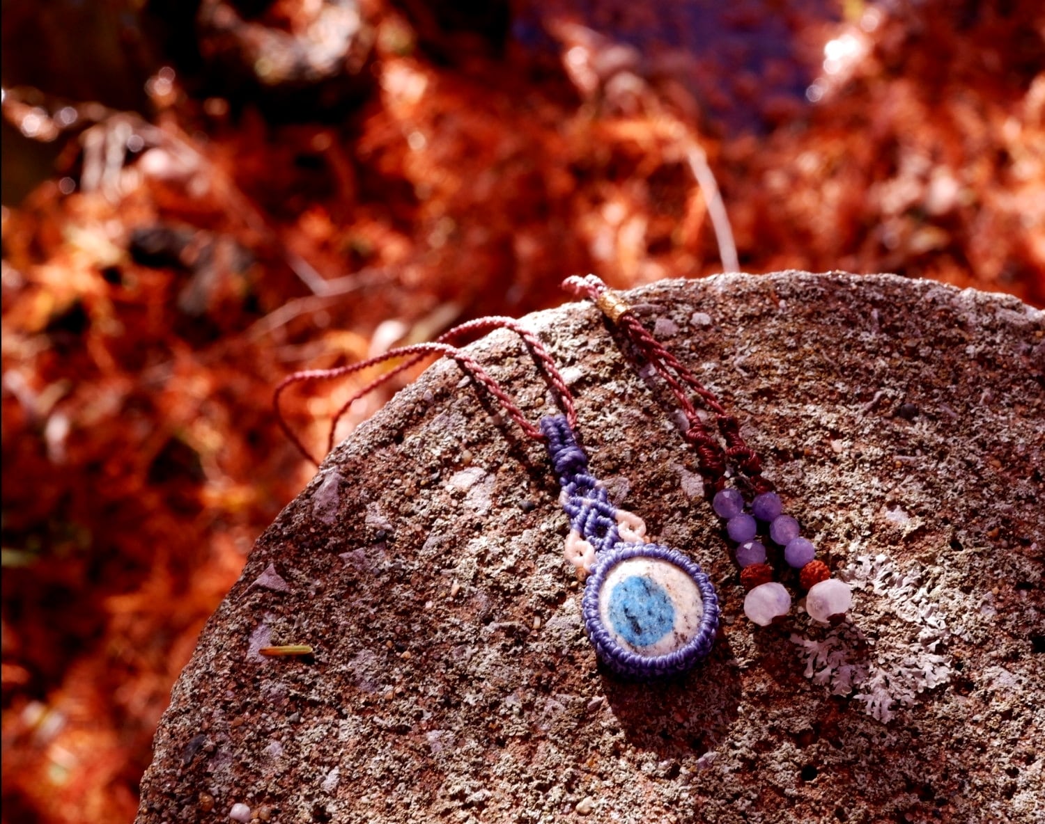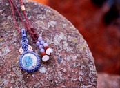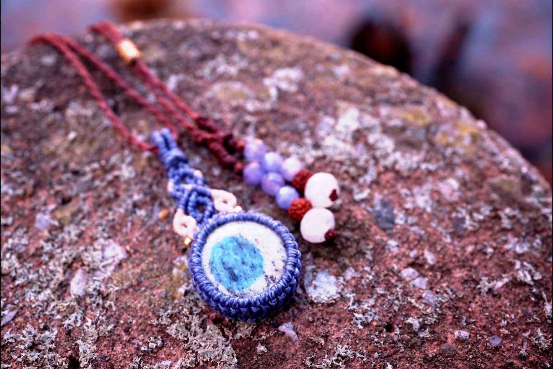 背守りには、キラリと輝くタンザナイト、小さなルドラクシャ、ムーンストーンを配置しました。