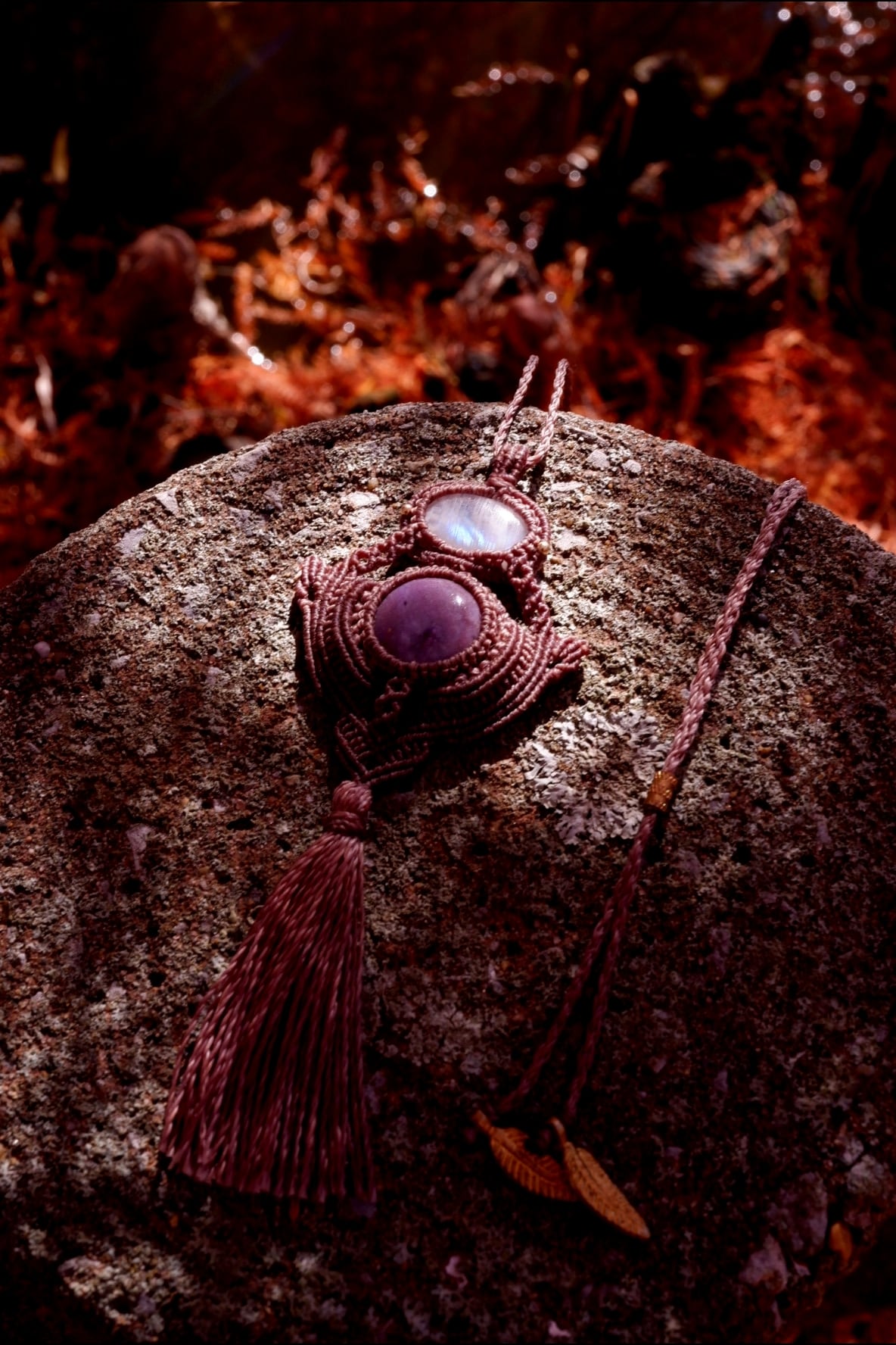 深い紫色が美しい、まんまるのチャロアイトと、角度によって美しいレインボーが光り輝く小さなムーンストーンを繋いだネックレス。