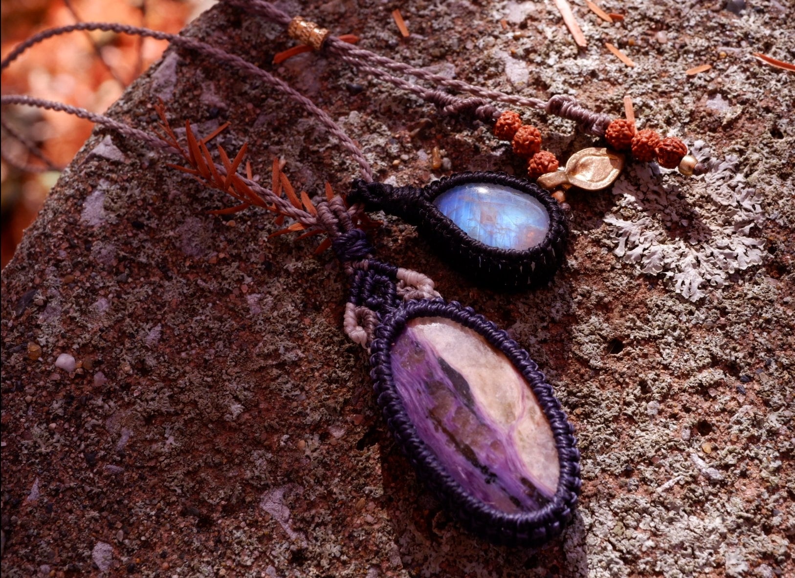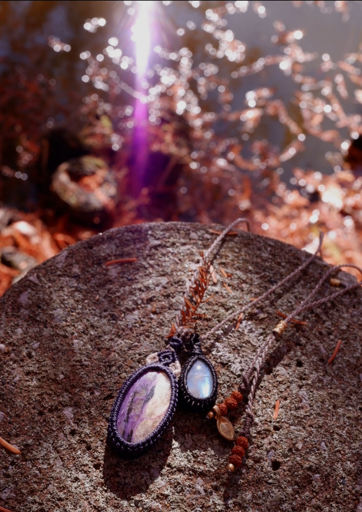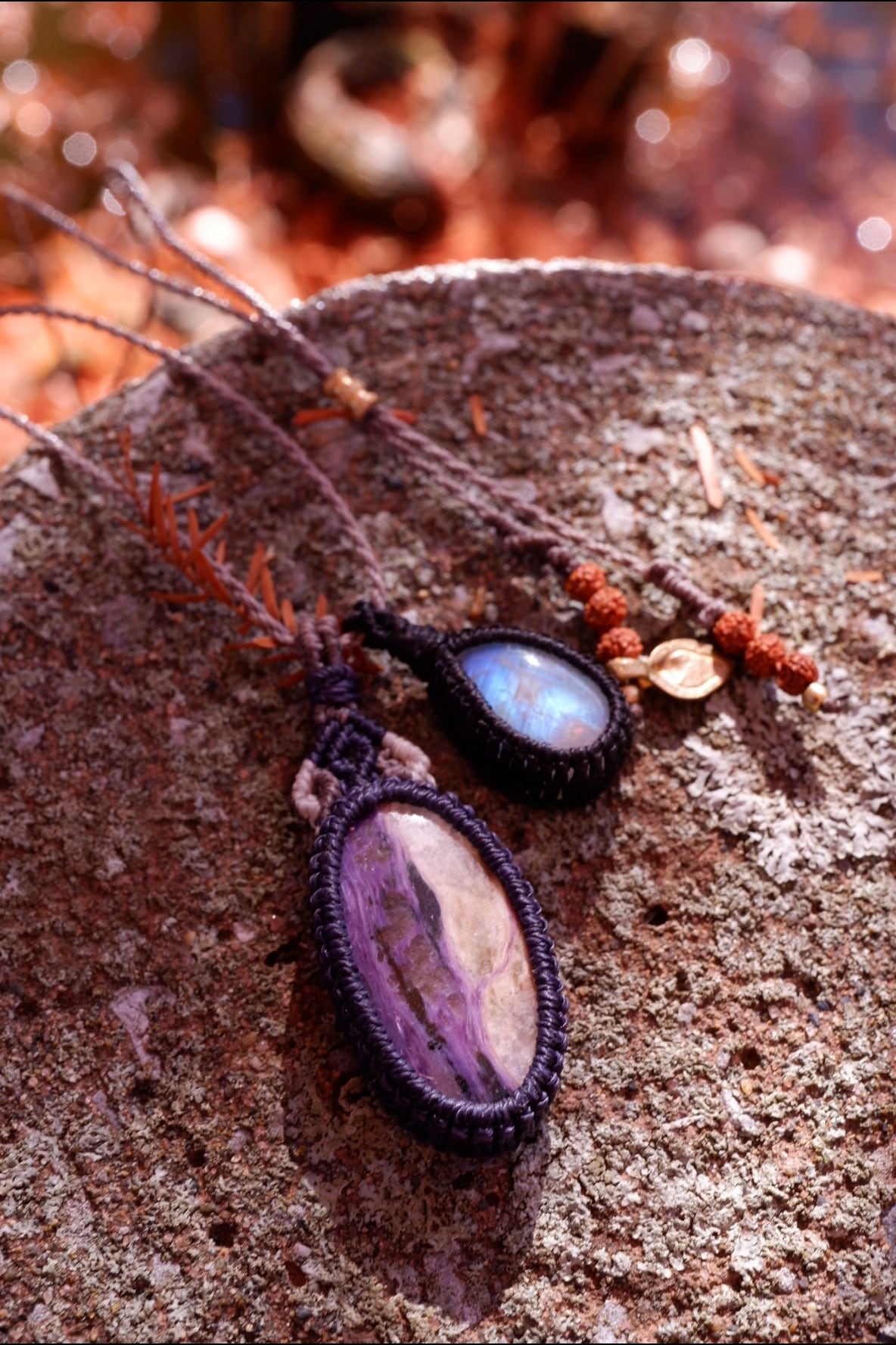 深い紫色が美しく、油彩画のような、芸術的な美しい模様をもつチャロアイトと、美しいブルーが光り輝く小さなムーンストーンのツインネックレス。