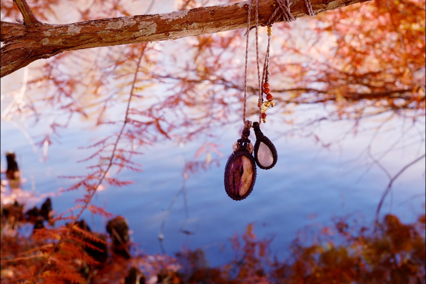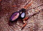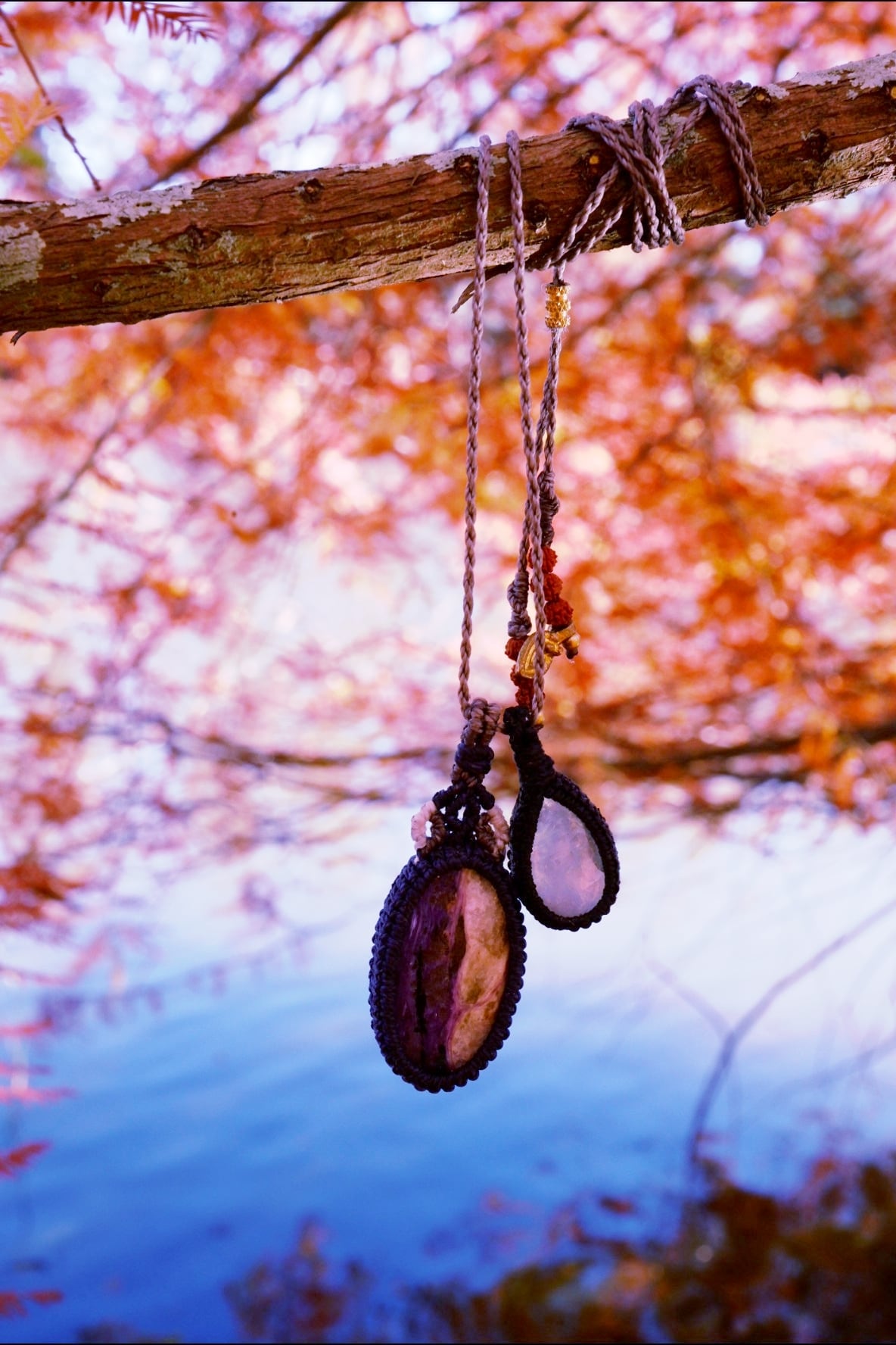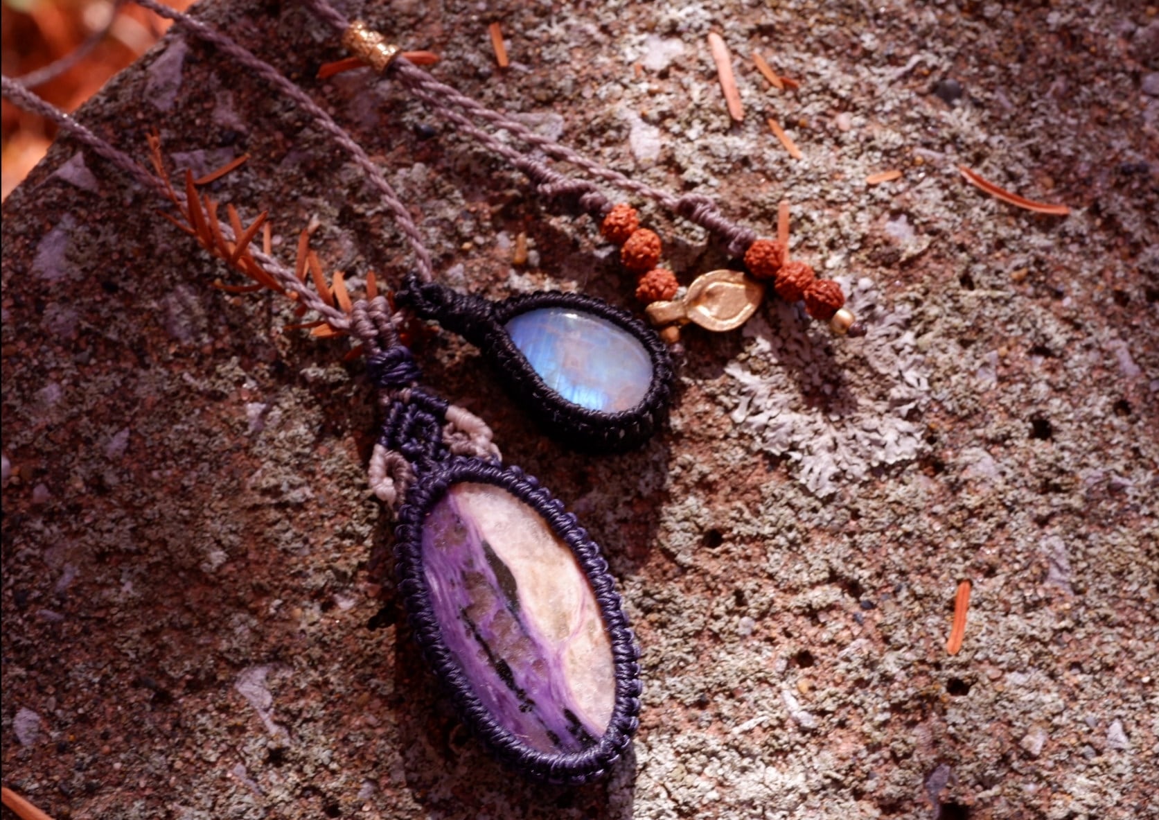 深い紫色が美しく、油彩画のような、芸術的な美しい模様をもつチャロアイトと、美しいブルーが光り輝く小さなムーンストーンのツインネックレス。