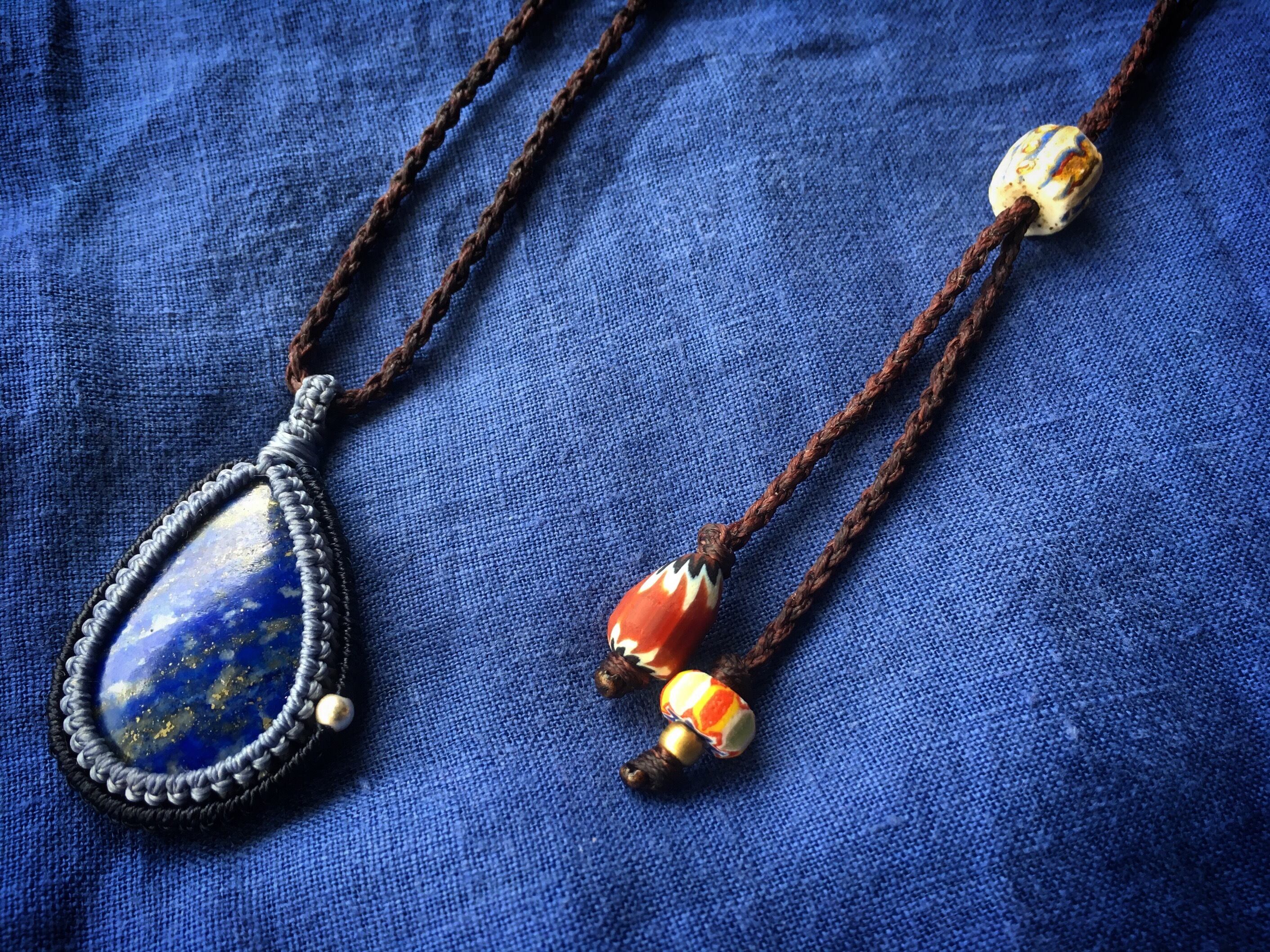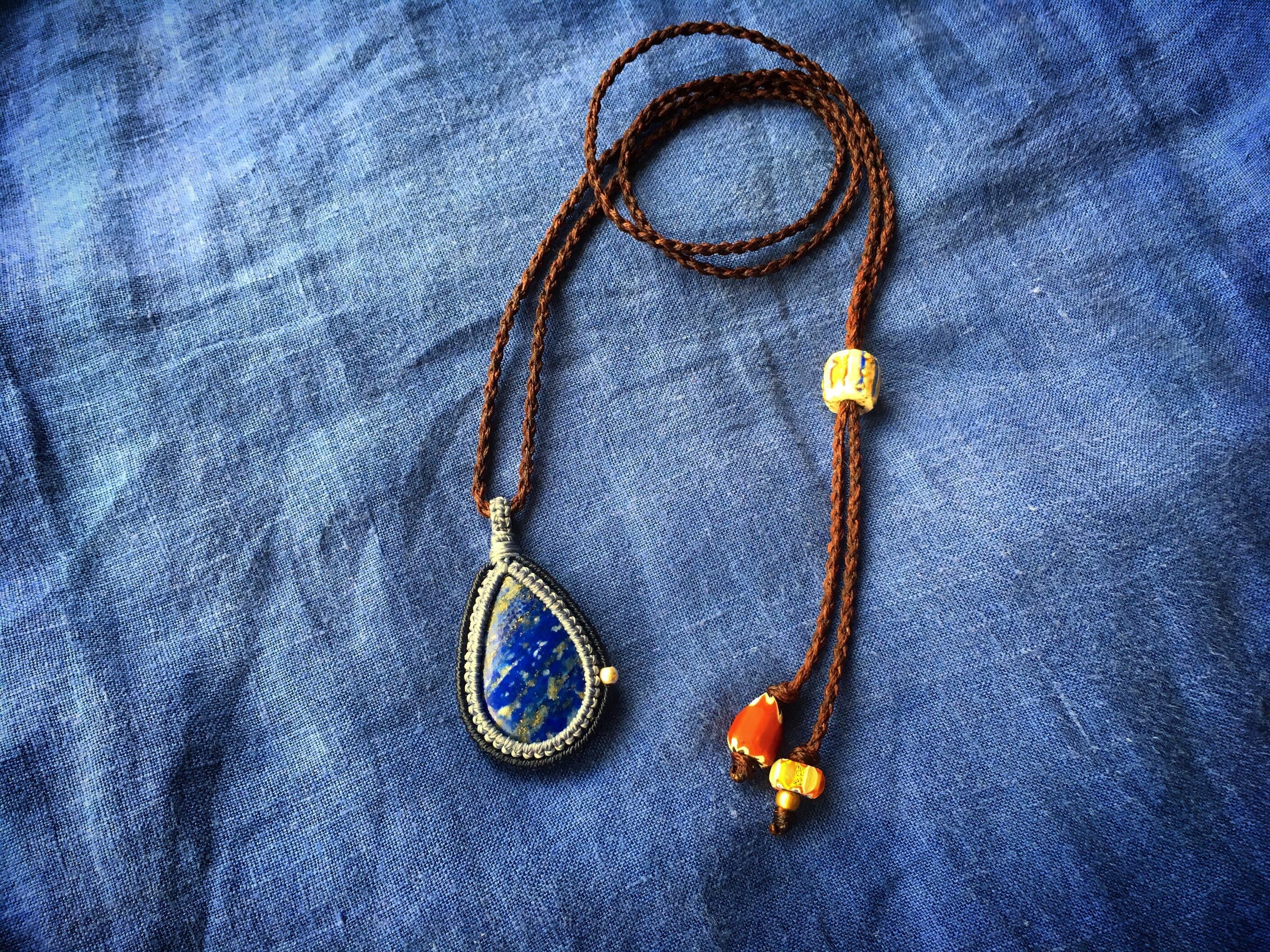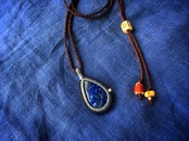 明るい青色のなかに、天の川のように流れる星たちが浮かんでいるような、ドロップ型のラピスラズリのネックレスです。