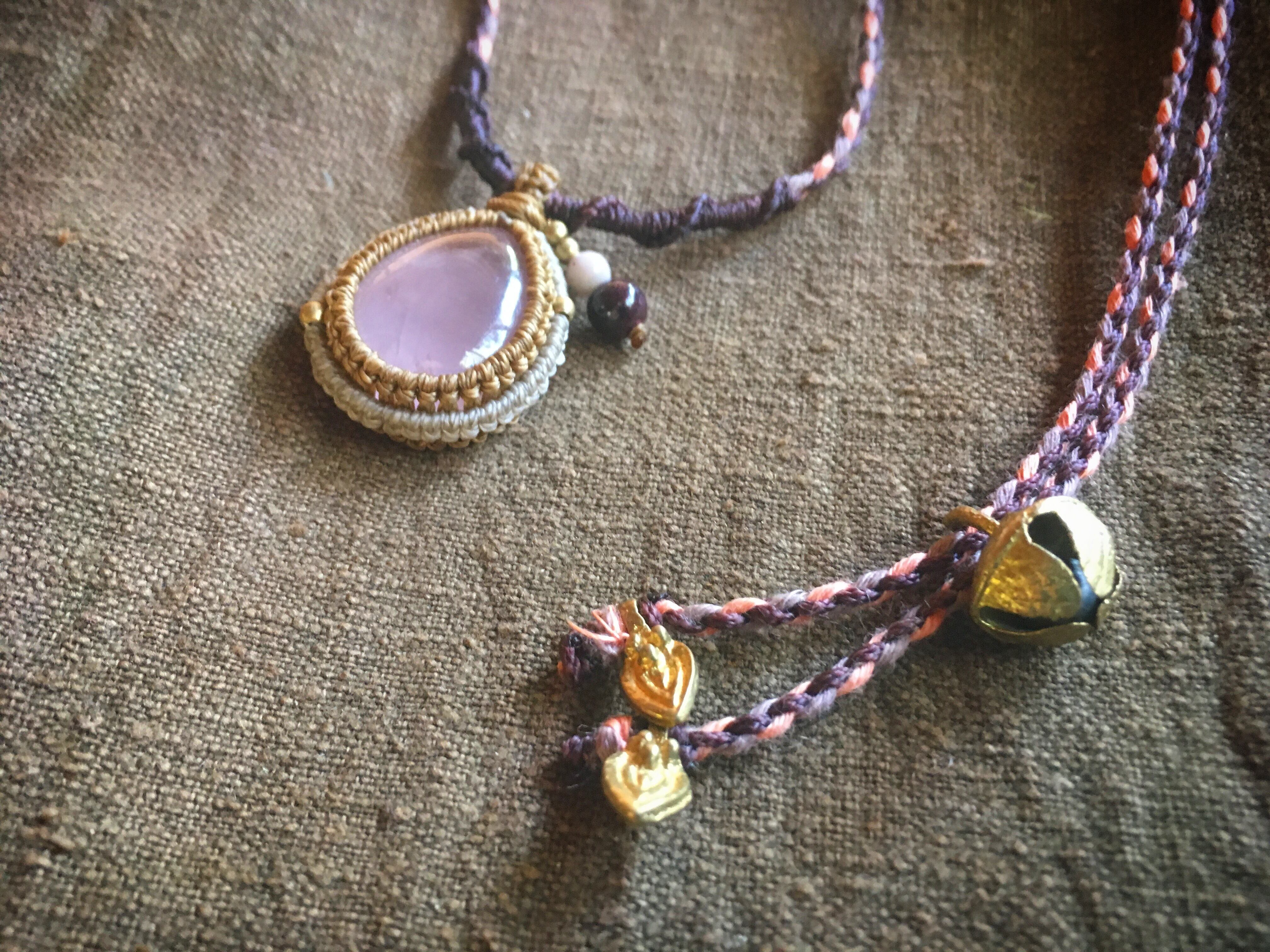艶やかなピンク色がかわいいローズクォーツをマクラメ編みで、ネックレスに仕立てました。