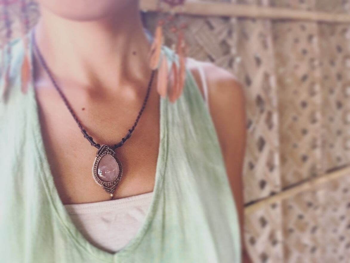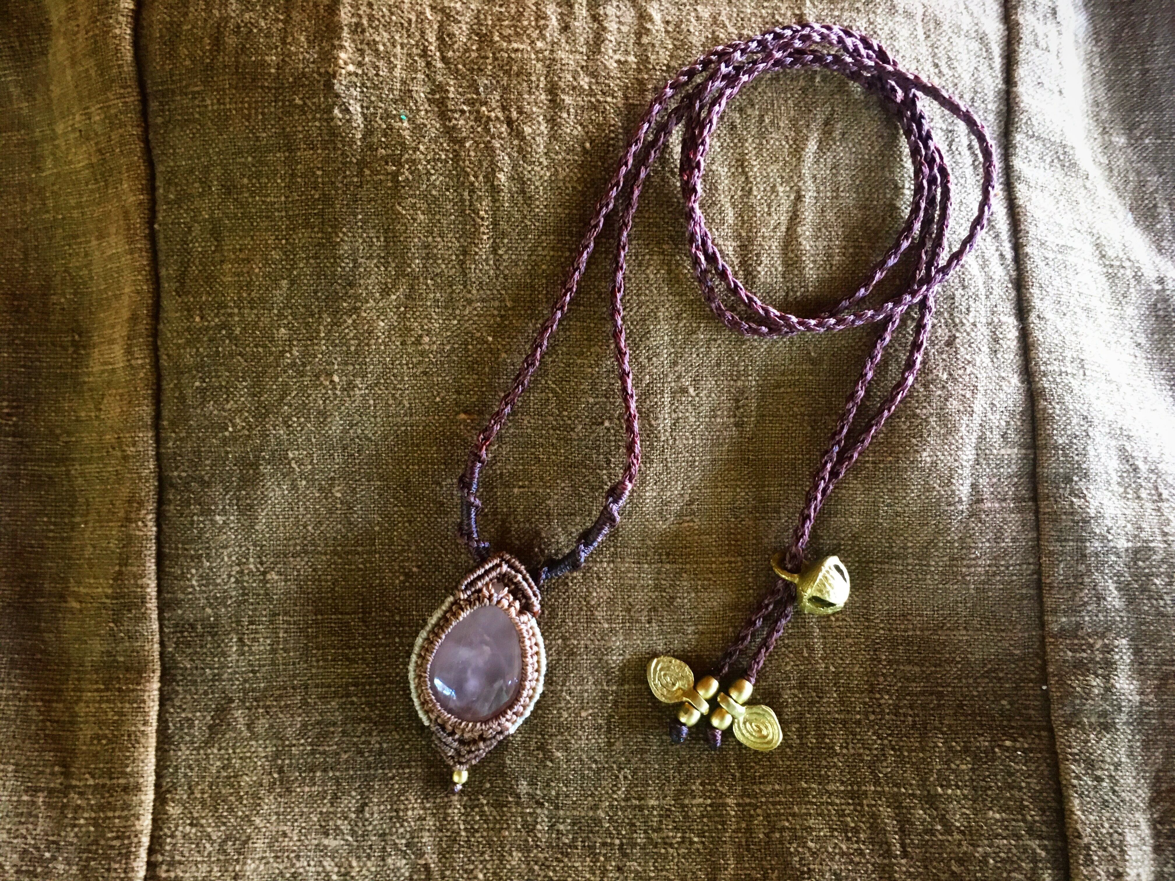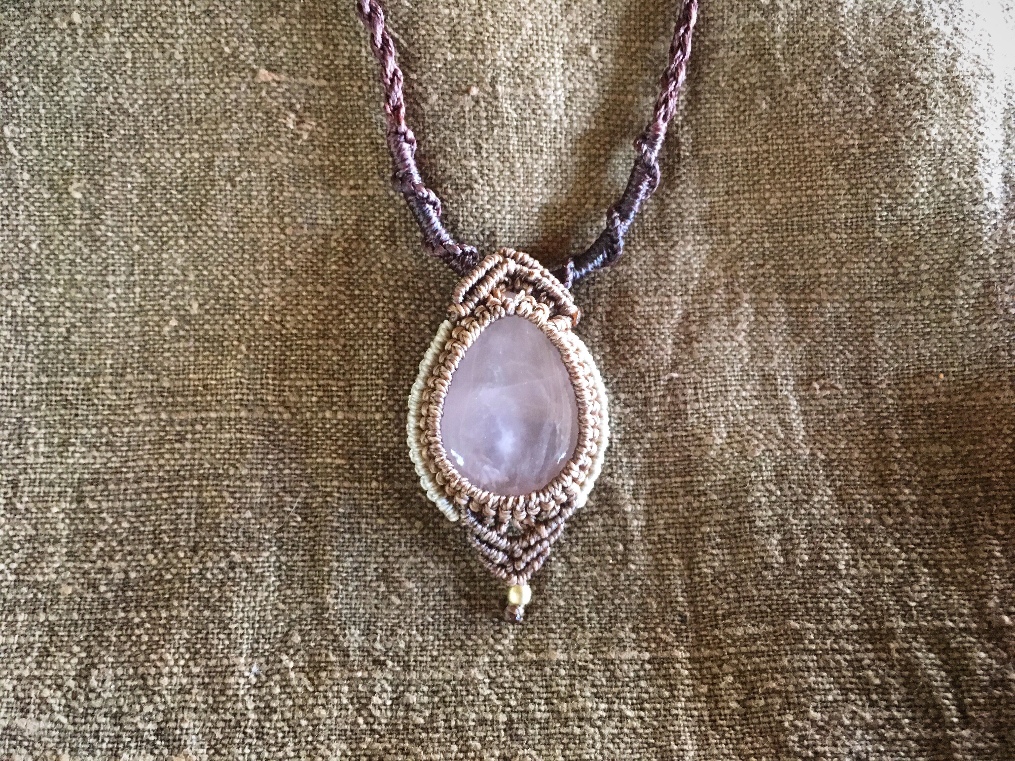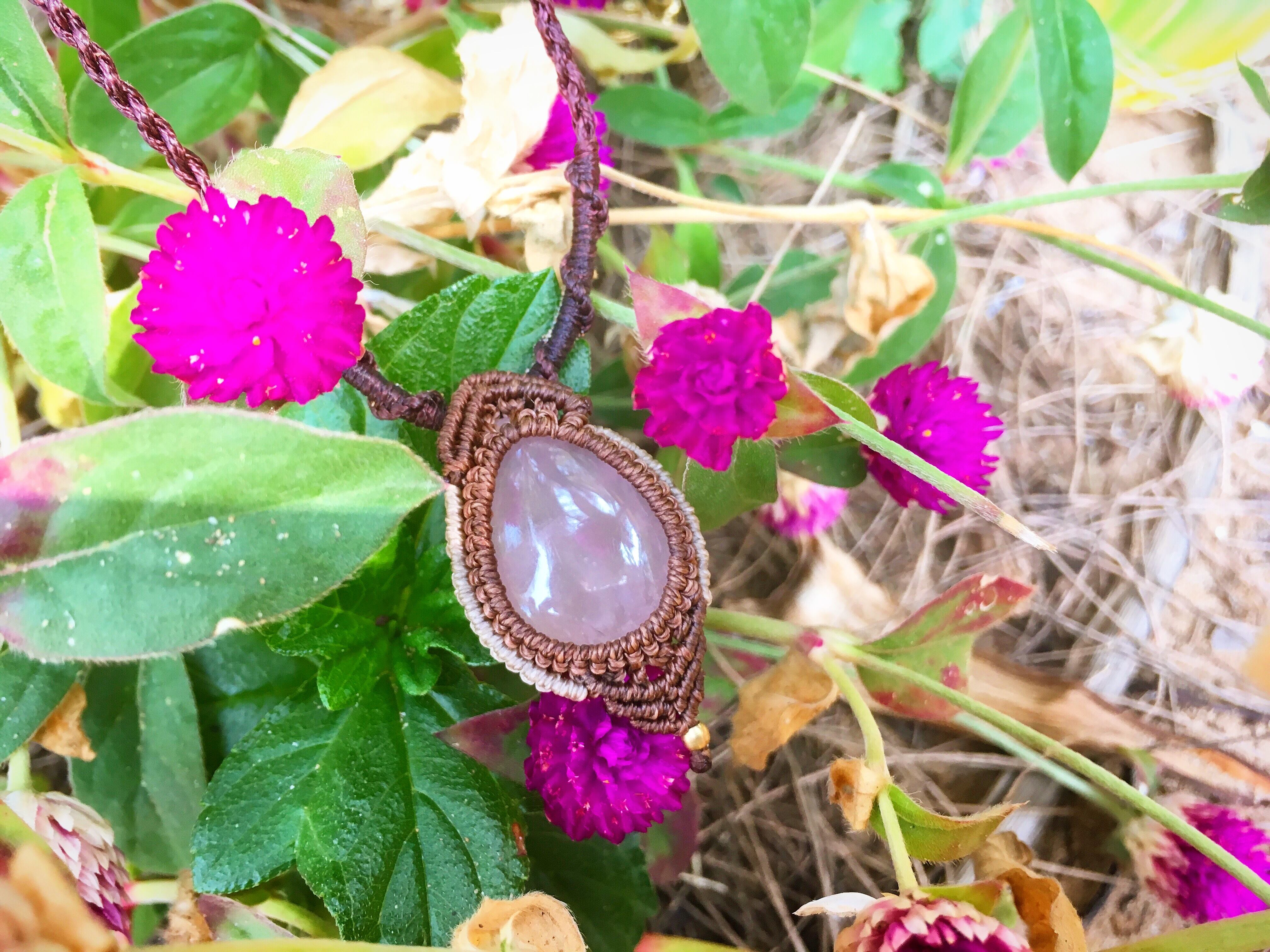 艶やかなピンク色がかわいいローズクォーツをマクラメ編みで、ネックレスに仕立てました。