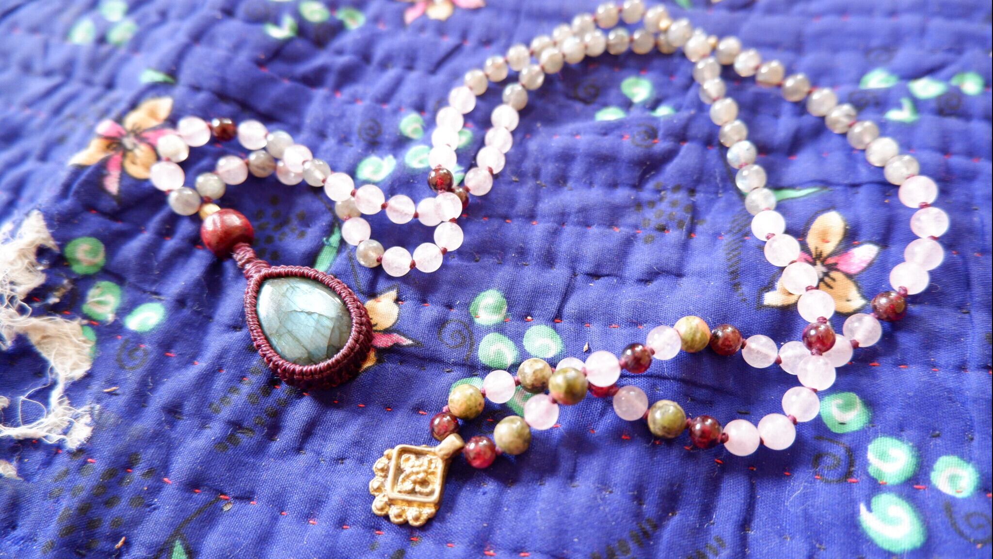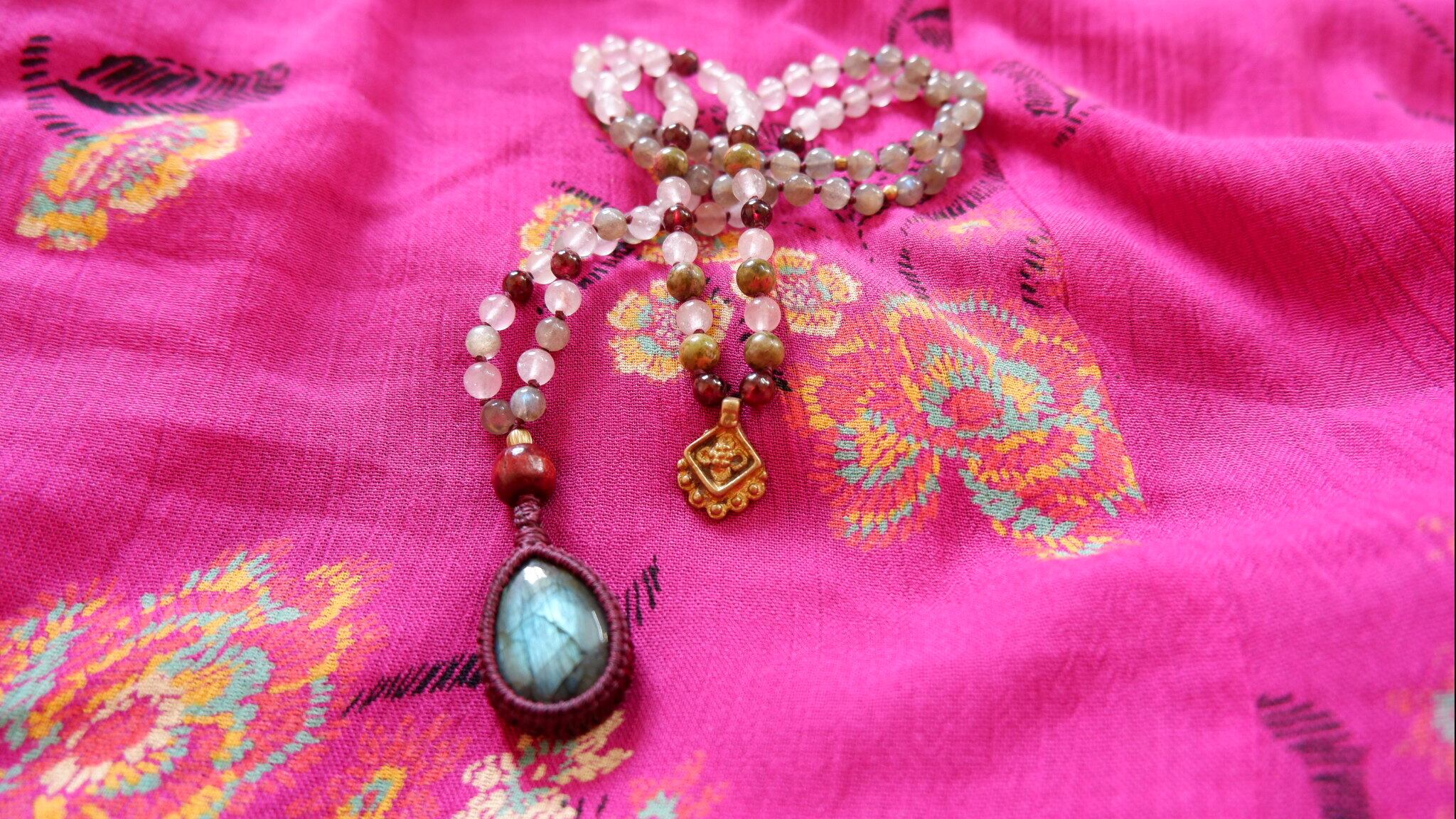 光の加減によって美しいブルーに輝くラブラドライトと、クリアーなピンクのローズクォーツをメインに作ったジャパマラです。トップにはドロップ型のラブラドライトが玉虫色に輝きます。
