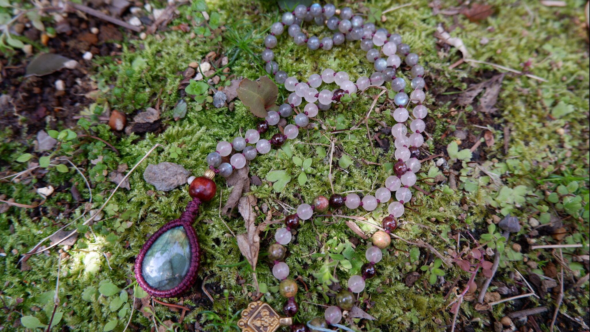 ところどころに ガーネットと ユナカイトを加えて、可愛らしさのなかにも落ち着いた雰囲気のあるジャパマラになりました。