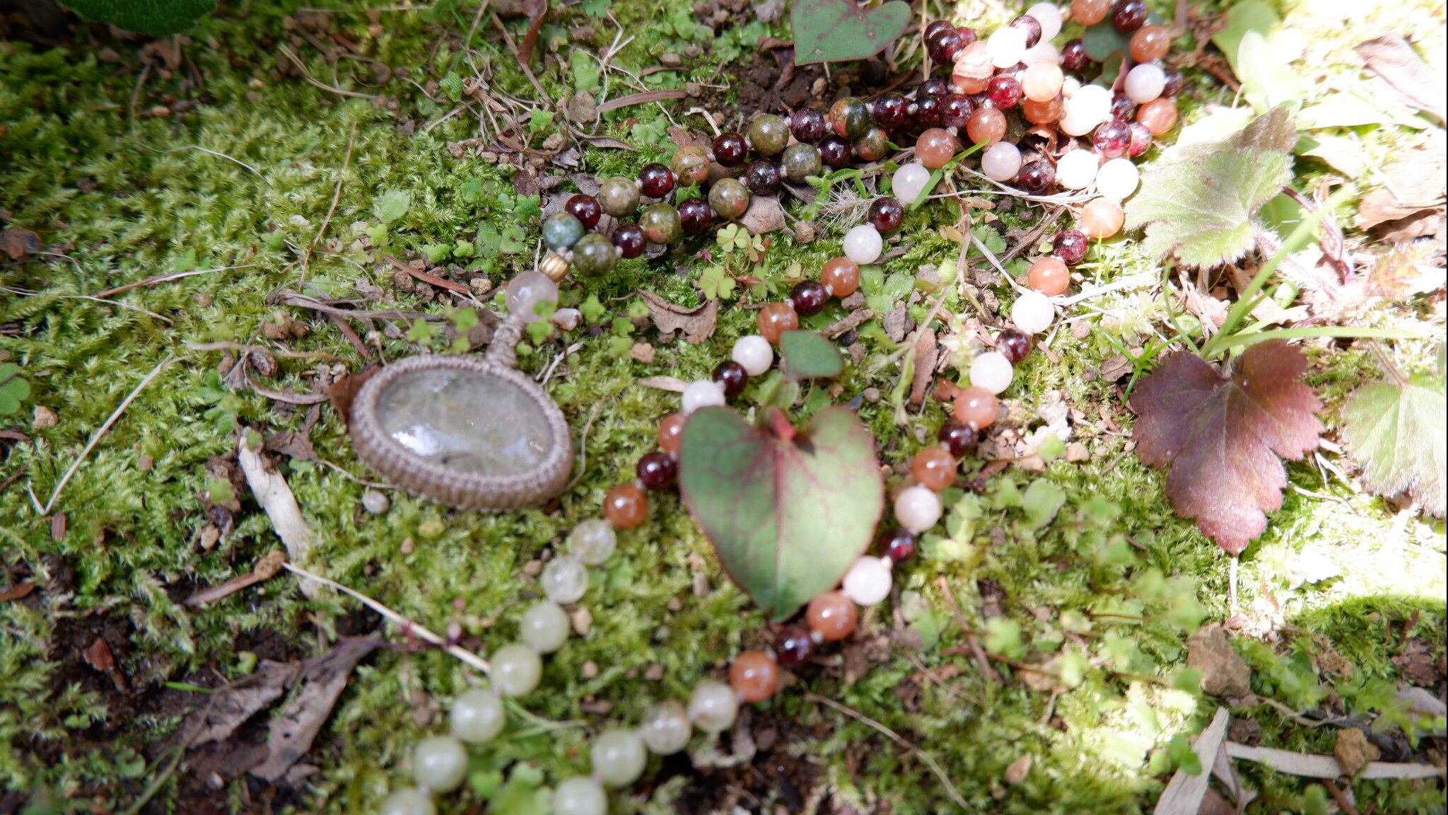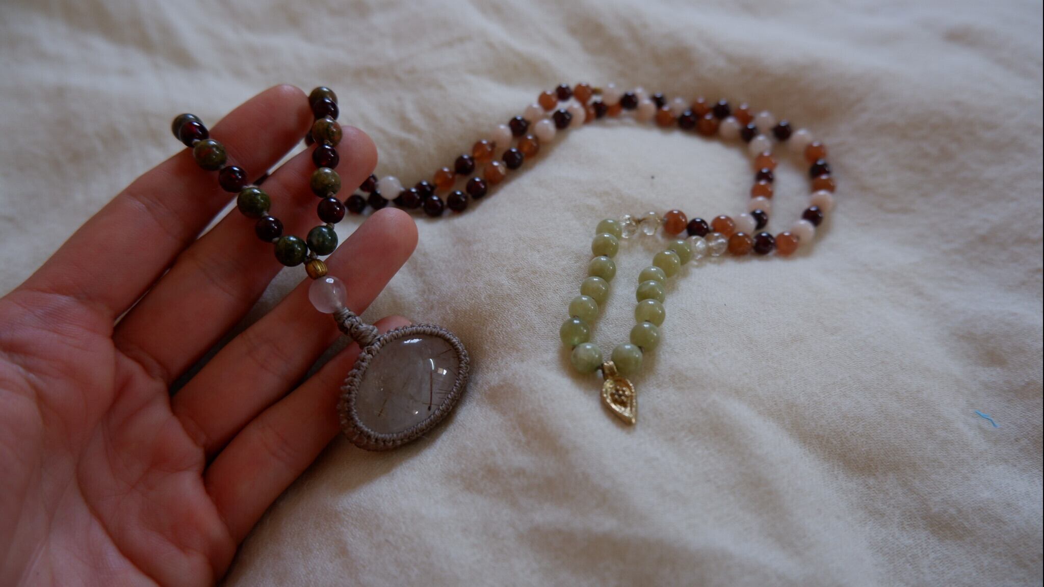 他にもブラウンアゲート、シトリン、ユナカイト、グリーンのモルガナイトを使用し、あたたかみにあるジャパマラになりました。