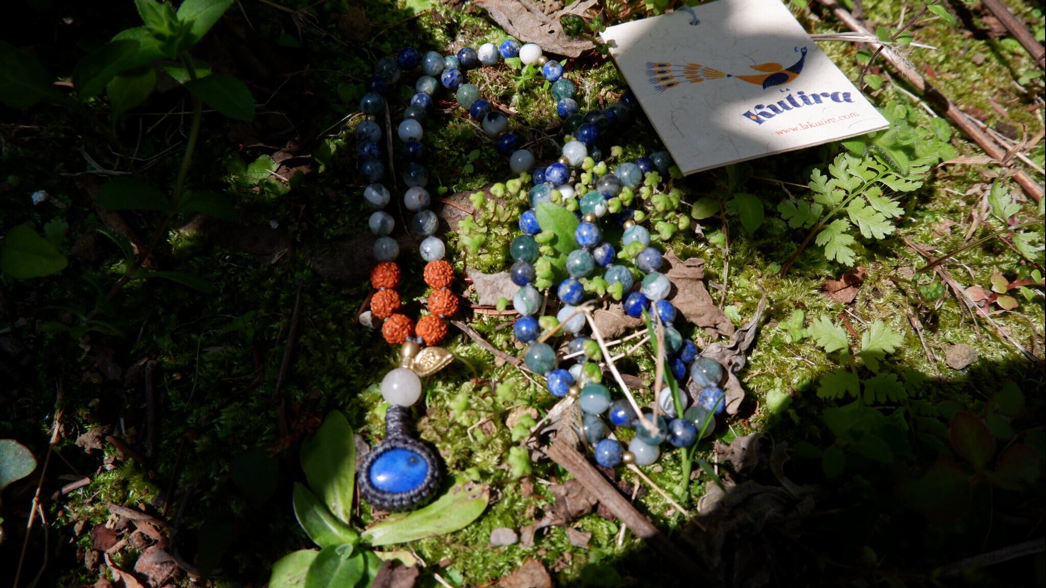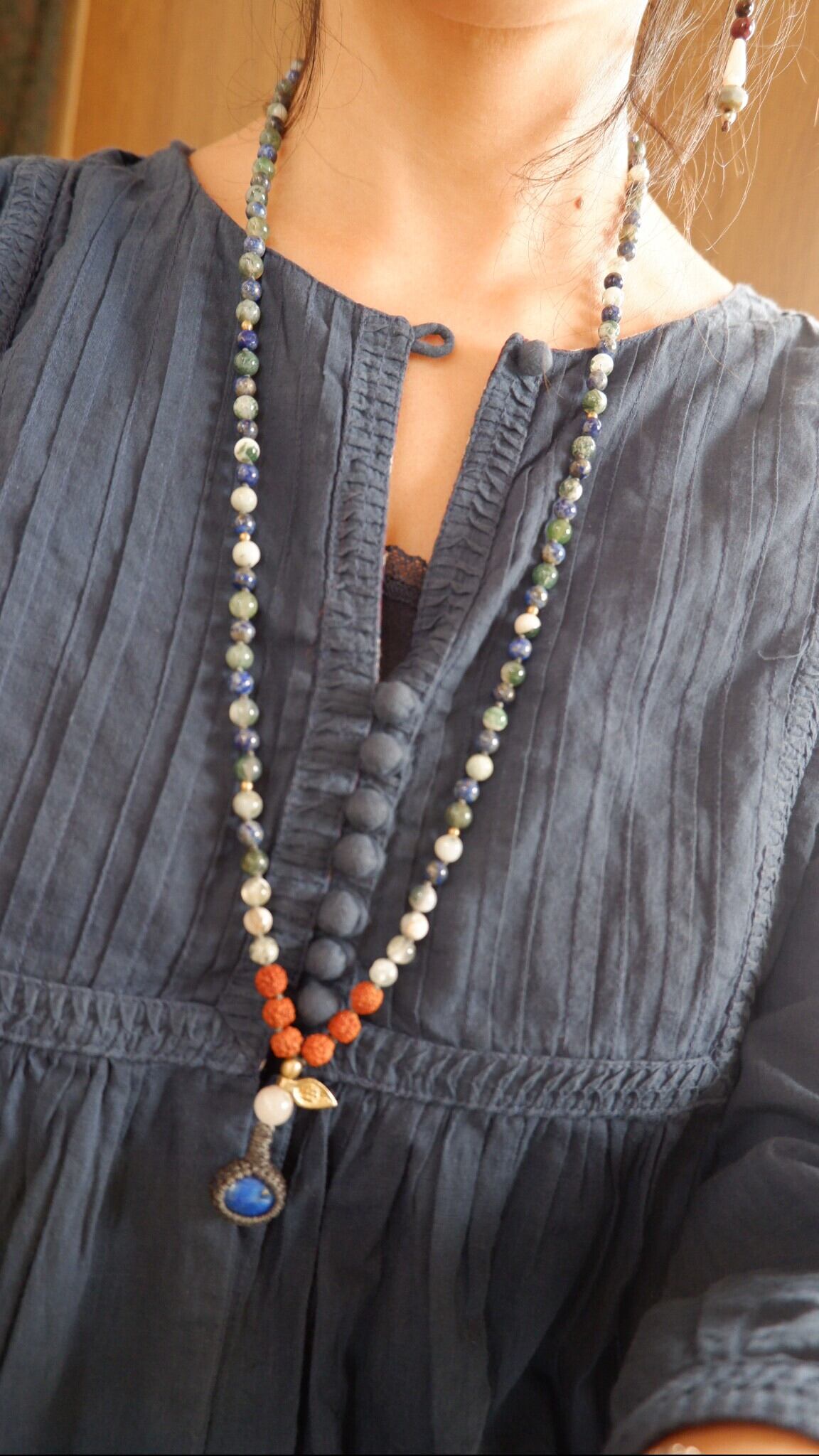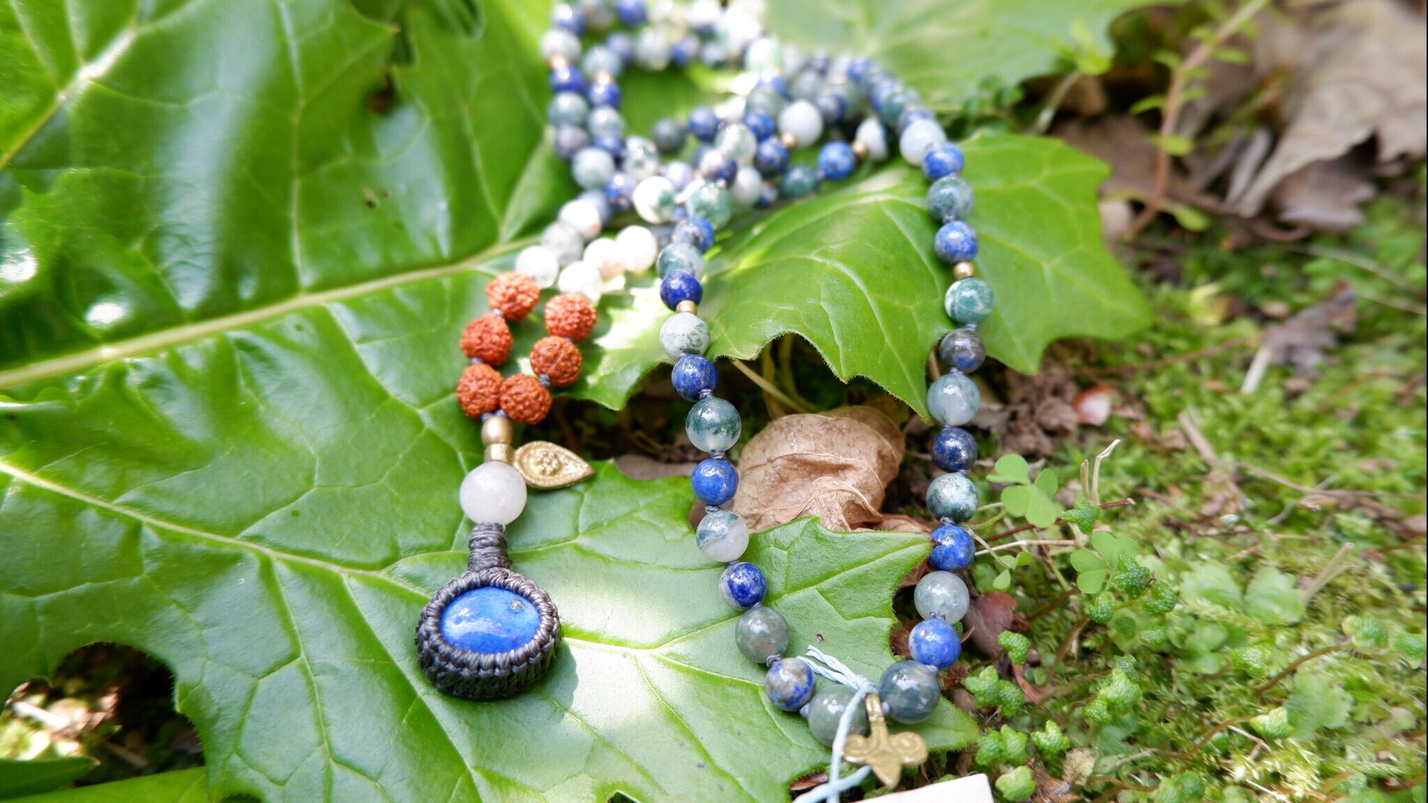そのラピスラズリをペンダントトップに、またマラ部分はラピスラズリと、大自然の中で深呼吸するような、森林浴効果と同じような効果があると言われるモスアゲート,