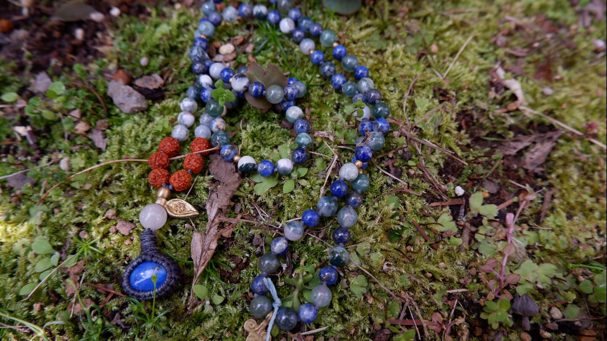 Japa mala : Lapis lazuli + Rudraksha, Moss agate, Lapis lazuli