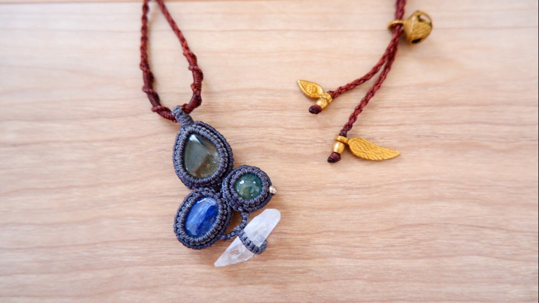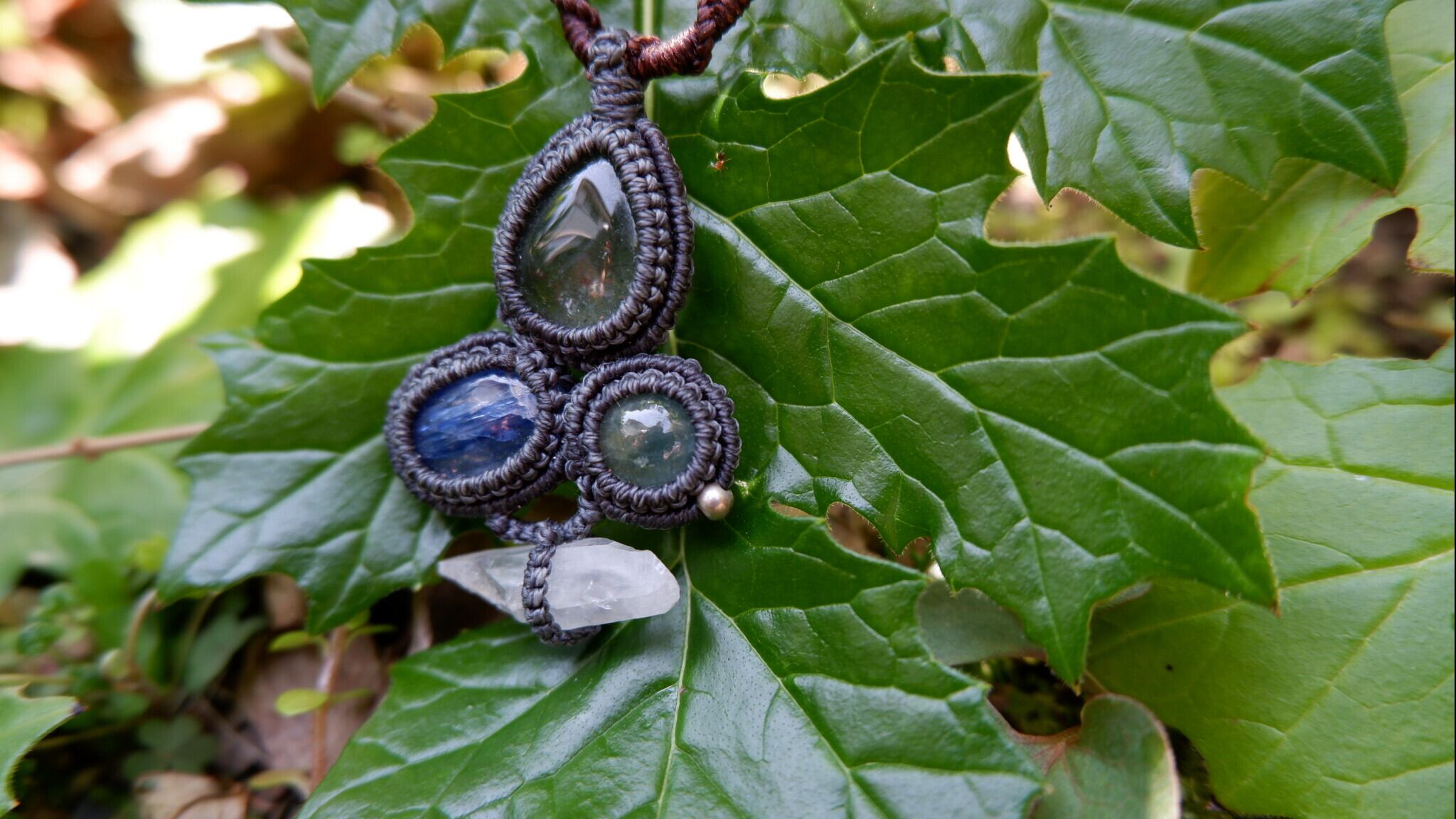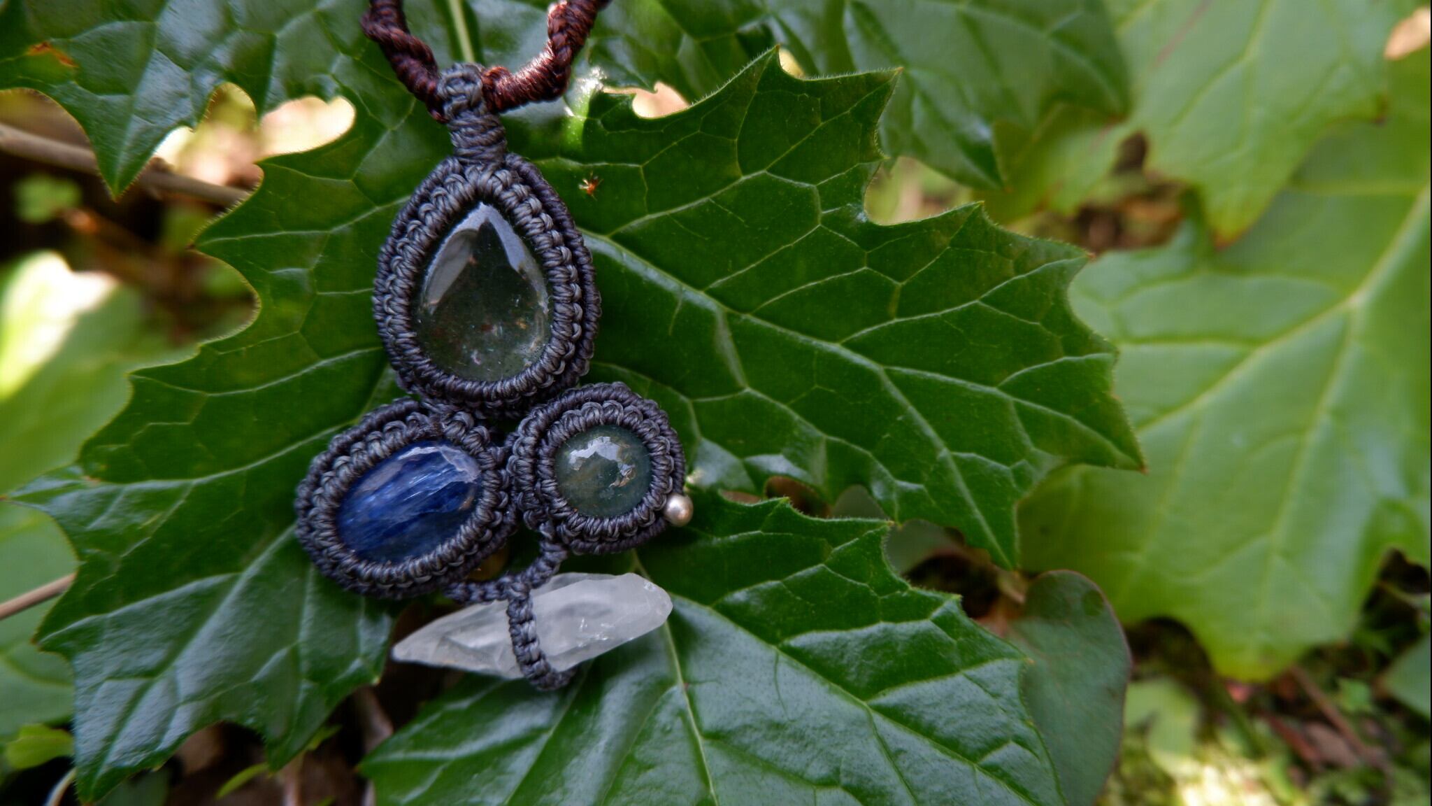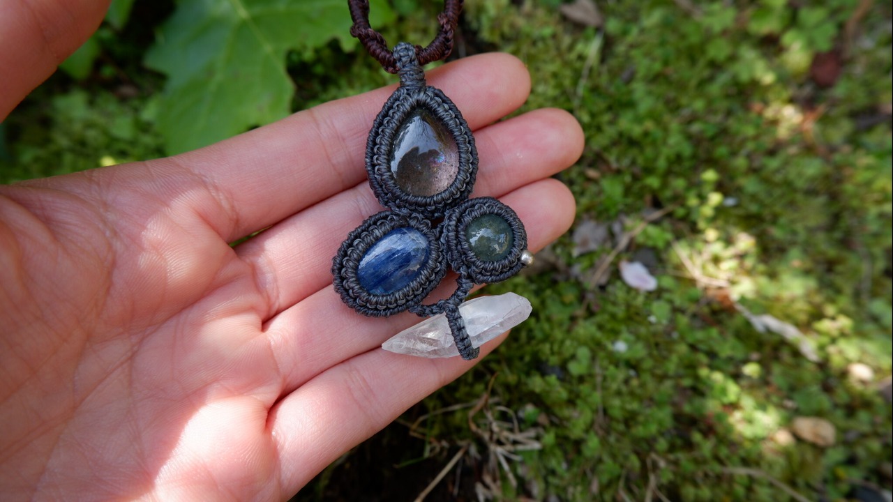小さな森を内包しているようなドロップ型のガーデンクォーツ、強く霊性に働きかけ、世界観を確立するお手伝いをする青色がほんとうに美しい石カイヤナイト、海のようないやしの石アクアマリン、それから最大の浄化力を発揮するヒマラヤ水晶ナチュラルポイントを組み合わせました。