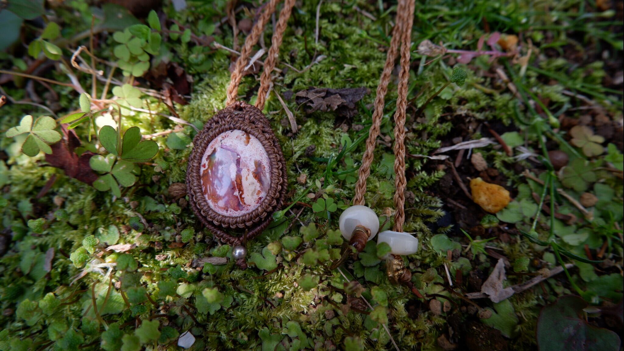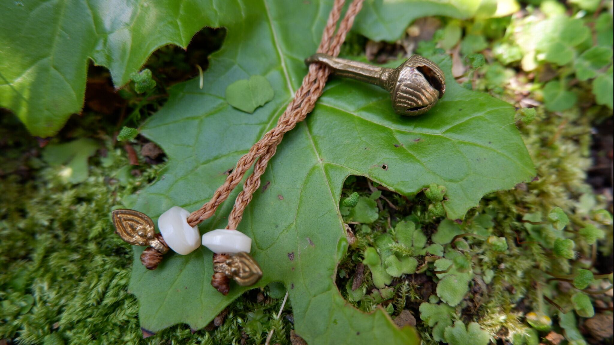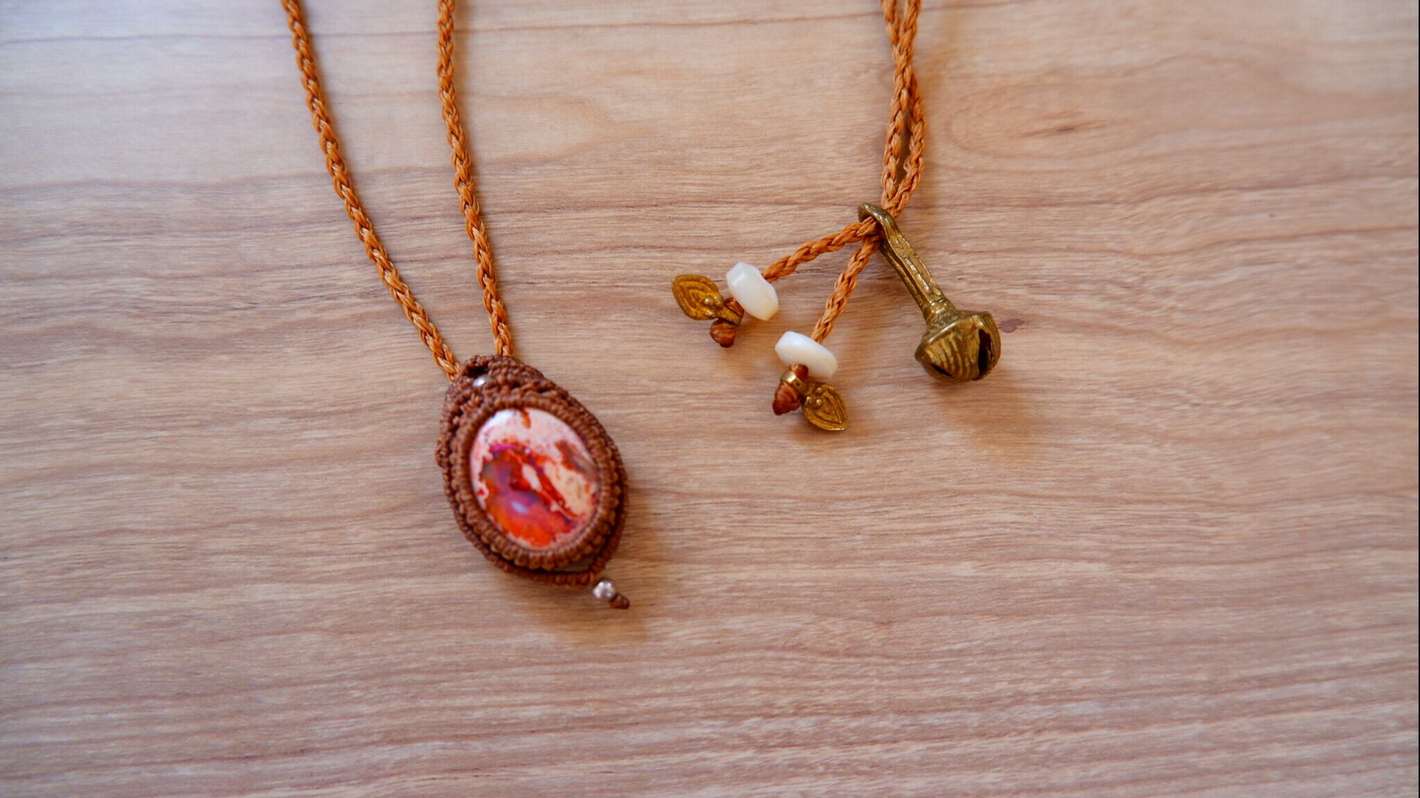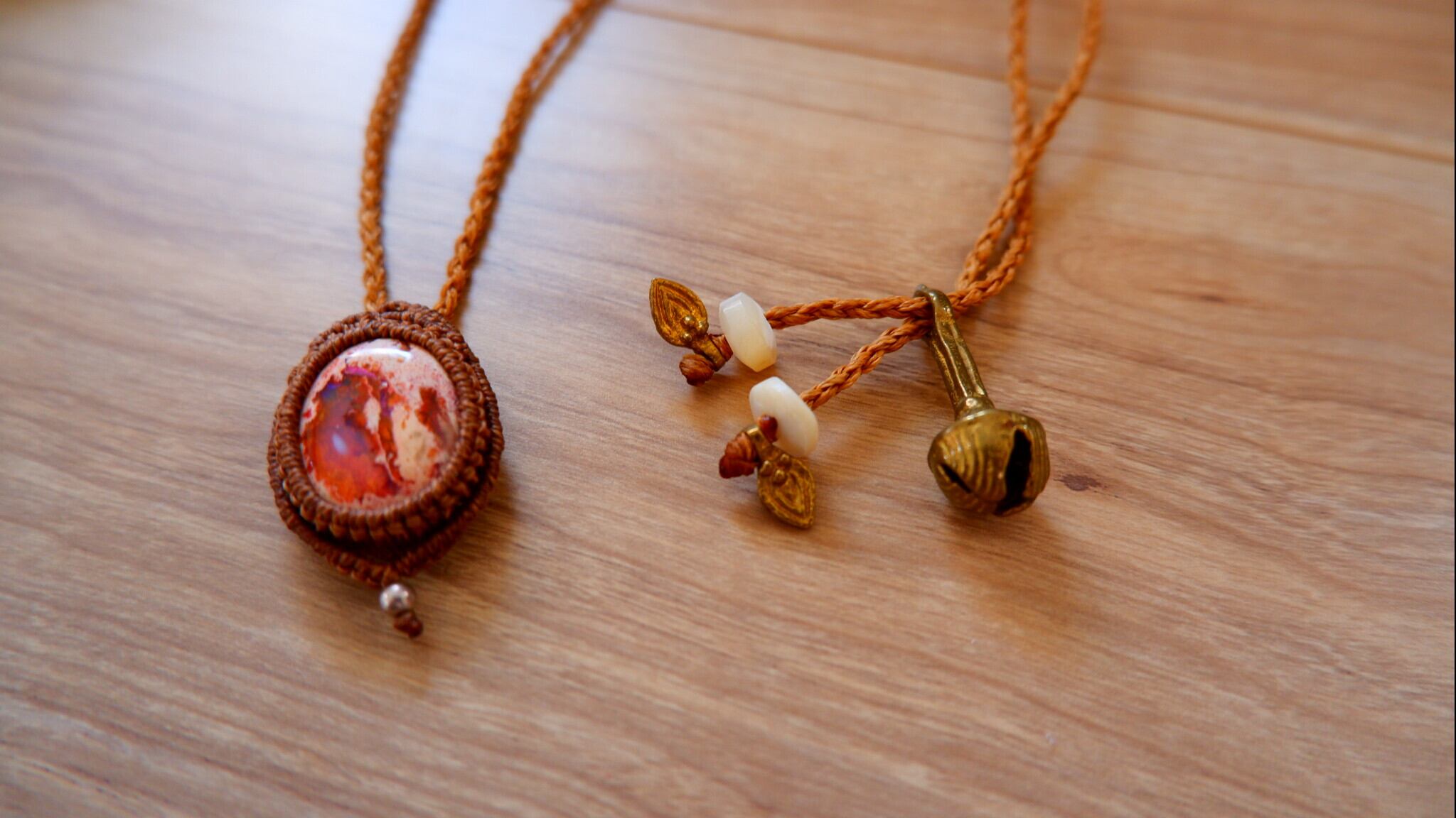 エンド部分には真鍮のチャームと、ヒマラヤで手に入れたアンティークのマザーオブパールを使用しています。