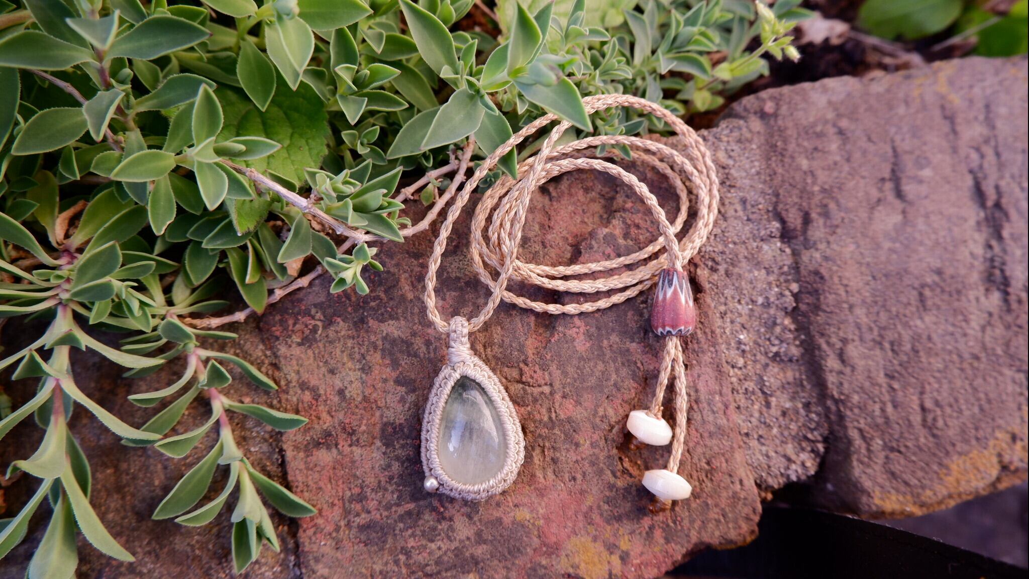 その他に スライド部分にフランスで見つけたデザインビーズ、エンド部分にヒマラヤで出会ったアンティークのマザーオブパールを使っています。