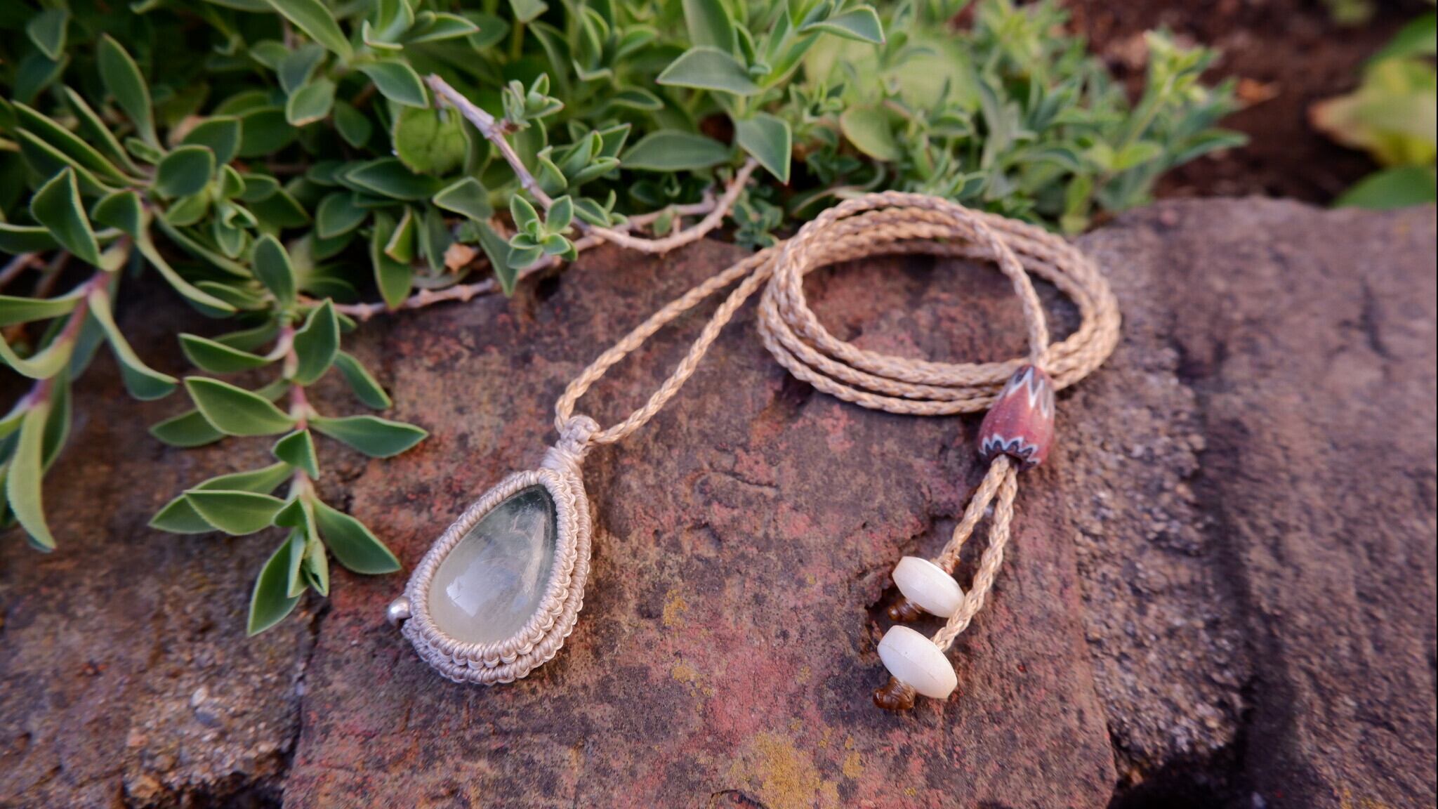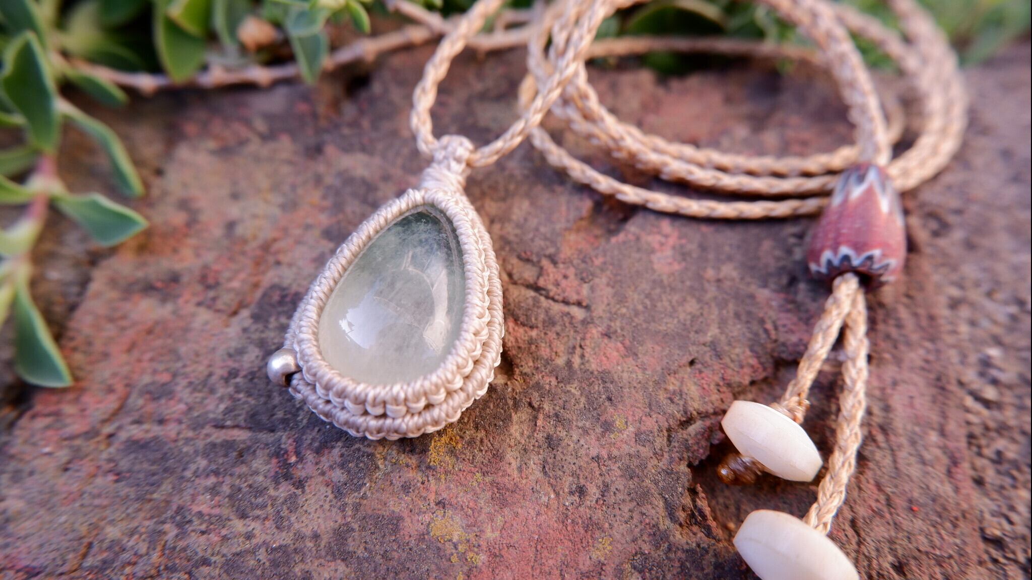 表面をふっくらとまるみをもって磨かれドロップ型にカットされています。透き通った湖のような石。