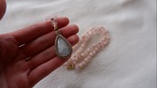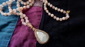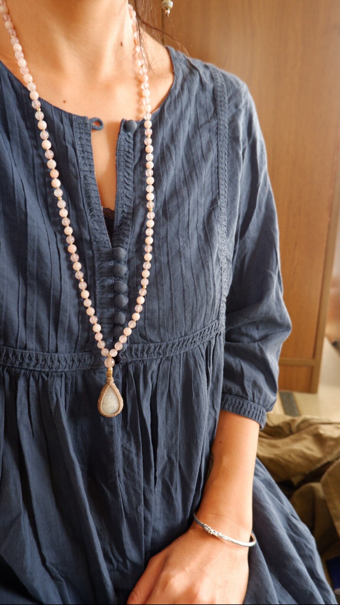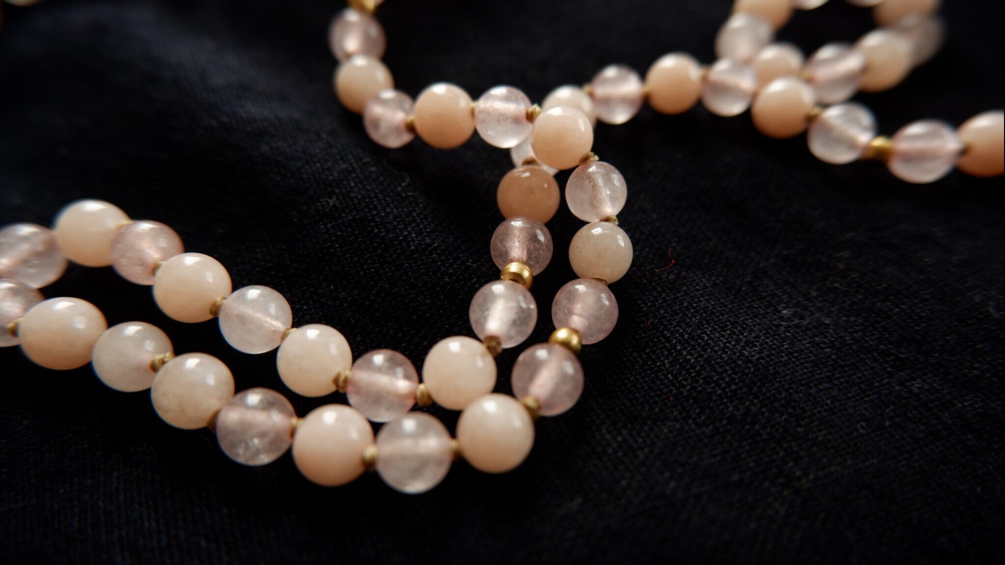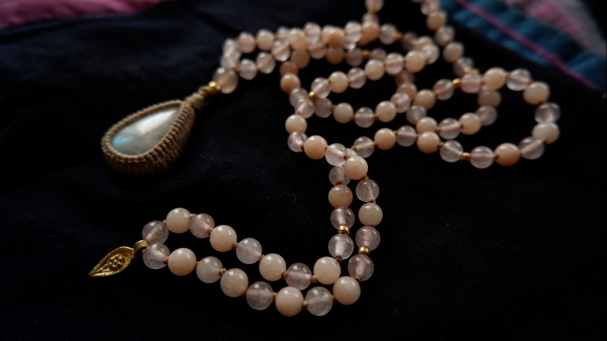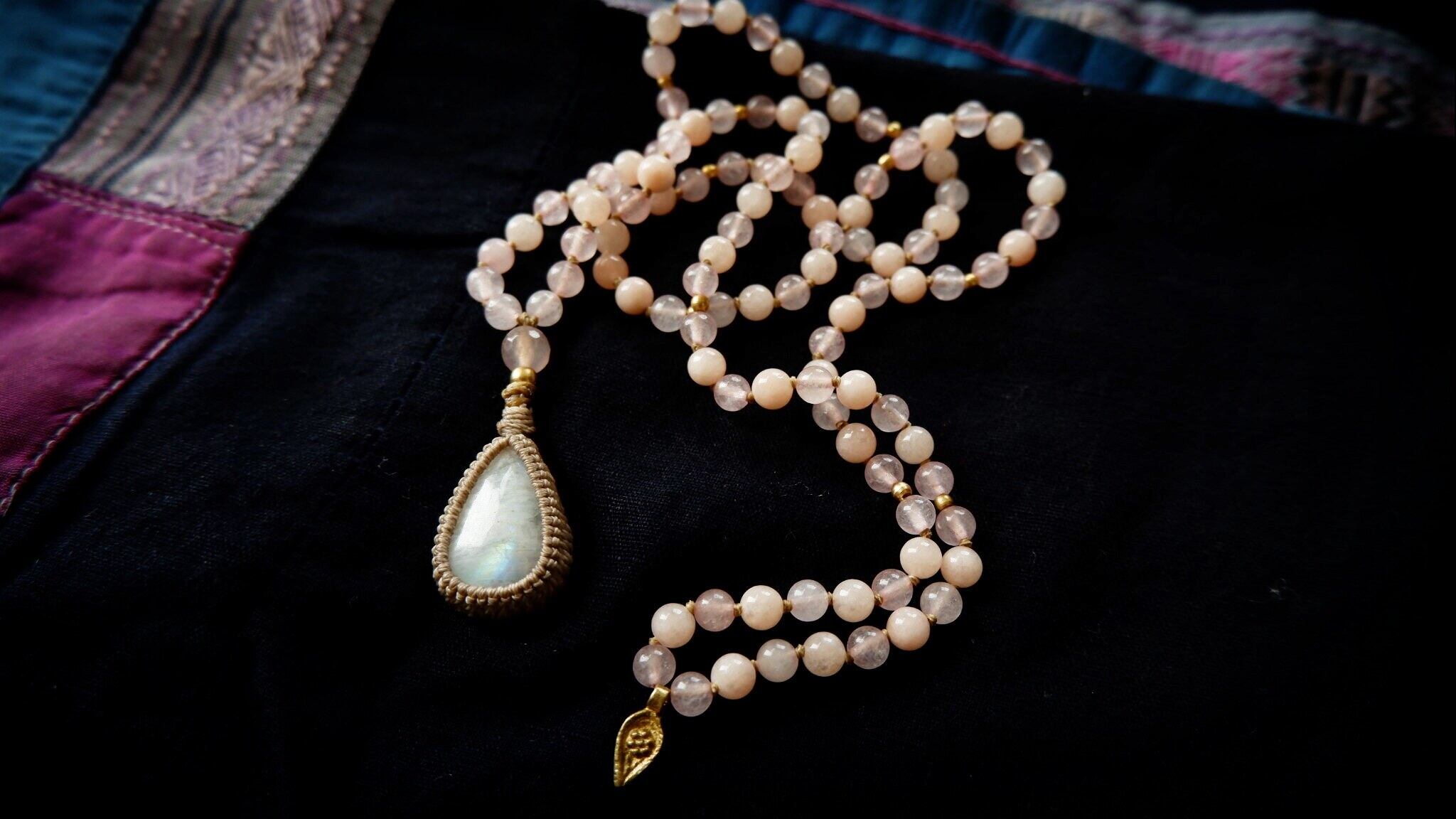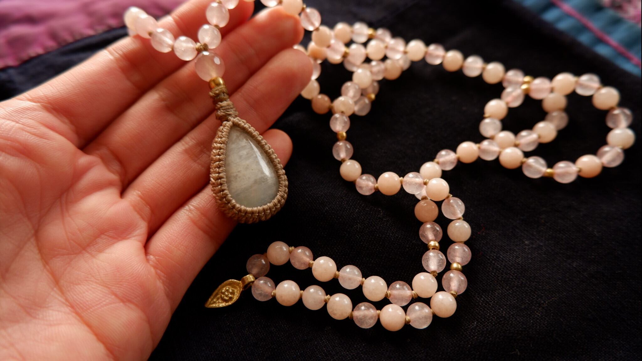 トップにレインボームーンストーンを、それからピンクモルガナイトとローズクォーツをひと粒ずつ交互に組み合わせて作った 重なるさまざまなピンクが美しくまるで満開の桜のようなマラが出来上がりました。グルビーズにはカッティングの美しいローズクォーツの少しおおきめのビーズをもってきました。