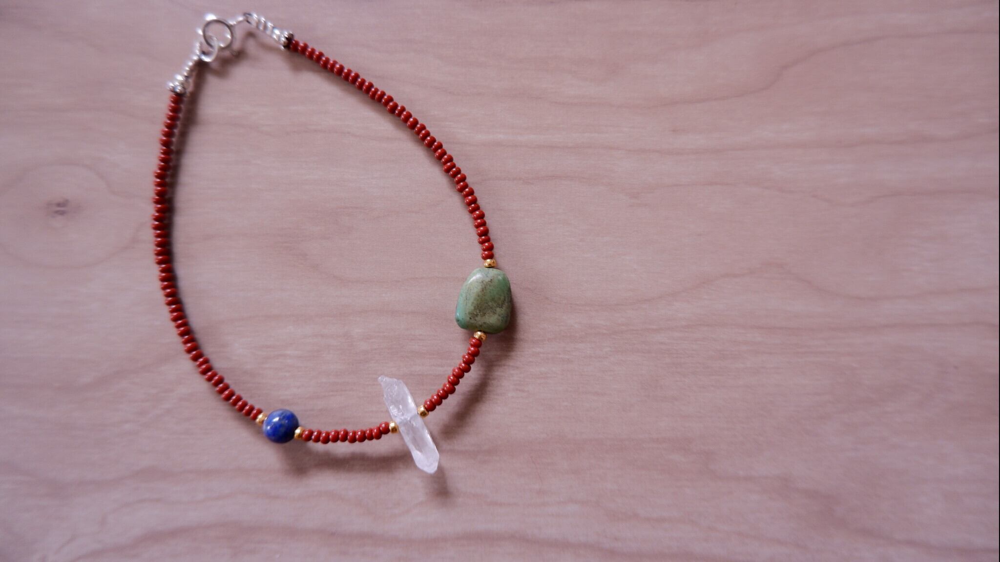 ベースはパリで見つけた小さな落ち着いた赤色のビーズ。