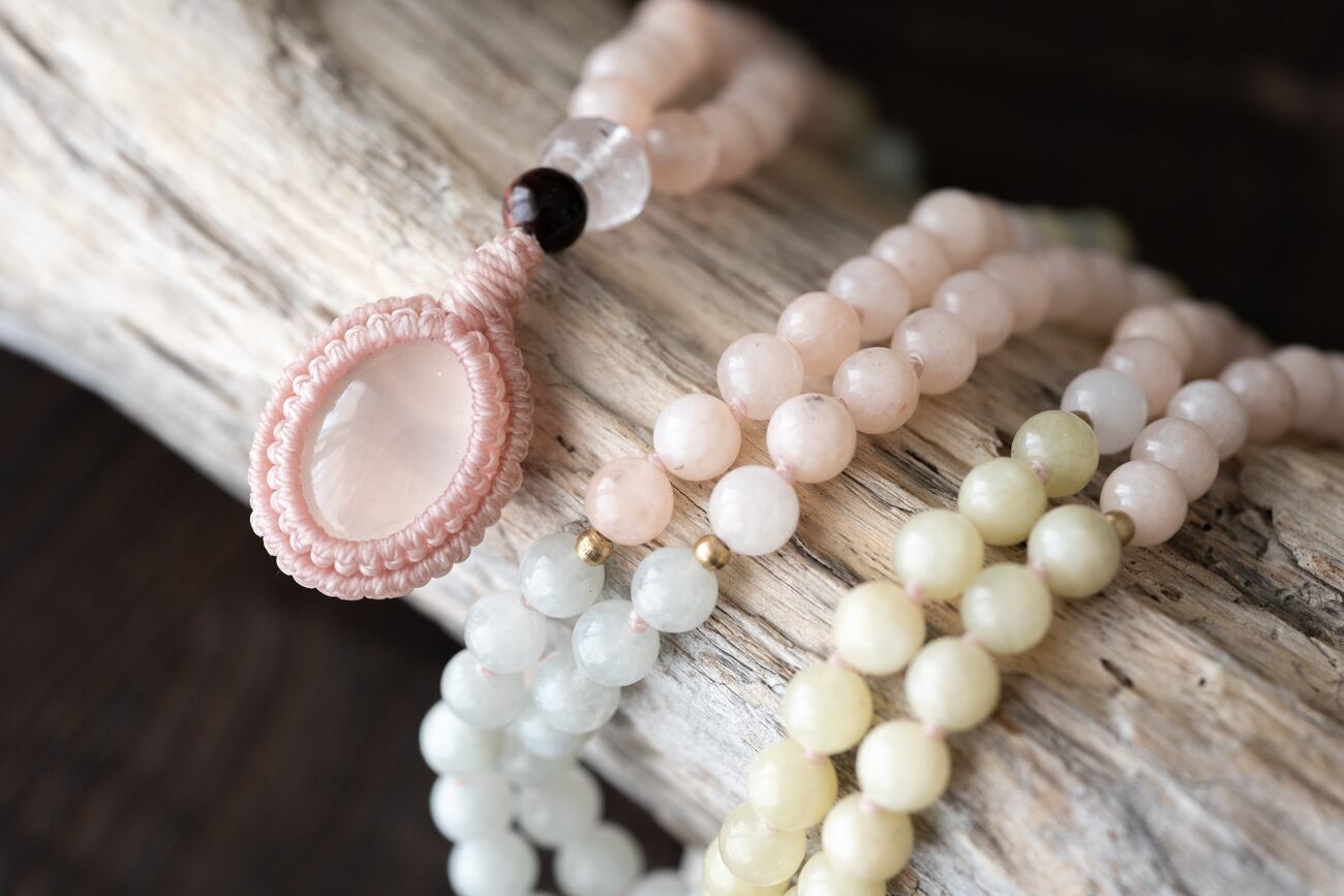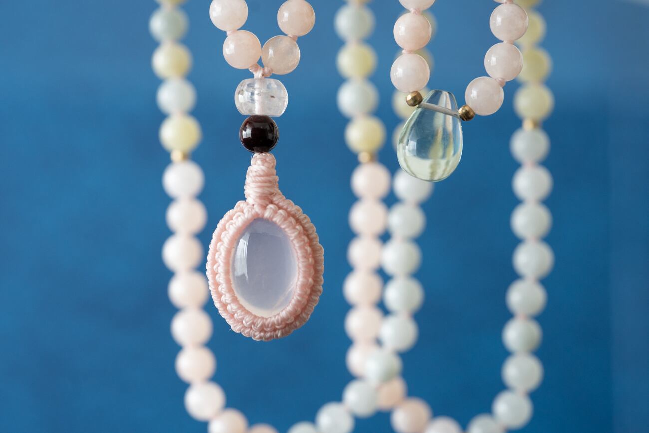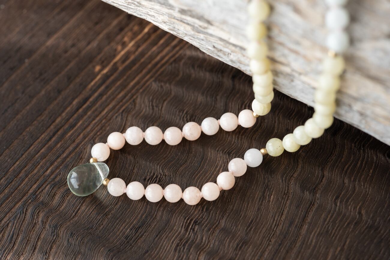 モルガナイトをはじめベリルファミリーを贅沢に繋いで作りました。パステルカラーの石たちが夢見心地にかわいいマラです。