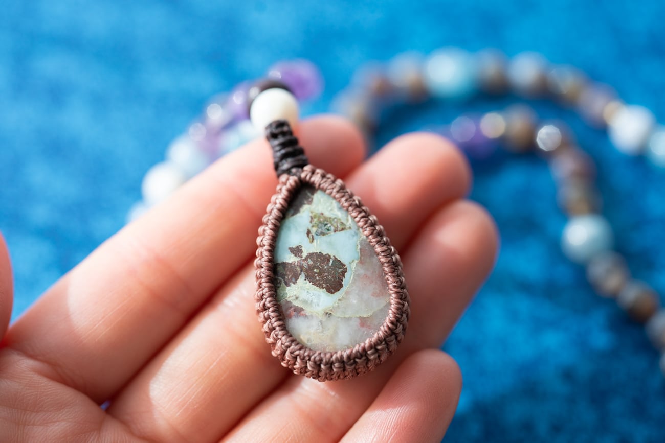トップにはモザイク画のようなデザインがユニークなラリマー。カリブ海のドミニカ共和国出身で、イルカと同じ周波数をもつといわてる癒やしの石です。