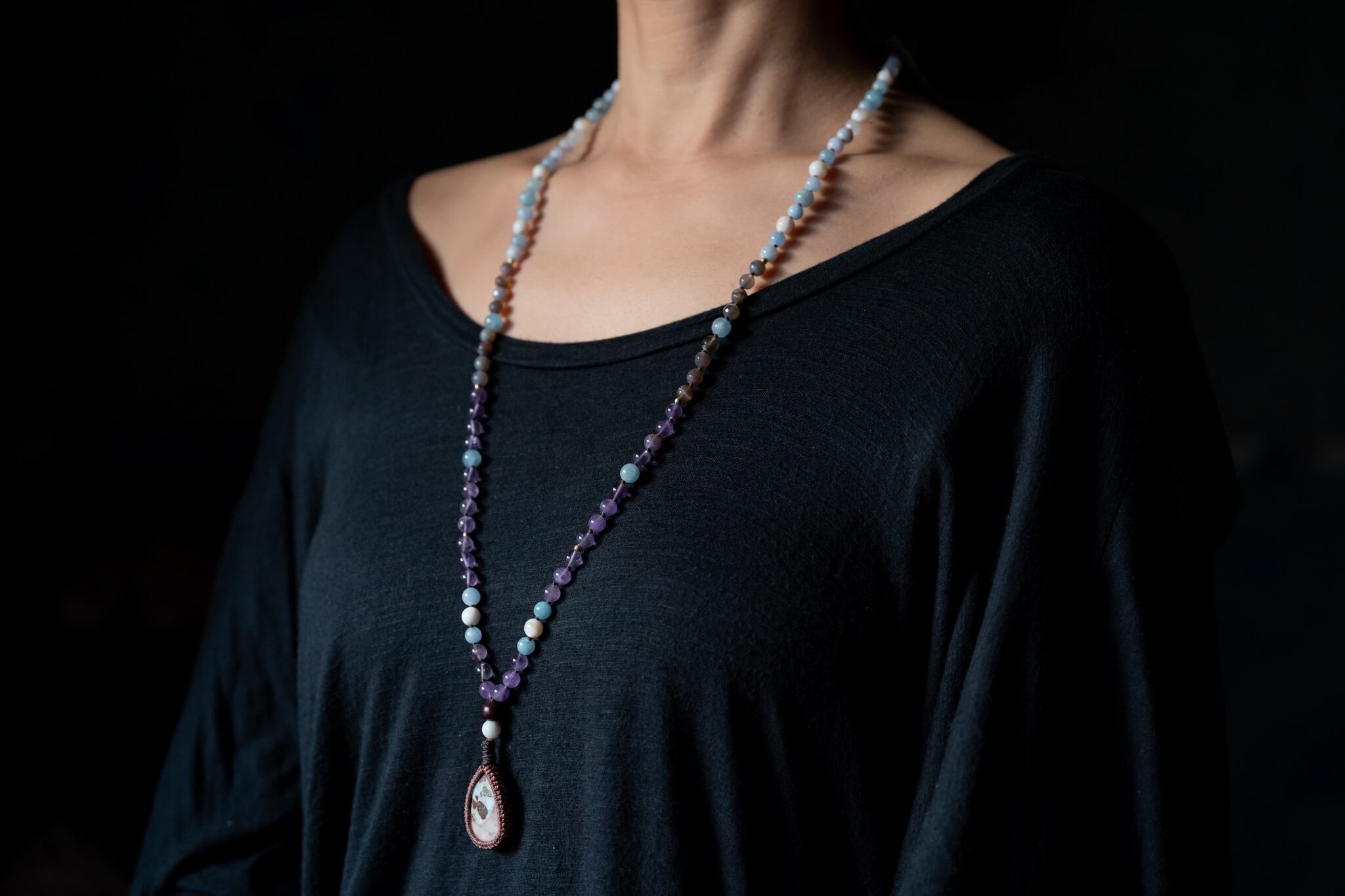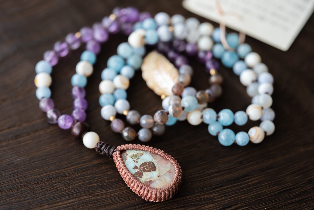 いろいろな石を使いましたが、バランスのよい落ち着いたエネルギーのマラになりました。