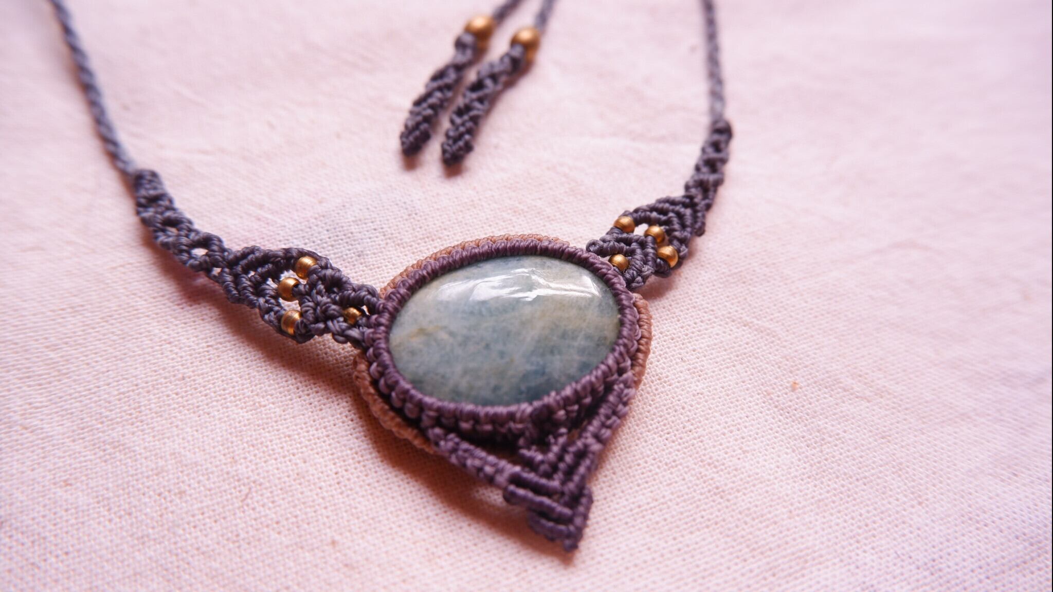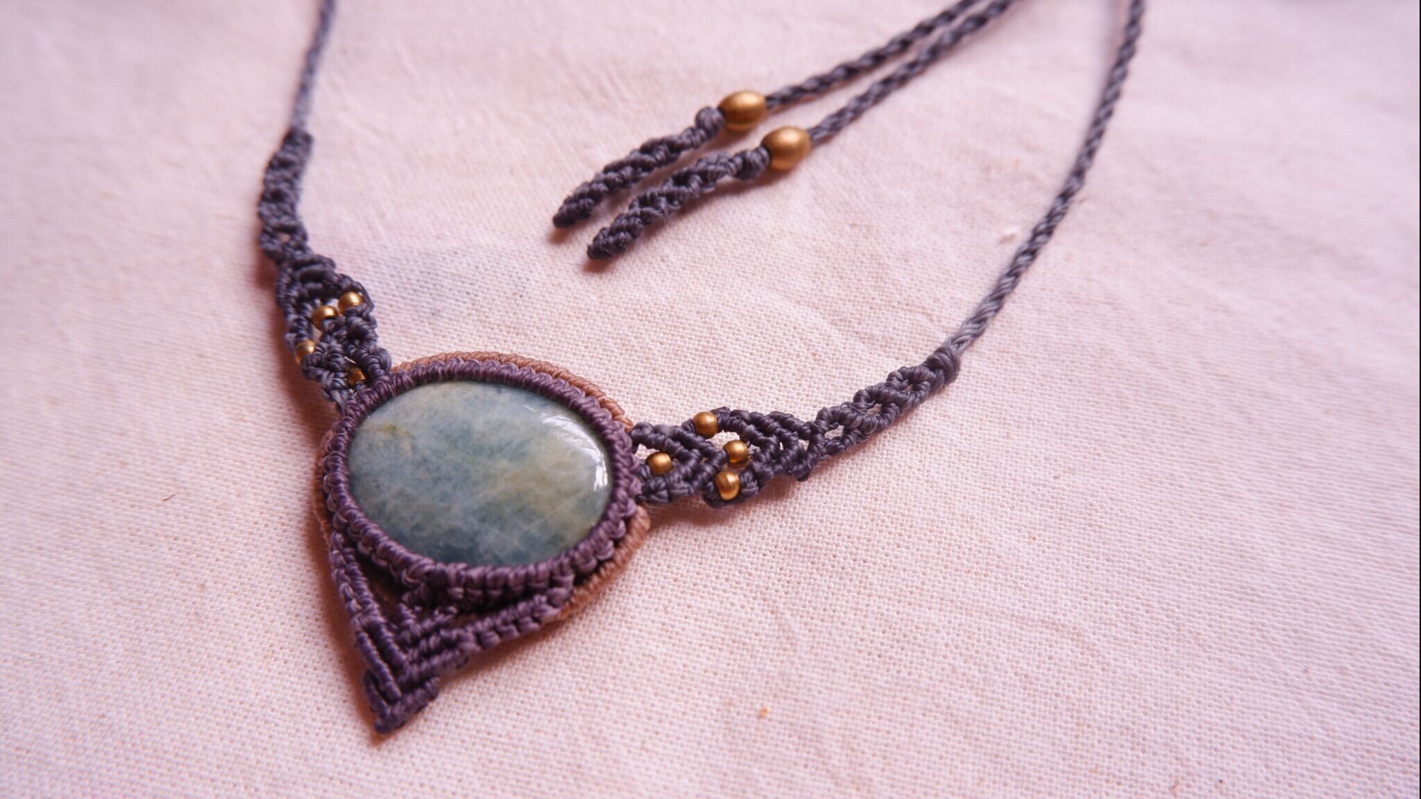 石の周りは 紫〜ブルーの糸でグラデーションを楽しみながら丁寧に編みました。