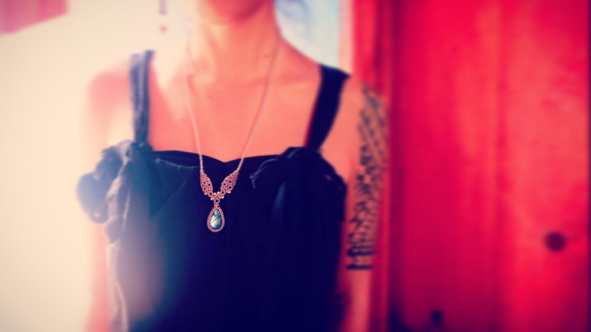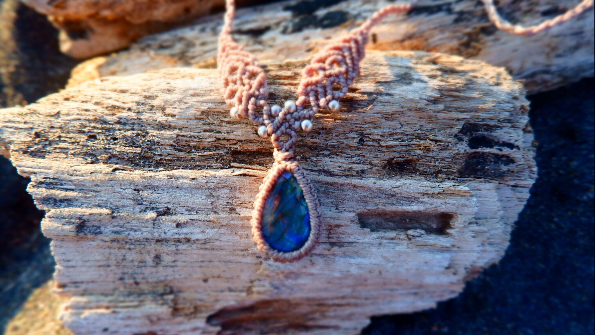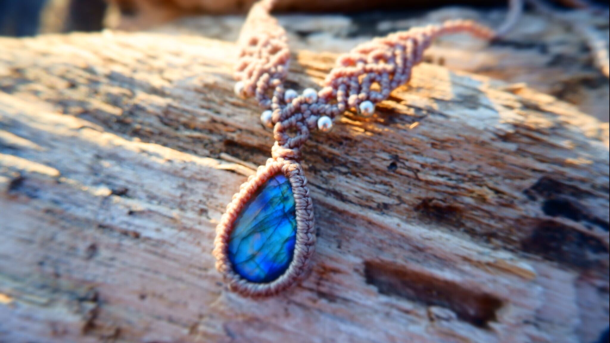 青く深い光が煌めく、ラブラドライトのネックレス。魔法の鏡のような青色がとても美しいピースです。