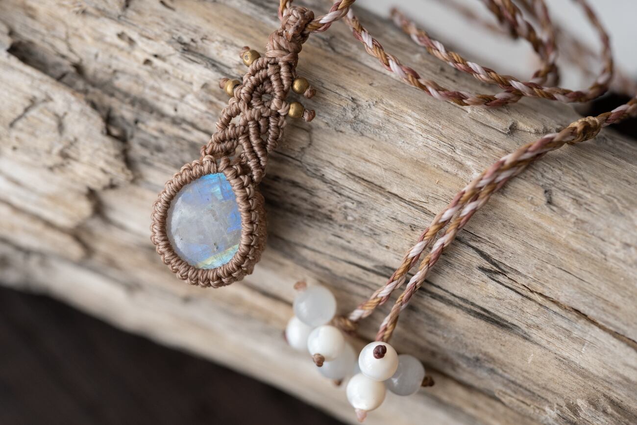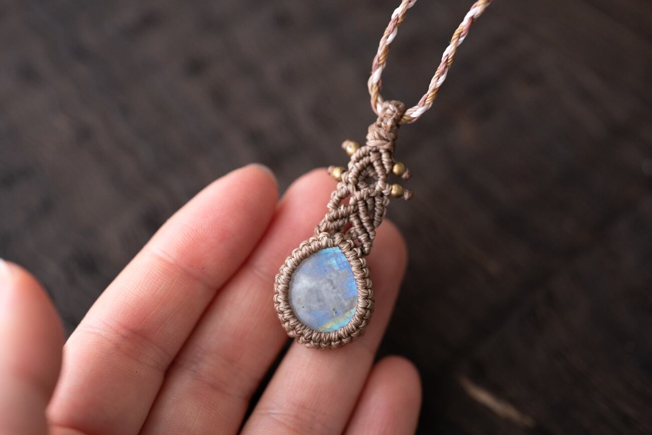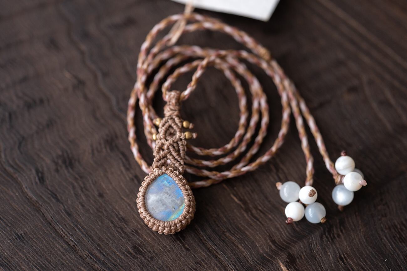エンド部分にはムーンストーンとマザーオブパールのビーズを使用しています。