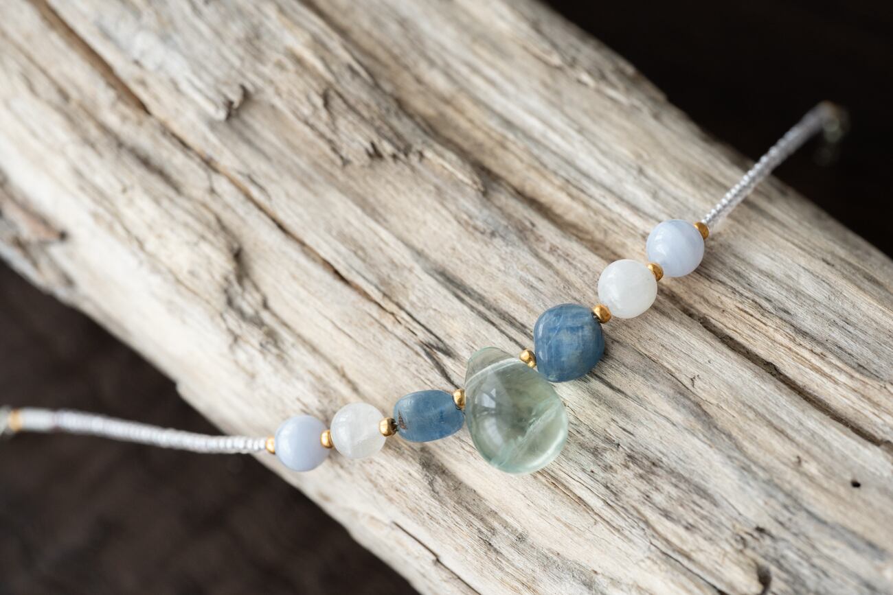 ふっくらと立体的なグリーンフローライトのビーズを中心に、カイヤナイト、ムーンストーン、ブルーレースアゲートをつないでさわやかなイメージで繋ぎました。