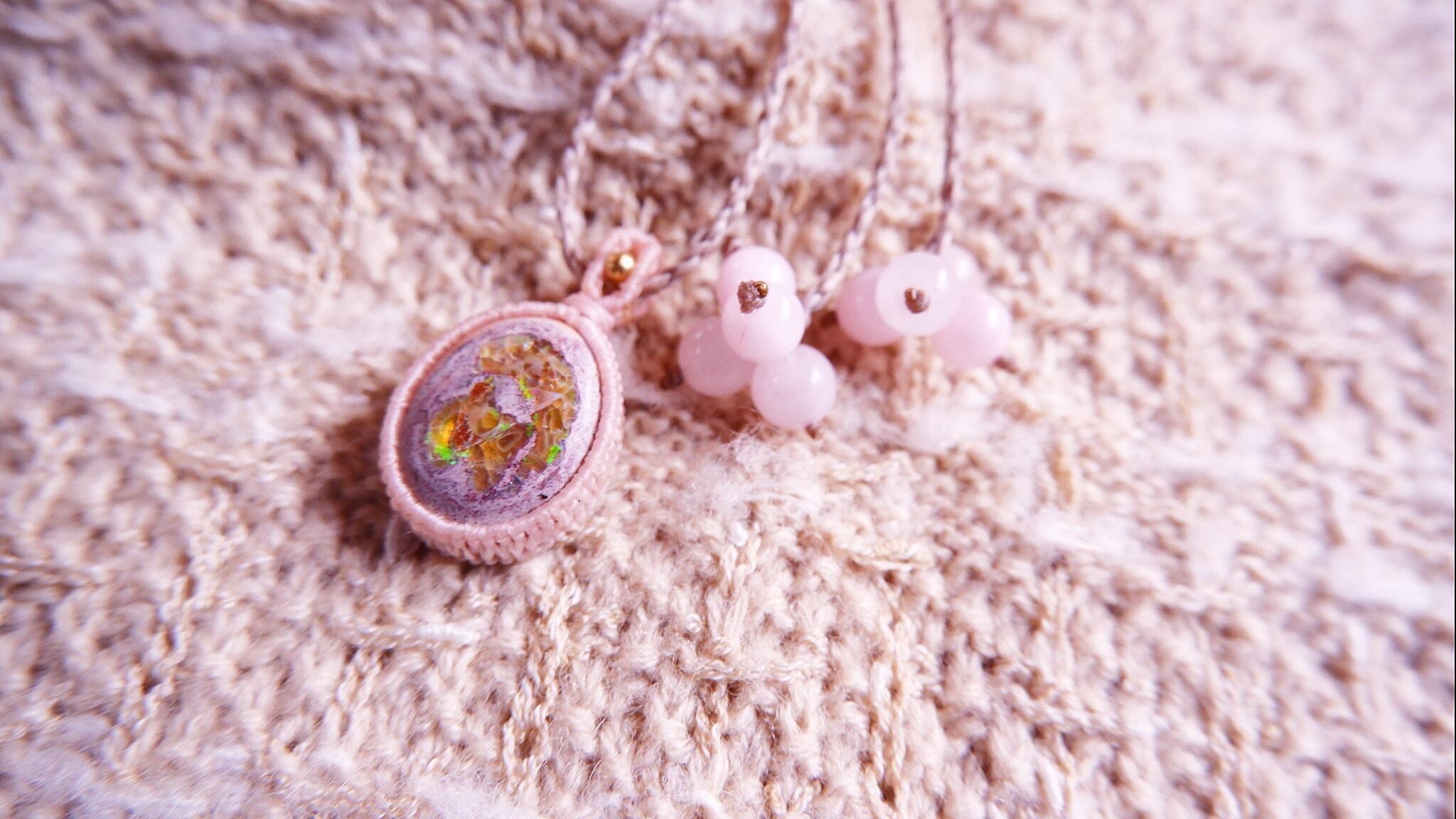 エンド部分にはローズクォーツビーズを組み合わせました。