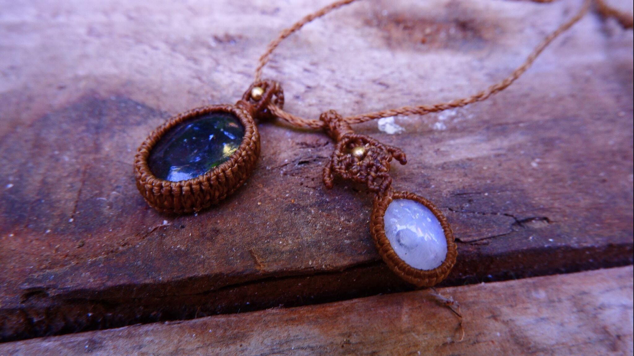 ふたつの石を組み合わせてネックレスに編み上げました。
