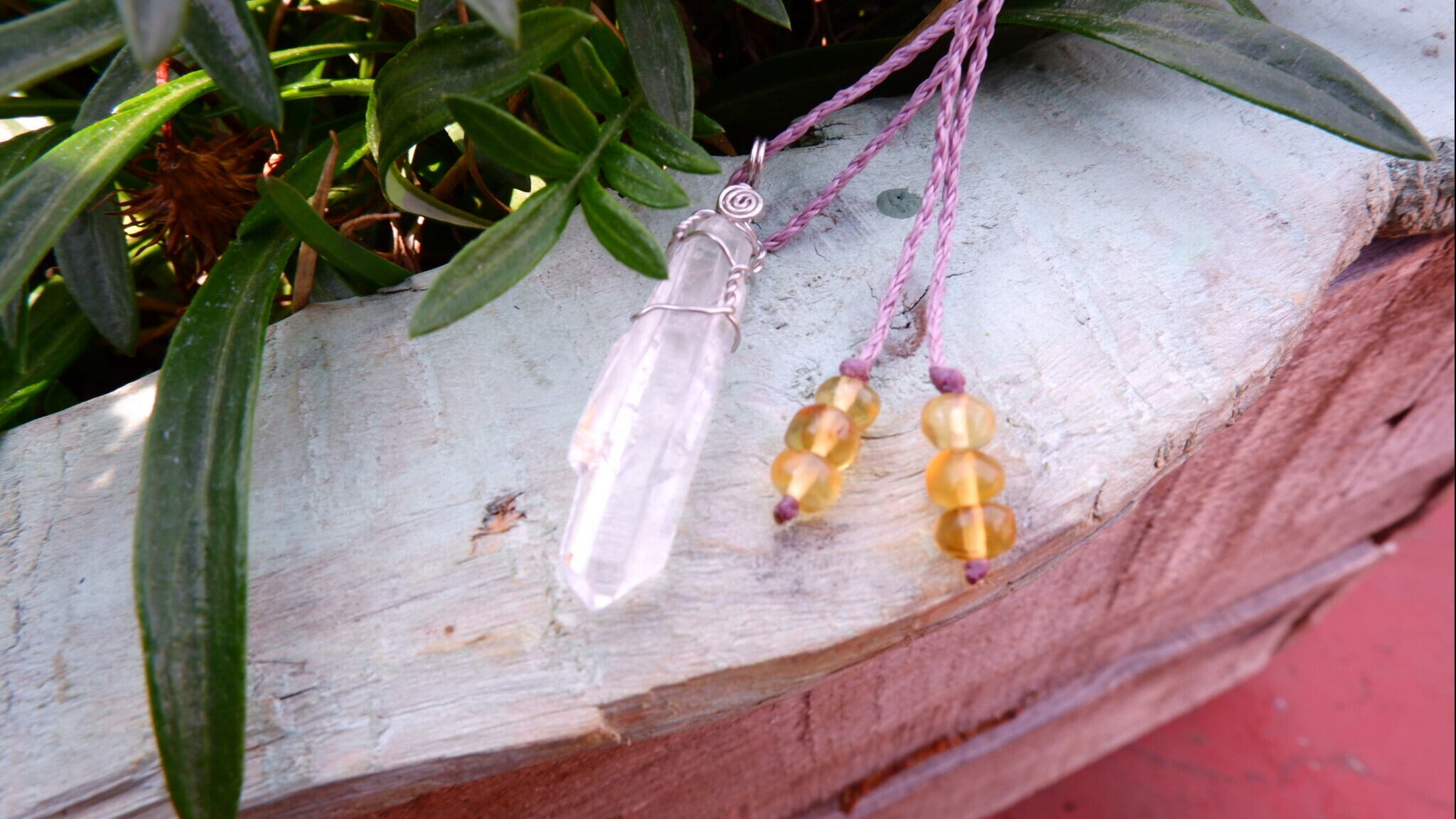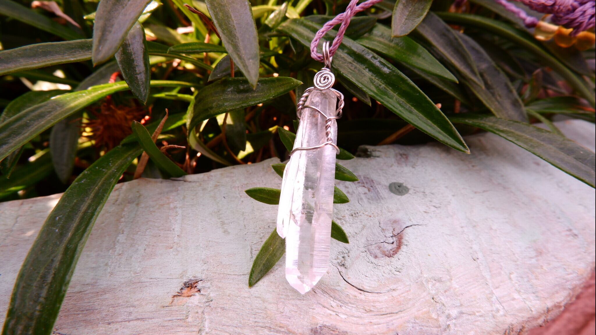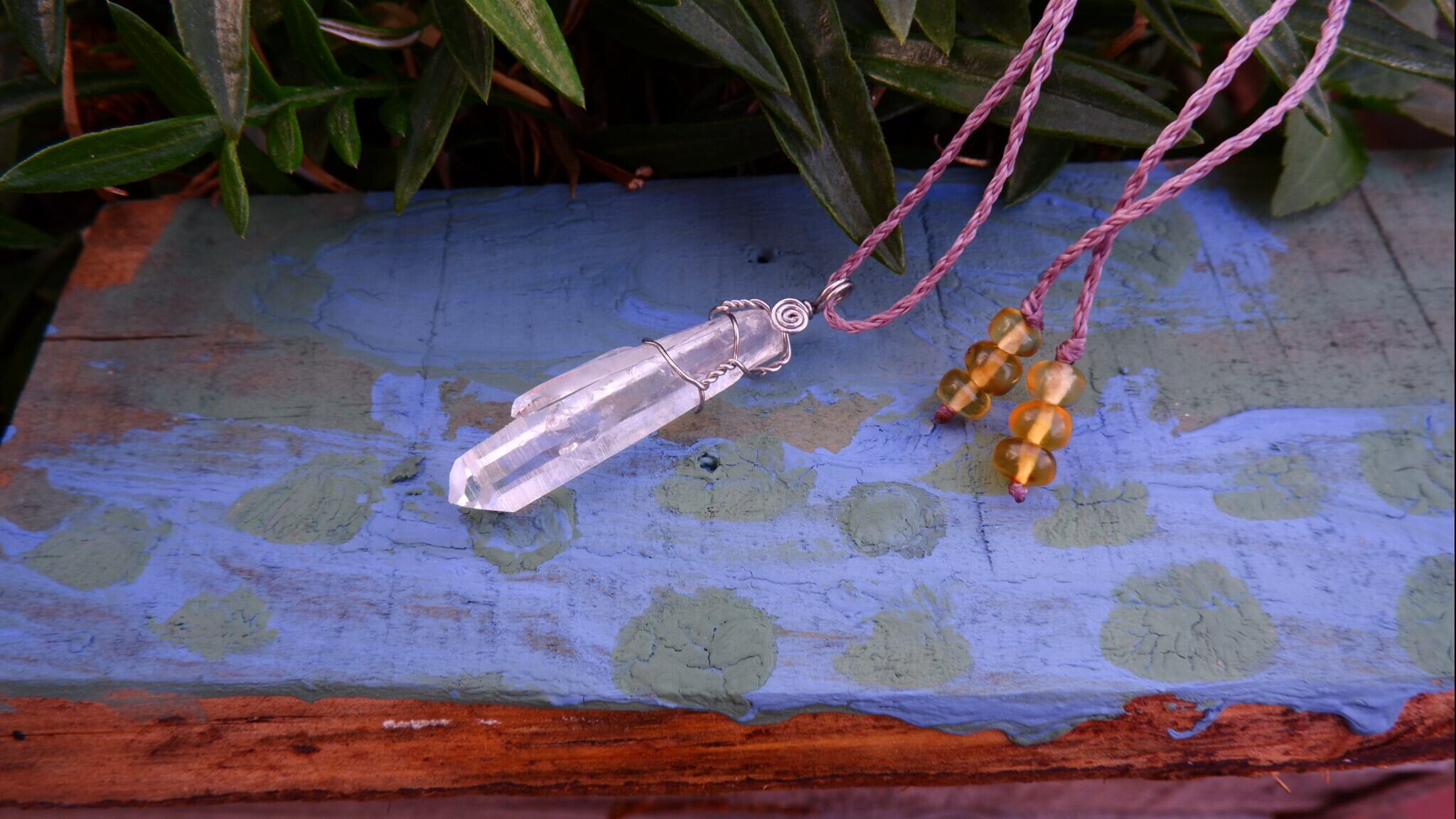 透明度が高く、ポイントの形も美しい、高品質の水晶を、ワイヤーアートでペンダントトップに仕立て、0.5mmの極細ワックスコードでネックレス紐を編ました。