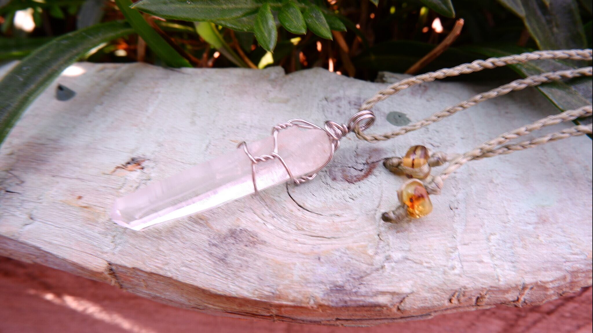 透明度が高く、ポイントの形も美しい、高品質の水晶を、ワイヤーアートでペンダントトップに仕立て、0.5mmの極細ワックスコードでネックレス紐を編ました。