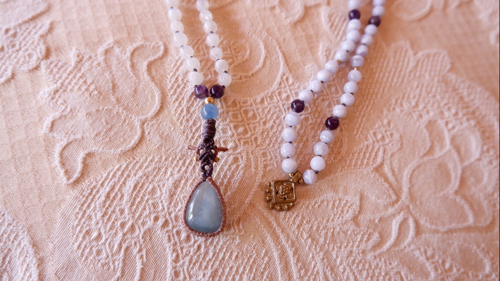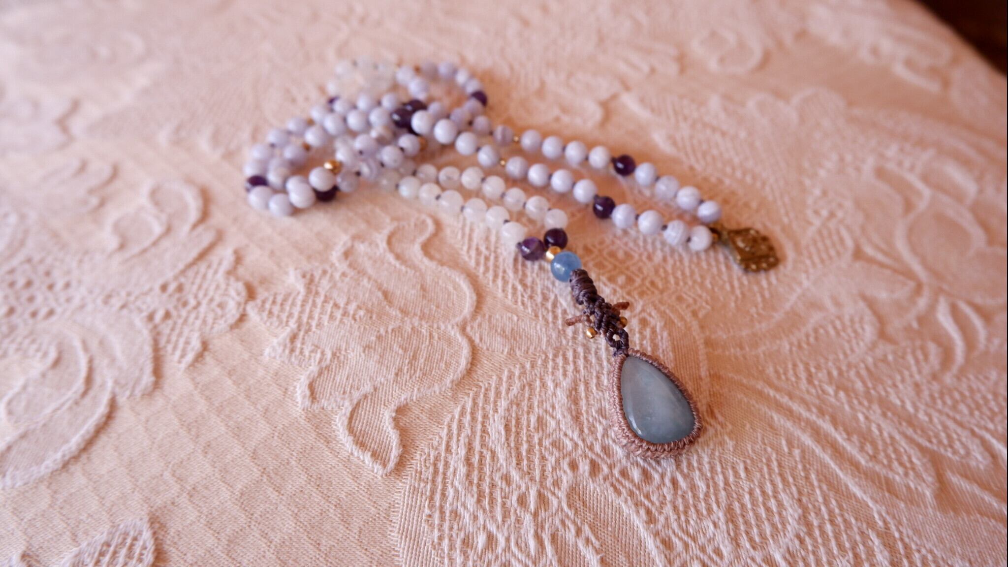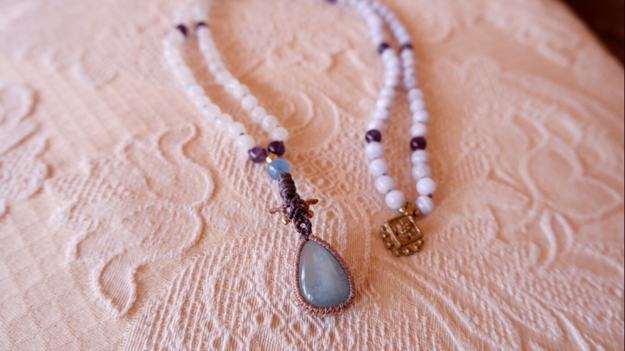 ビーズたちはパステルブルーに繊細に編まれたレースのような模様の広がる少女のようなブルーレースアゲート、角度によって青い光がキラキラ輝く愛の石、ムーンストーン、高貴な美しさを備えるアメティストを、グルビーズには大粒のアクアマリンビーズを選び、フェミニンな石たちが集まりました。