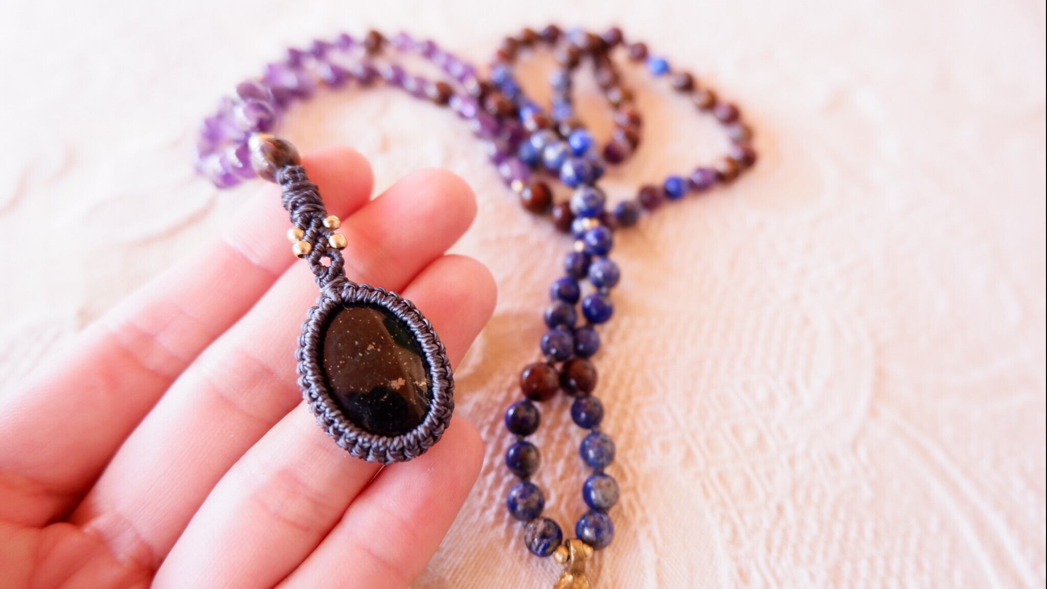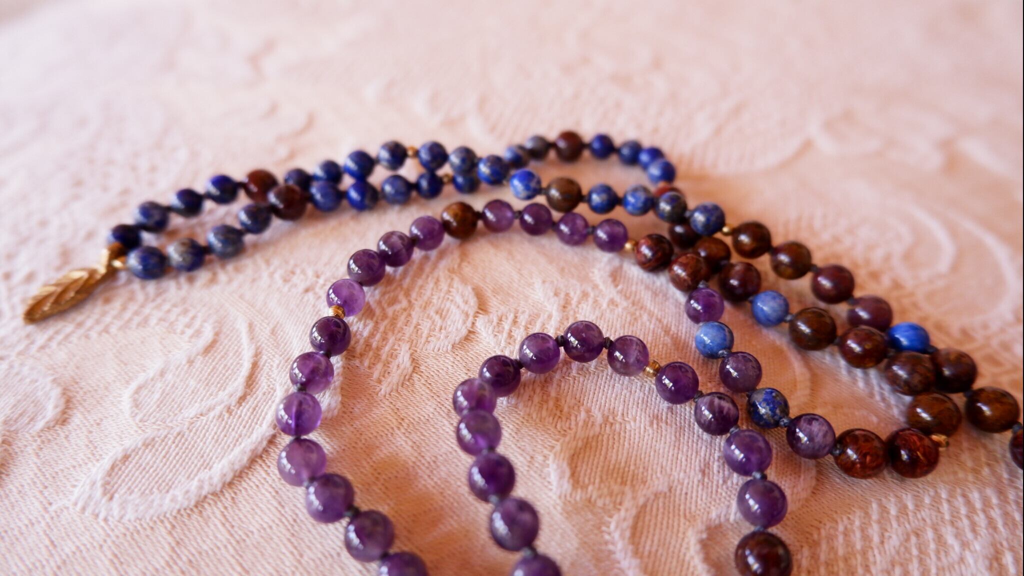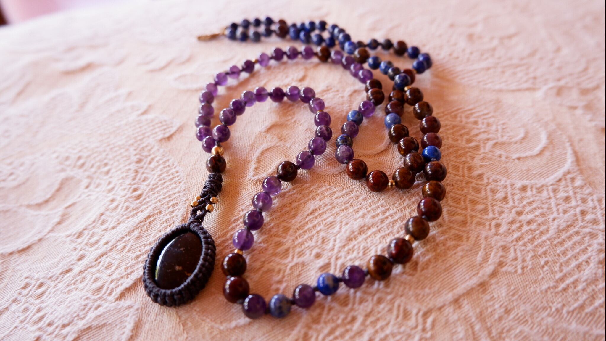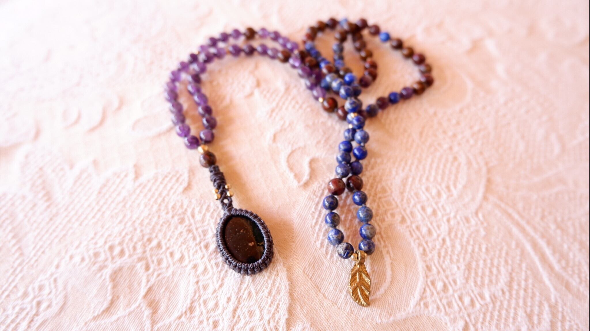 ラピスラズリ、アメティスト、ピータサイトをつないで、神秘的なエネルギー、宇宙と繋がるようなマラになりました。