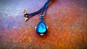 ドロップ型のラブラドライトで小ぶりのネックレスを仕立てました。一面に青色〜水色〜うっすらと金色が輝く美しいこです。バランスよい形も素晴らしい。
