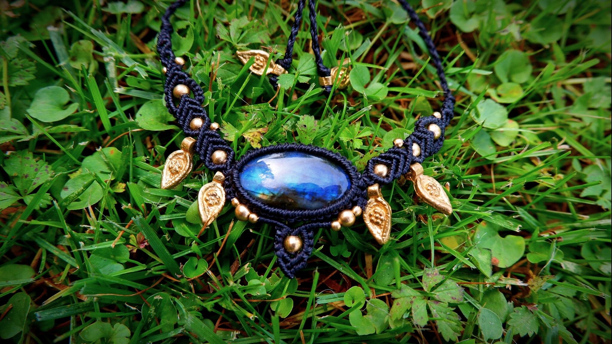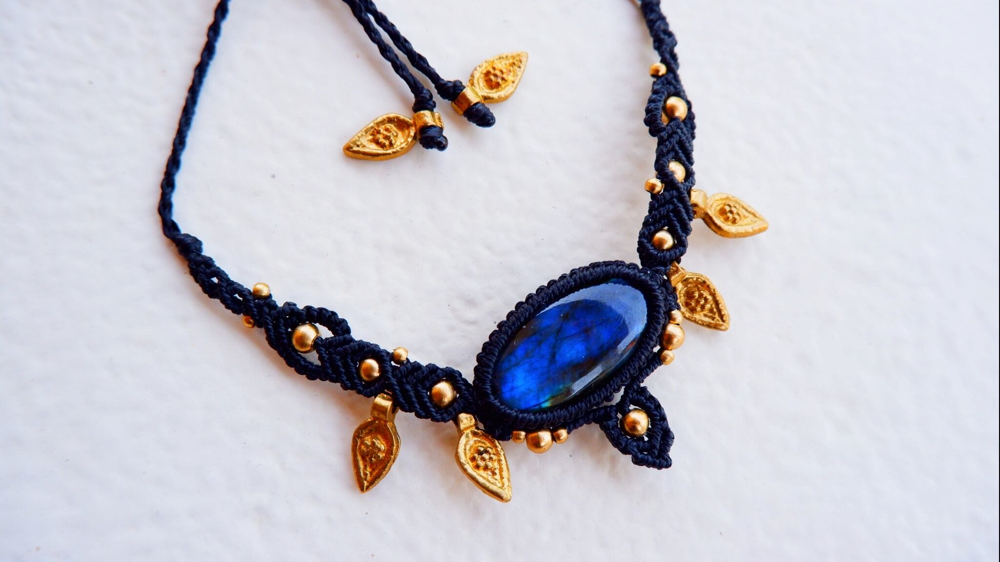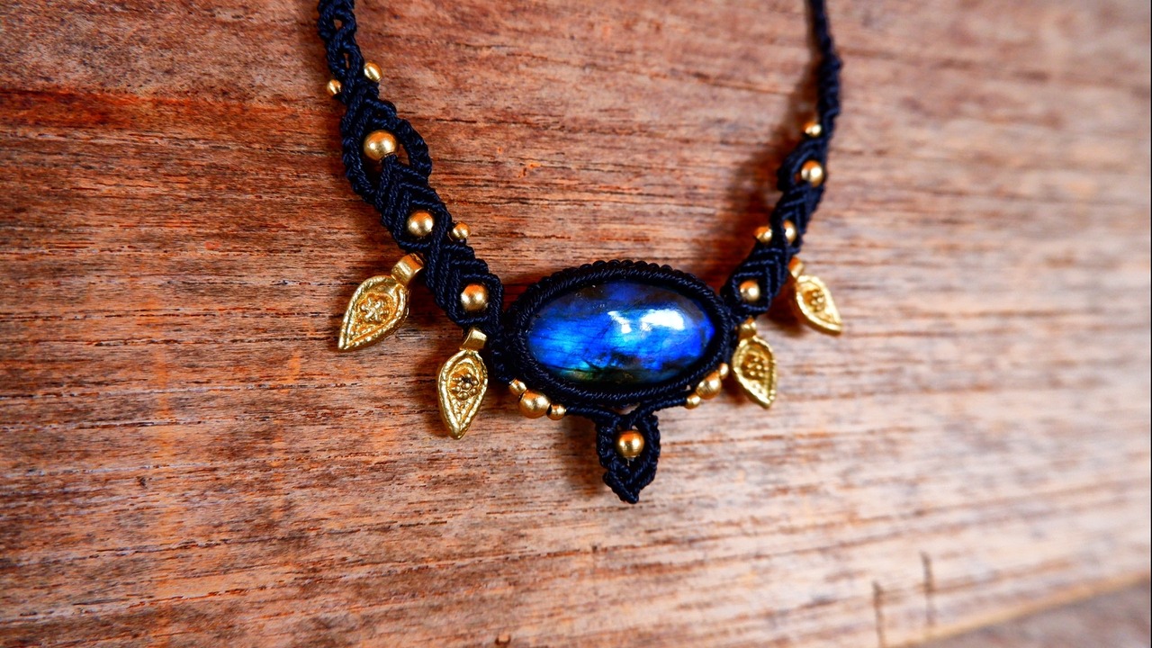 黒色のシックな紐と、金色の真鍮ビーズ、深い青色のラブラドライトの組み合わせが美しいなあと思いながら編んだ作品です。