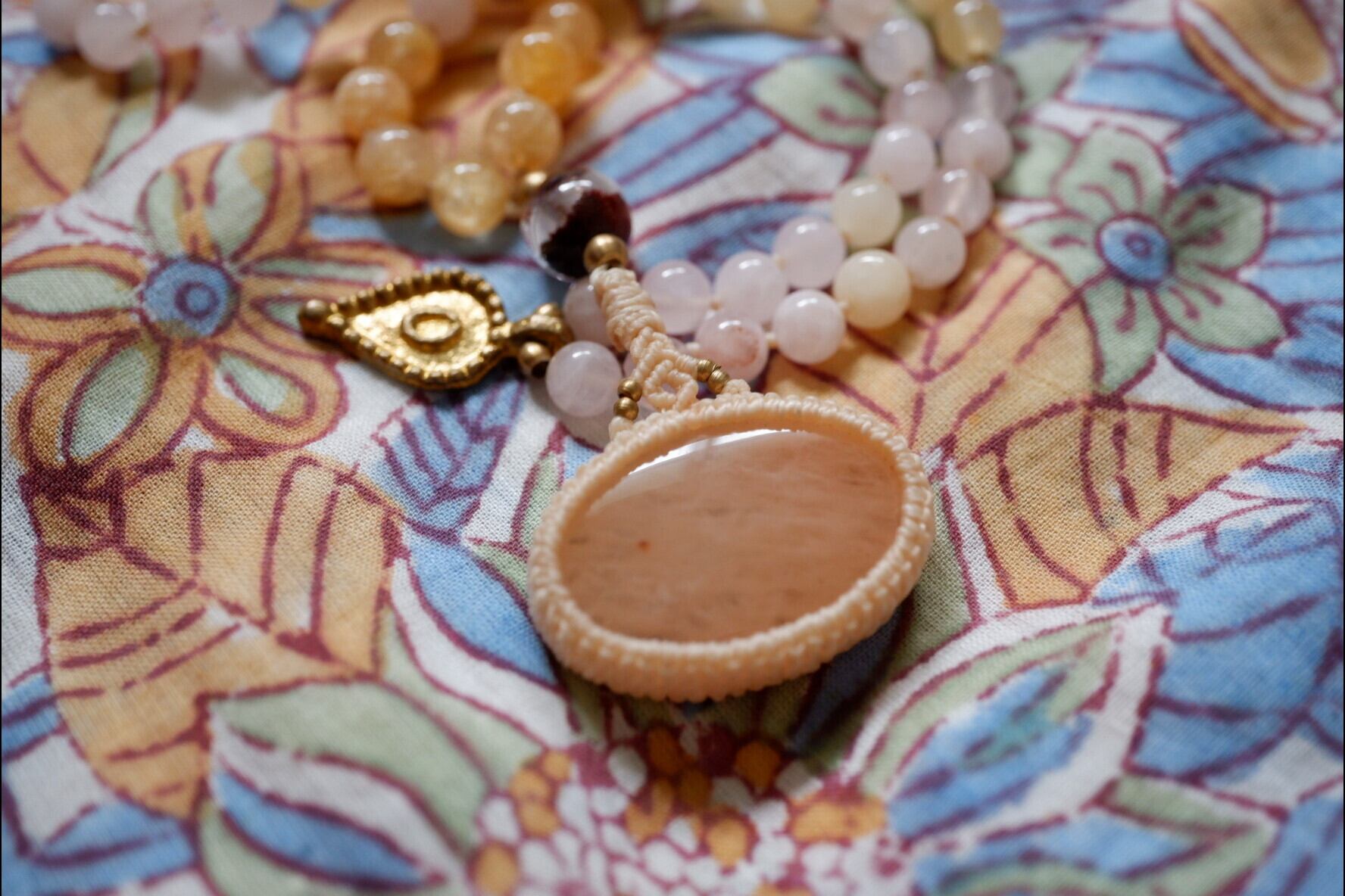元気いっぱいのオレンジ&イエローのアベンチュリンとローズクォーツを使用しており、パワフルでキュートなマラとなりました。