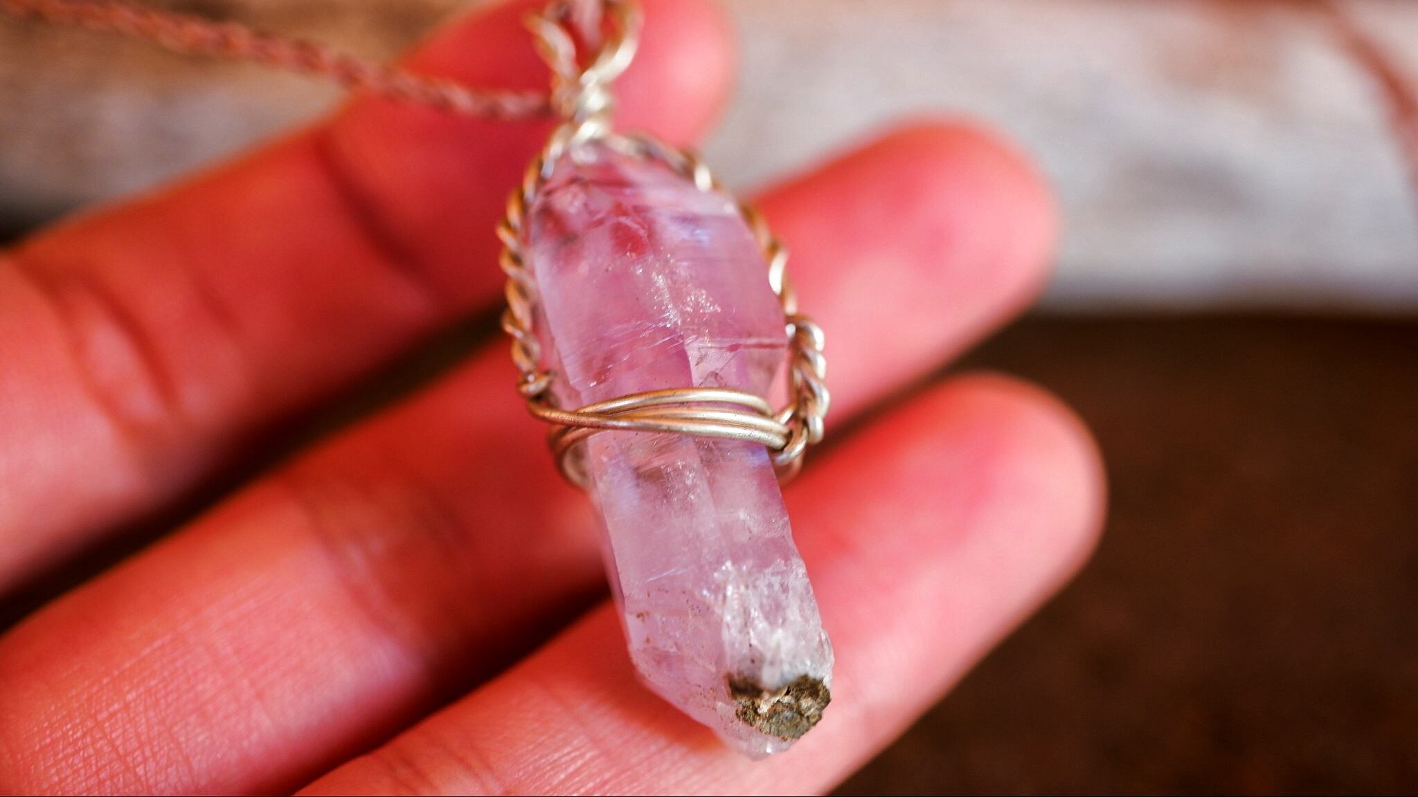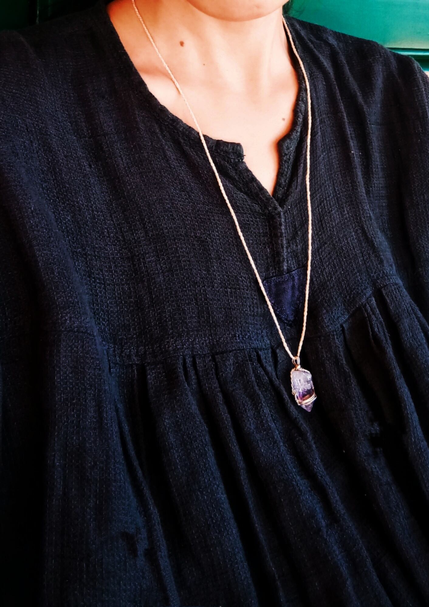 シルバー925でコーティングされたワイヤーで原石そのままのカタチでネックレスに仕立てました。
