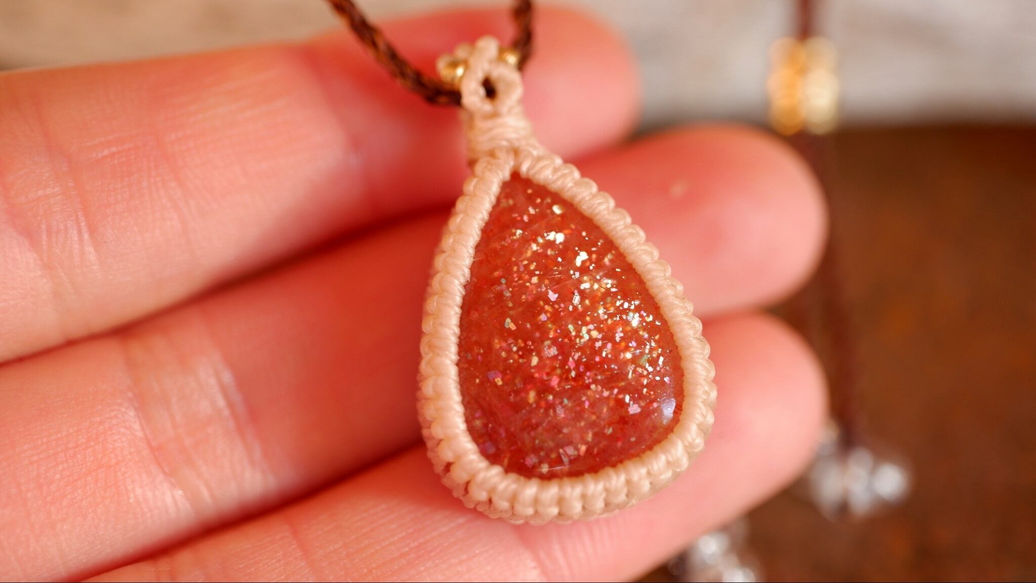 太陽のように明るく輝くサンストーン、小粒だけれどもスペシャルな存在感のあるネックレスに編み上がりました。