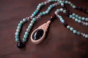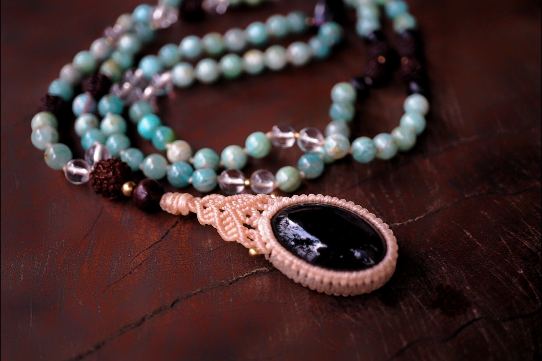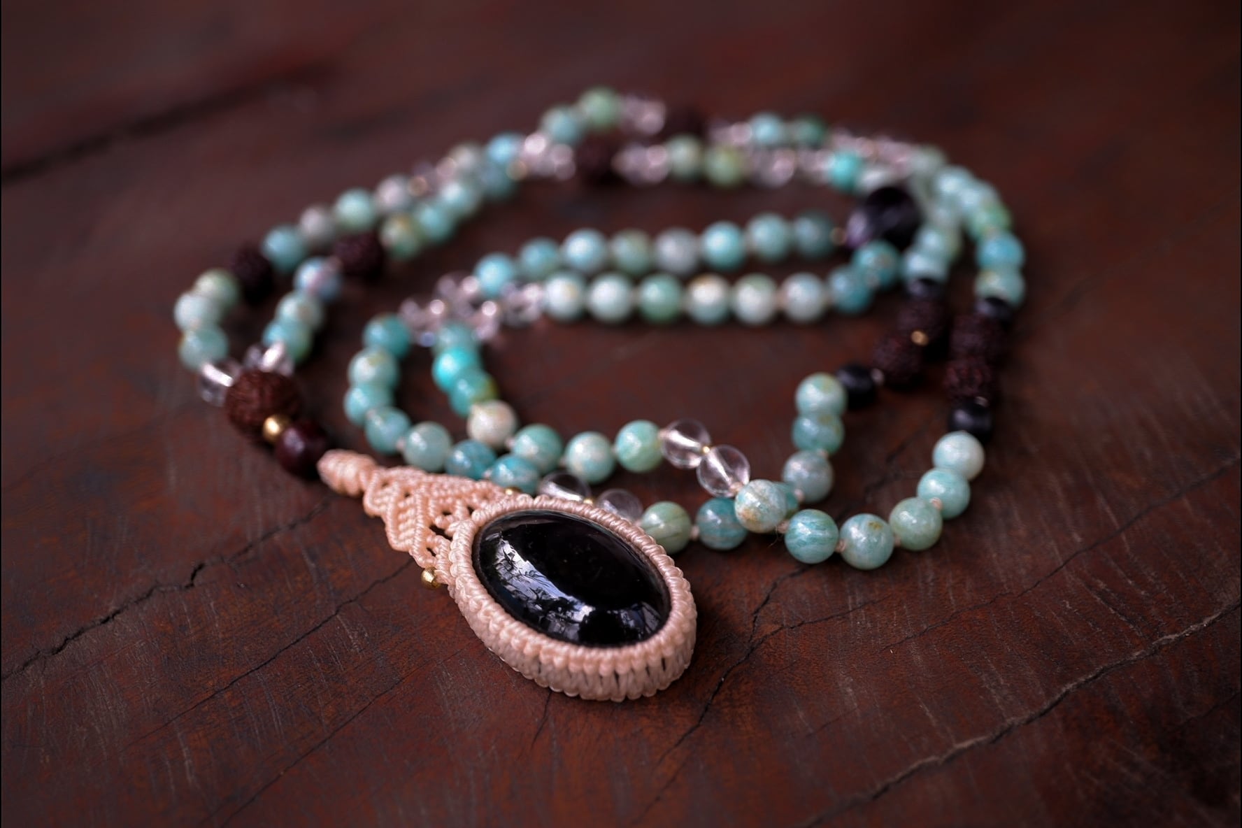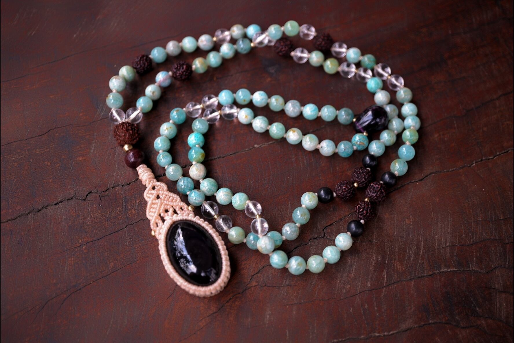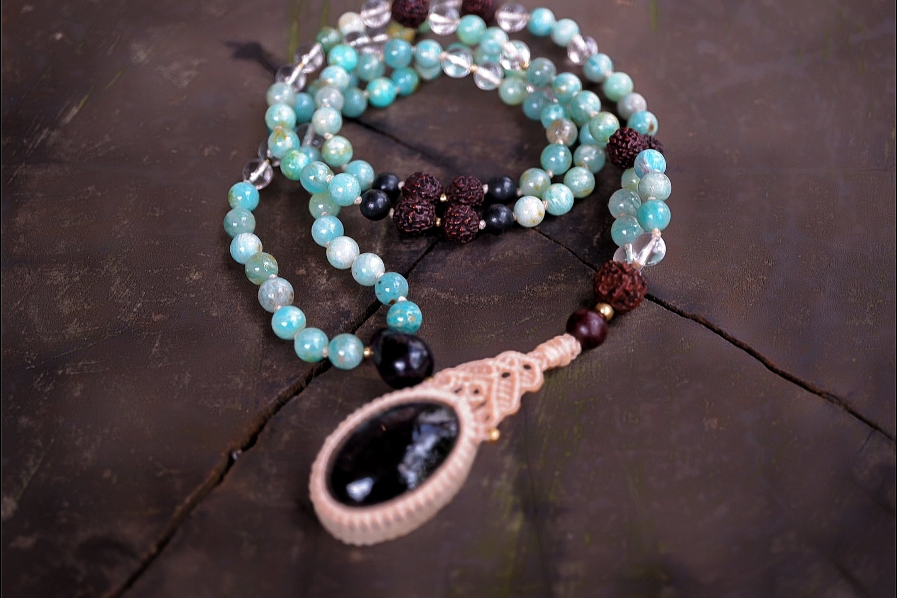 ビーズ部分:アマゾナイト、水晶、シュンガイト、ルドラクシャ