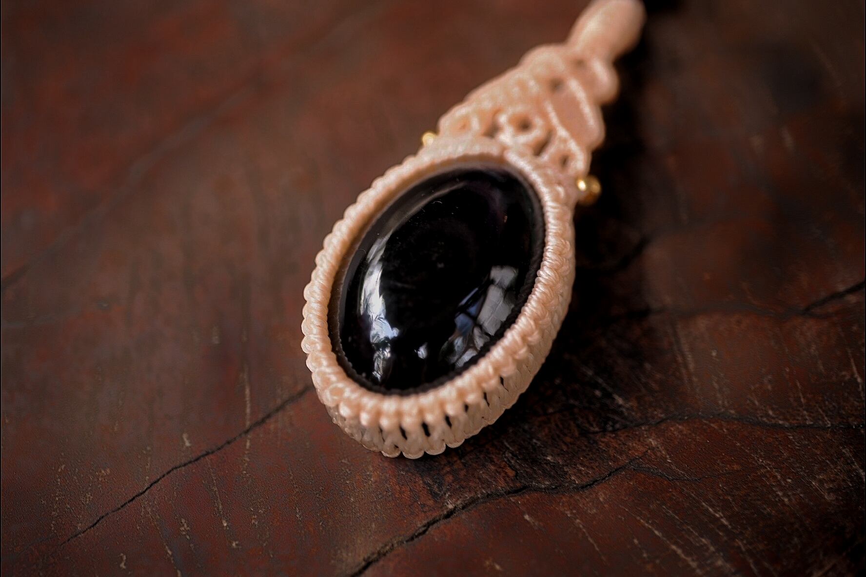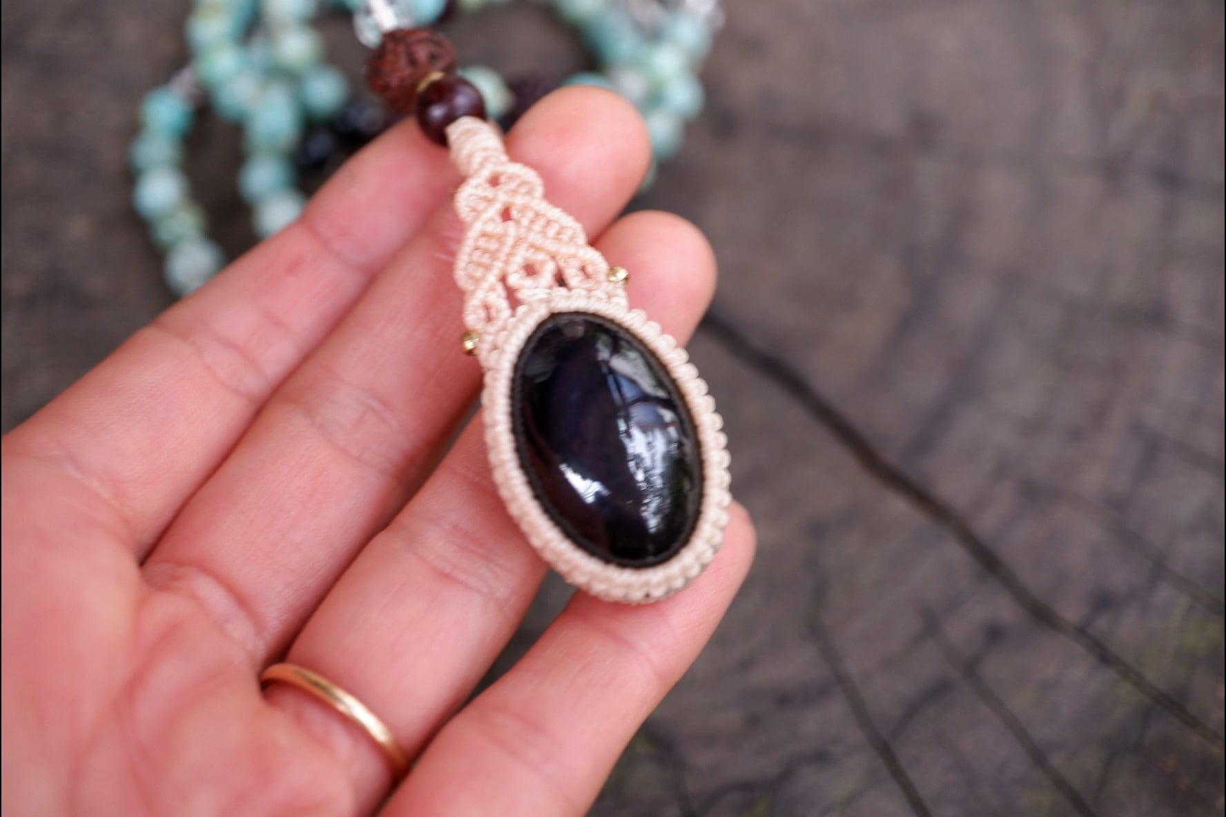 トップに選んだのは漆黒の美しいレインボーオブシディアン。