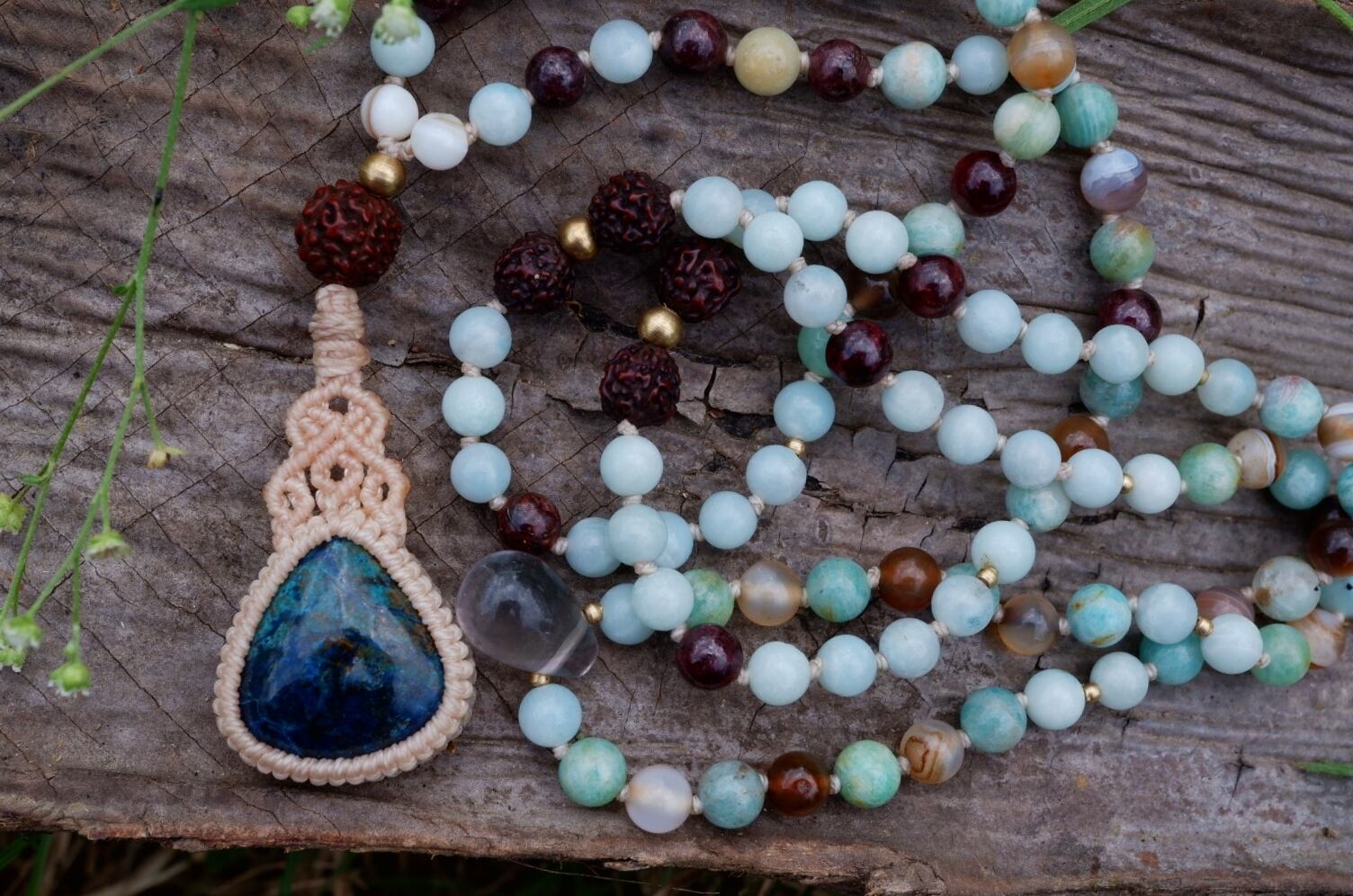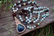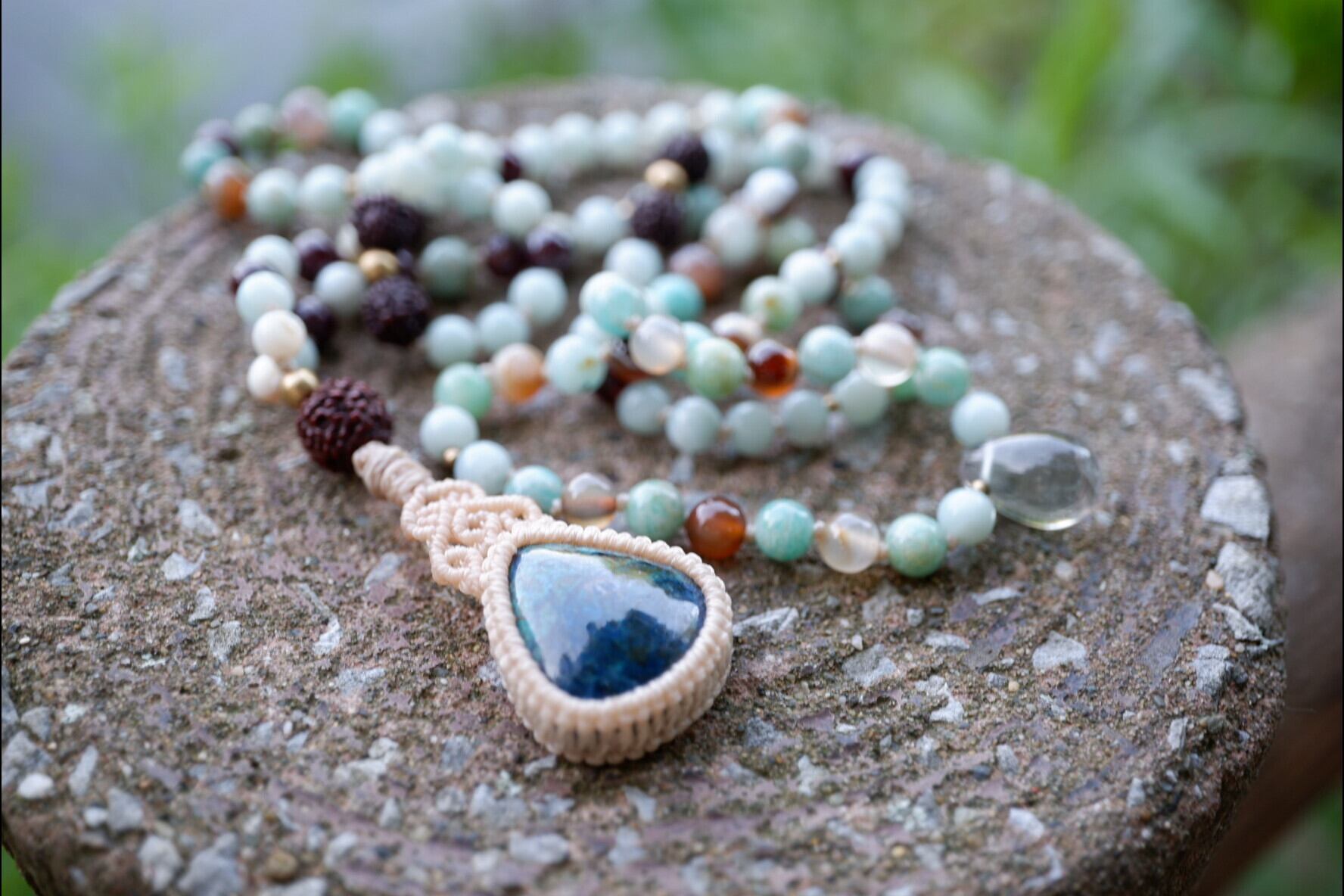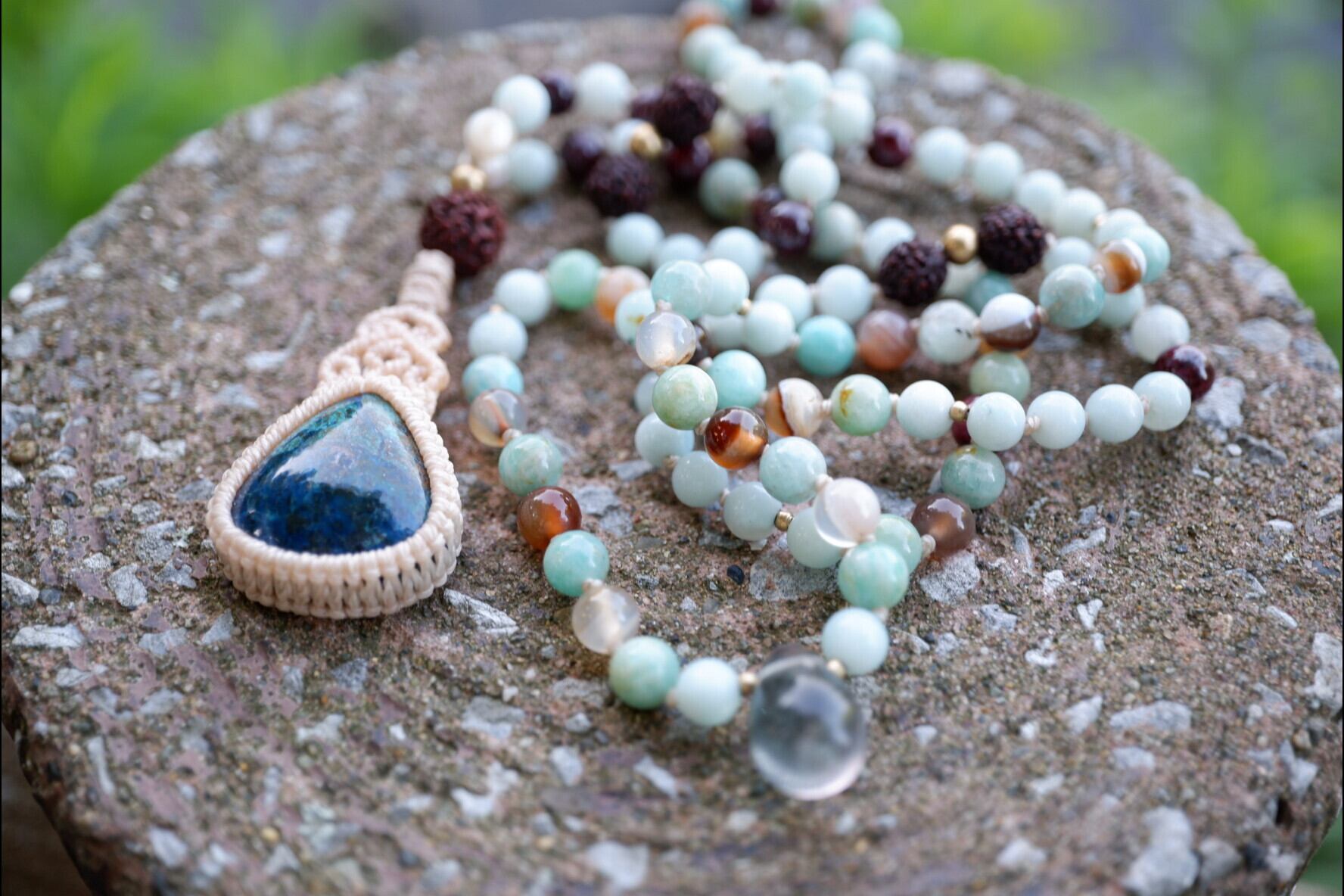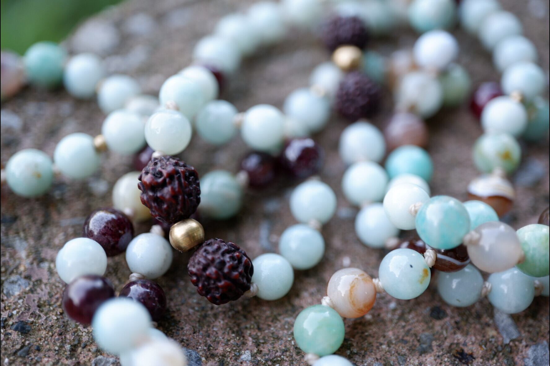 ビーズ部分:アマゾナイト、チベットアゲート、ガーネット、マザーオブパール、ルドラクシャ