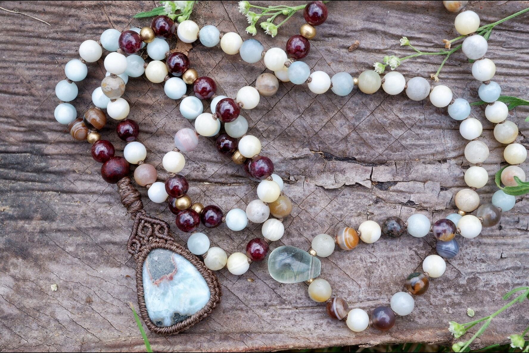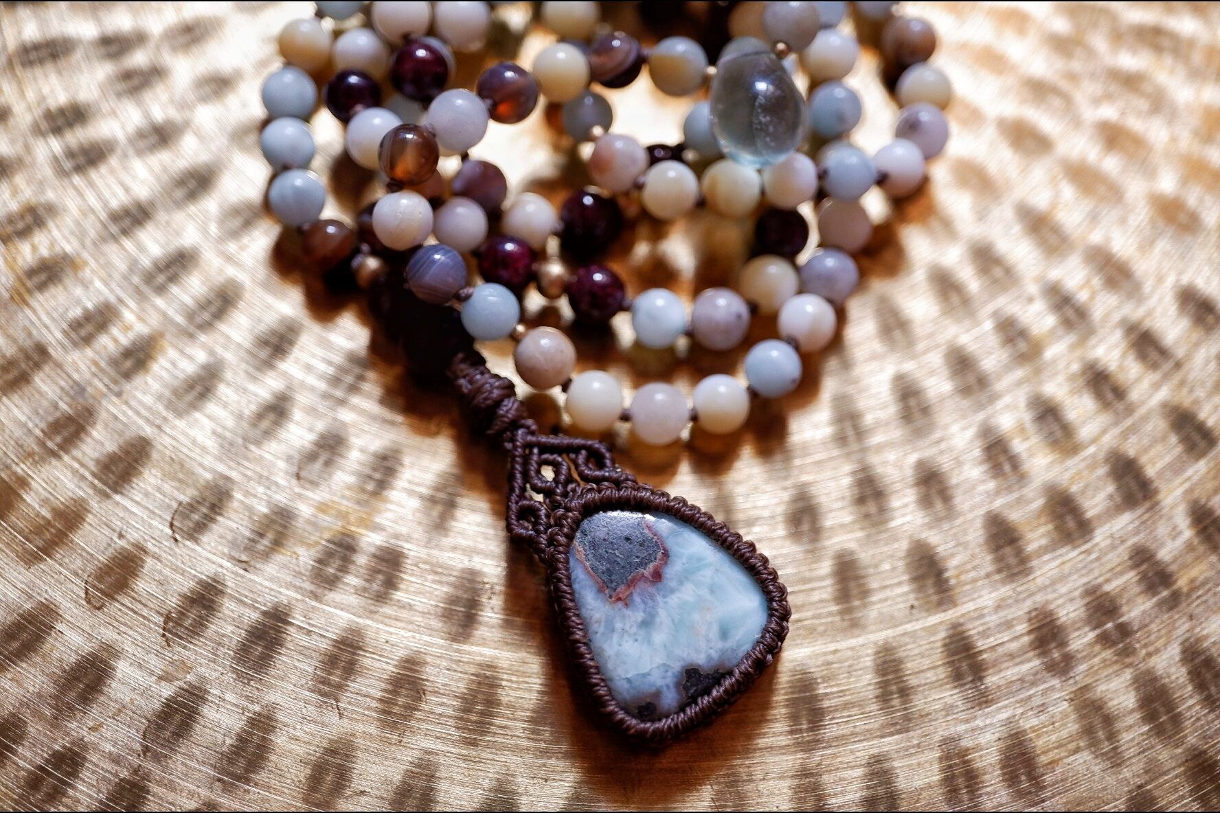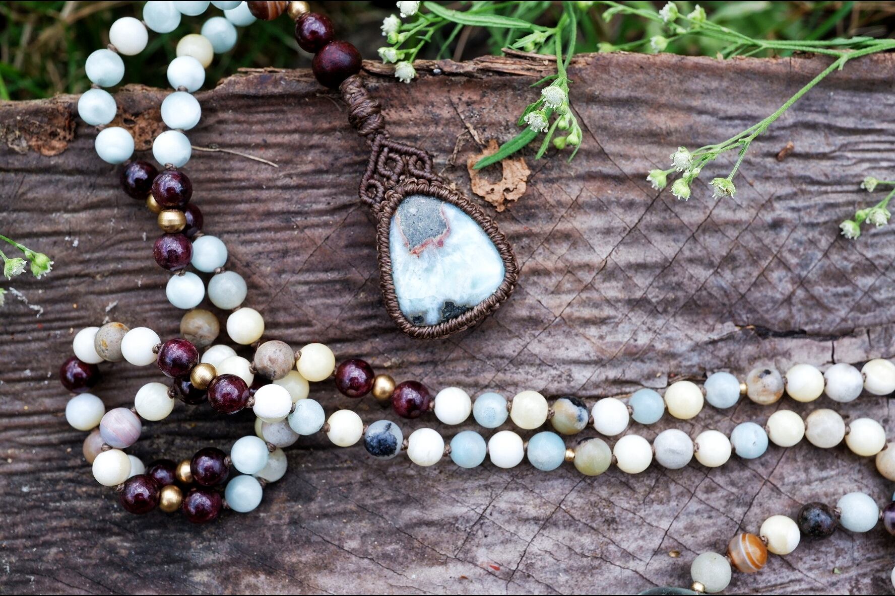 天空の石セレスタイトと、希望の石アマゾナイトと一緒につなぎ、無邪気でやさしいエネルギー、空と海で自由に遊ぶ精霊のようなイメージのマラになりました。