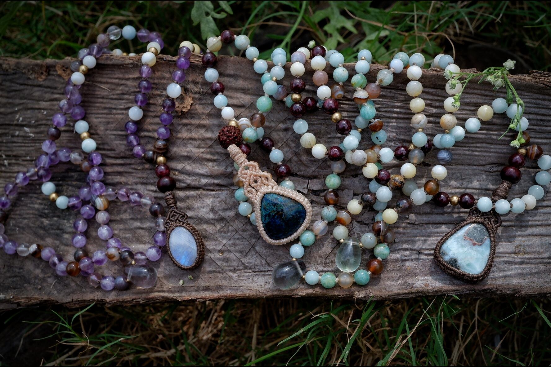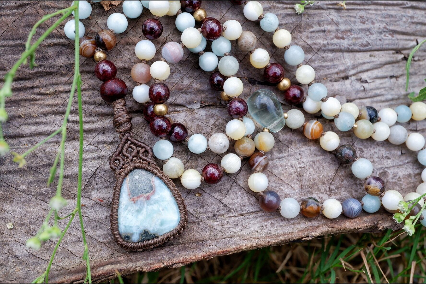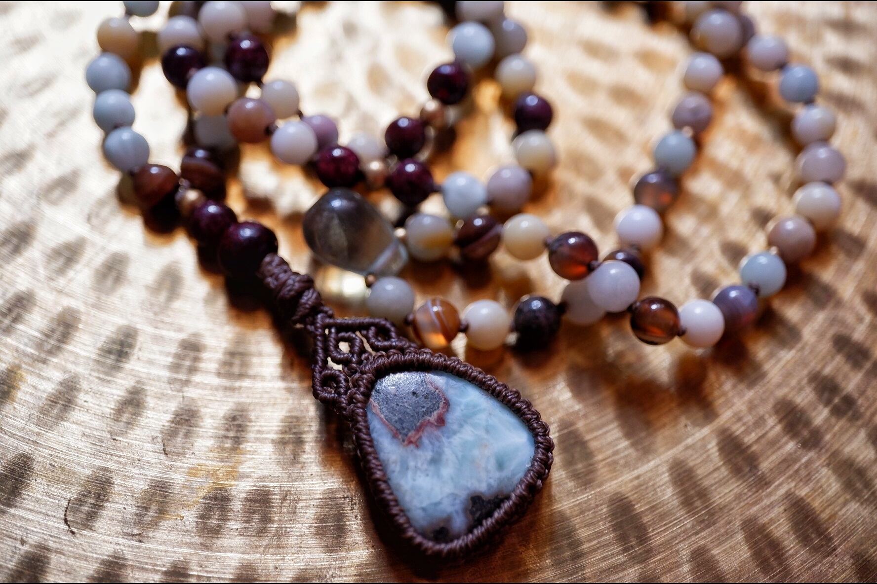 天空の石セレスタイトと、希望の石アマゾナイトと一緒につなぎ、無邪気でやさしいエネルギー、空と海で自由に遊ぶ精霊のようなイメージのマラになりました。