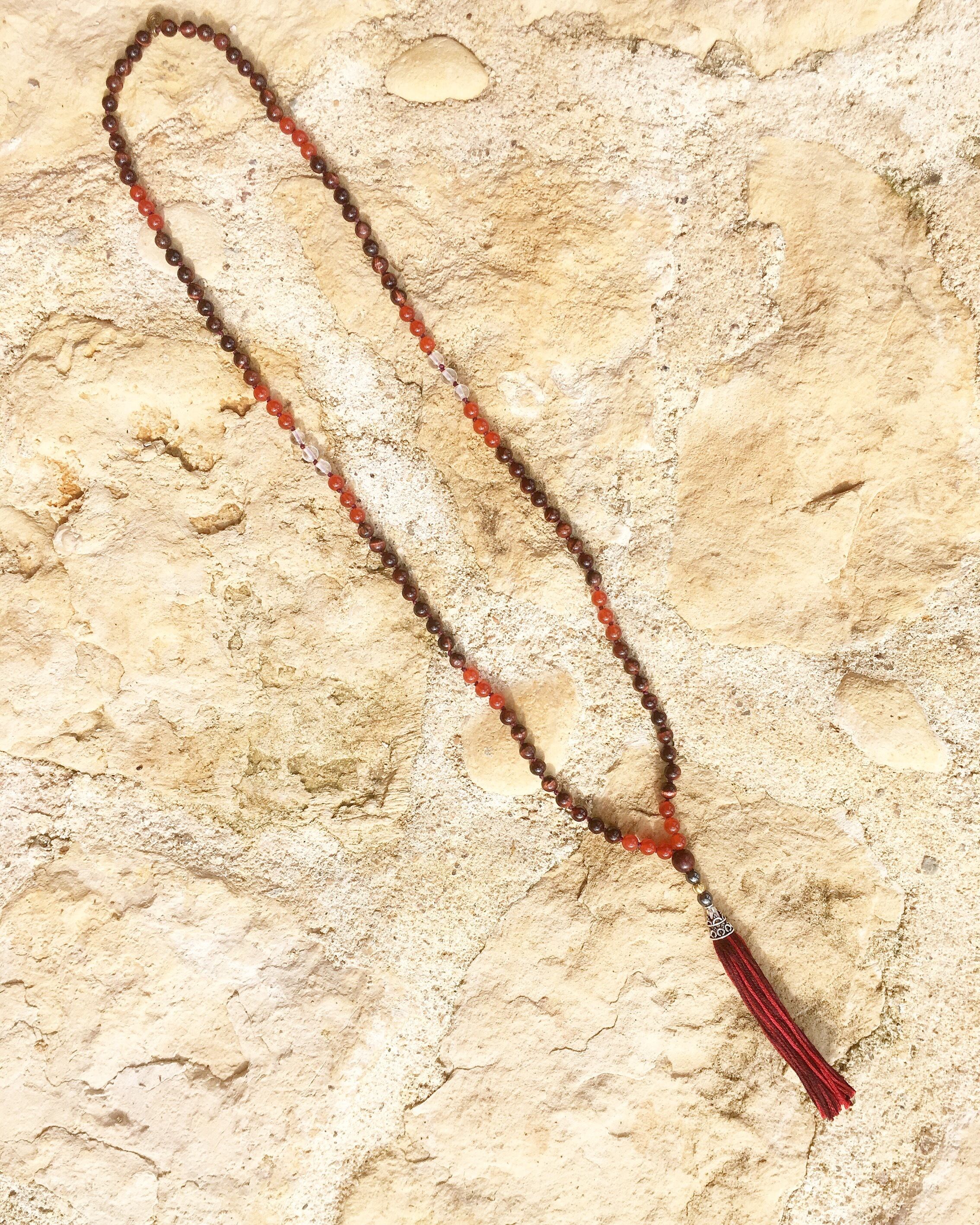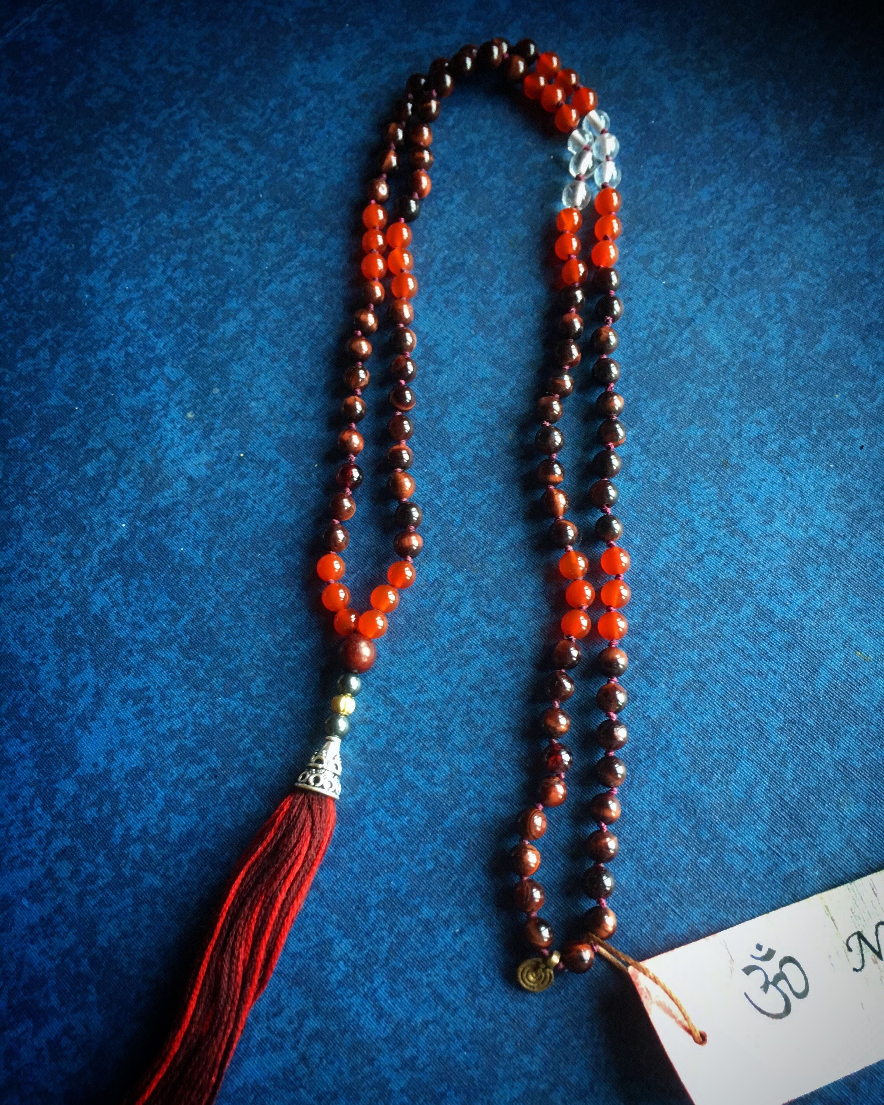 Red Tiger Eye, Red Onix, Crstal Quartz, Hematite, Red Sandal Wood, Brass Beads, 925Silver, Cotton, Wax Cord